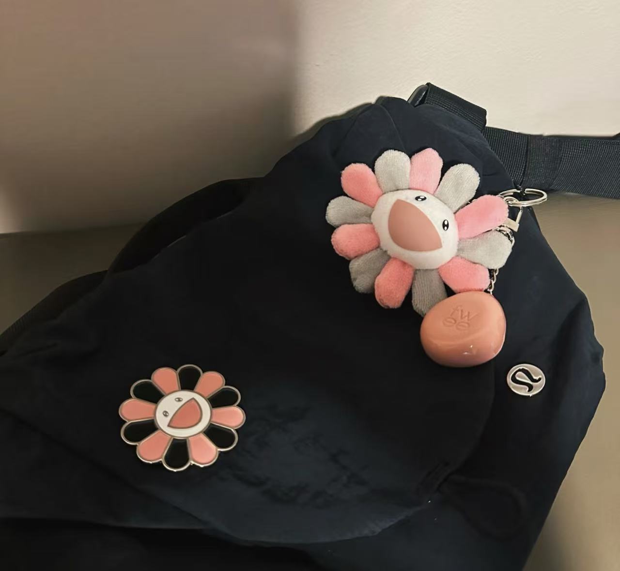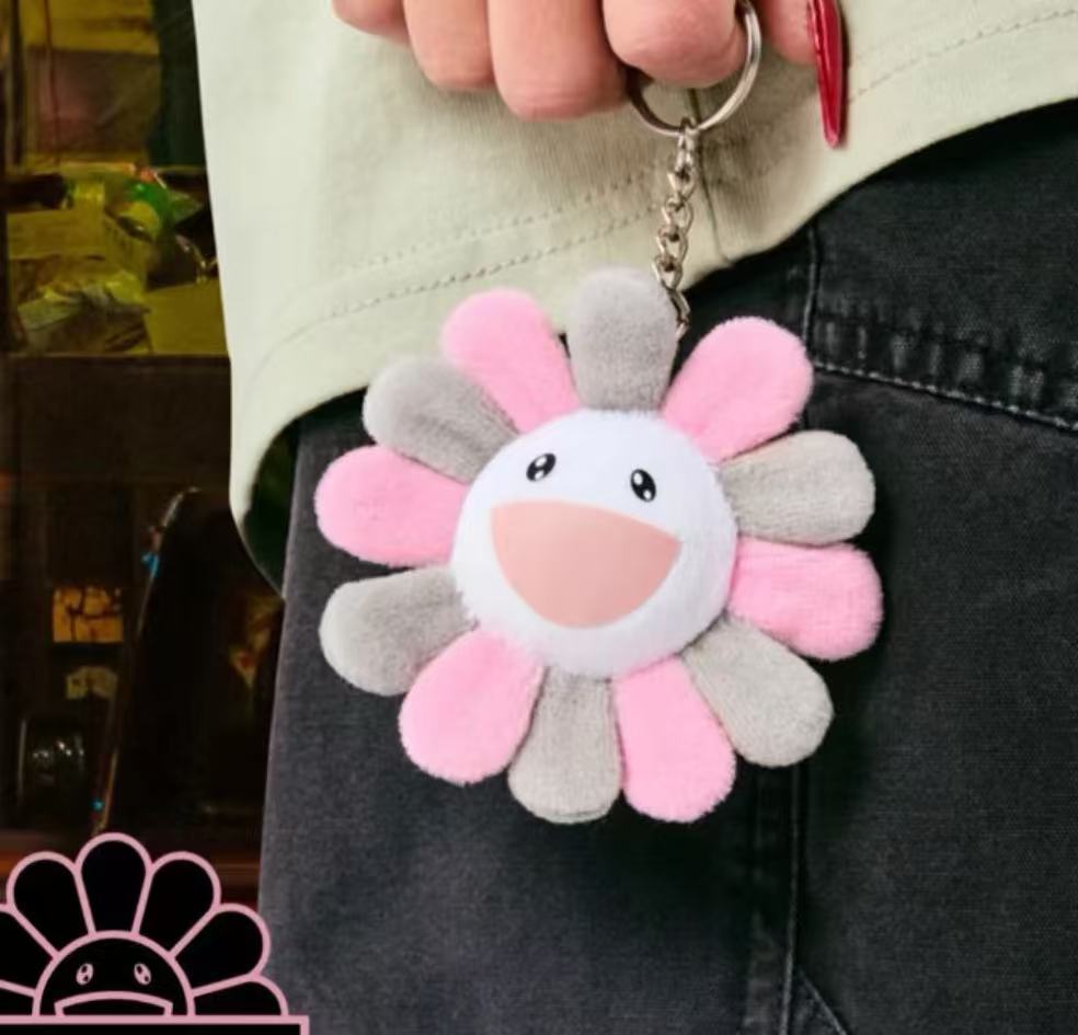 這個掛飾採用了村上隆經典的「太陽花」形象,並以灰粉配色呈現,完美地融合了 BLACKPINK 的甜酷風格與村上隆的童趣藝術。
