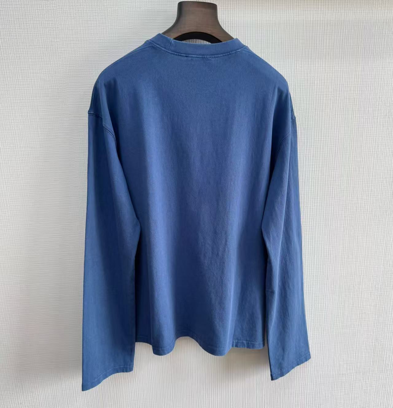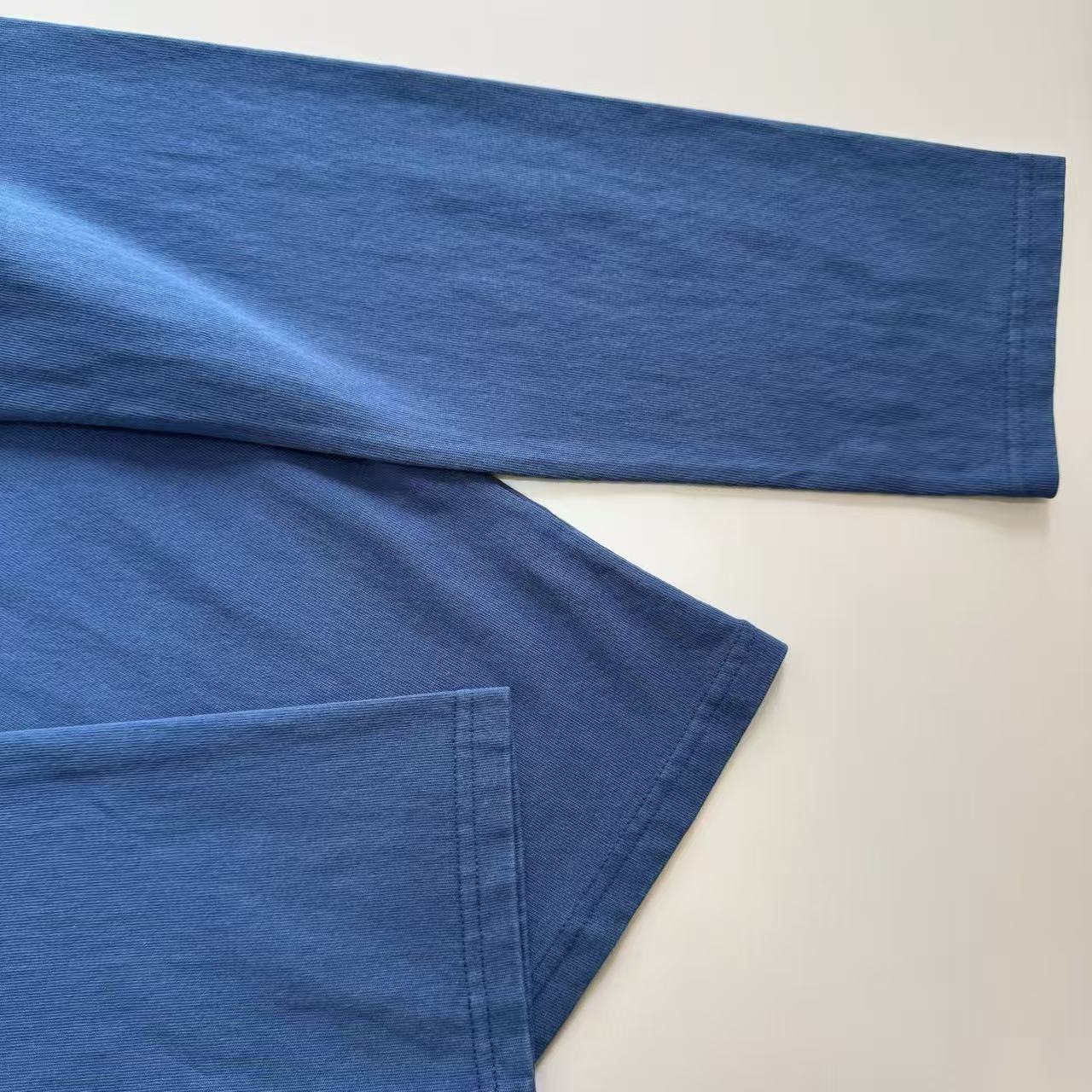洗鍊圓領長袖廓形: 針對領口與袖口進行加強縫製,確保在洗水工序後依然維持結實的結構與挺拔感。