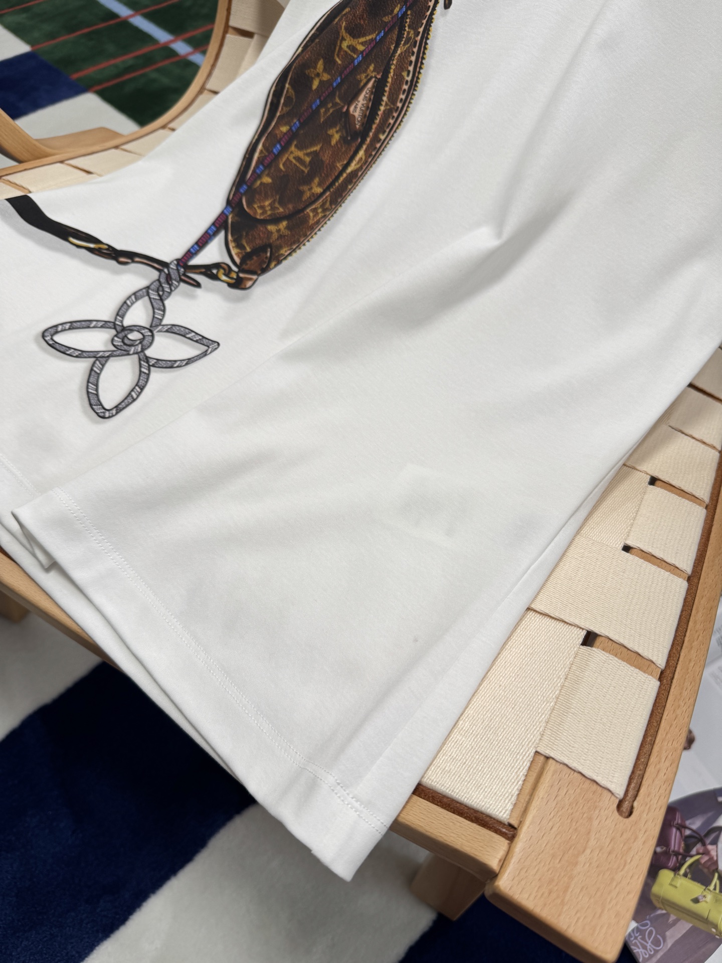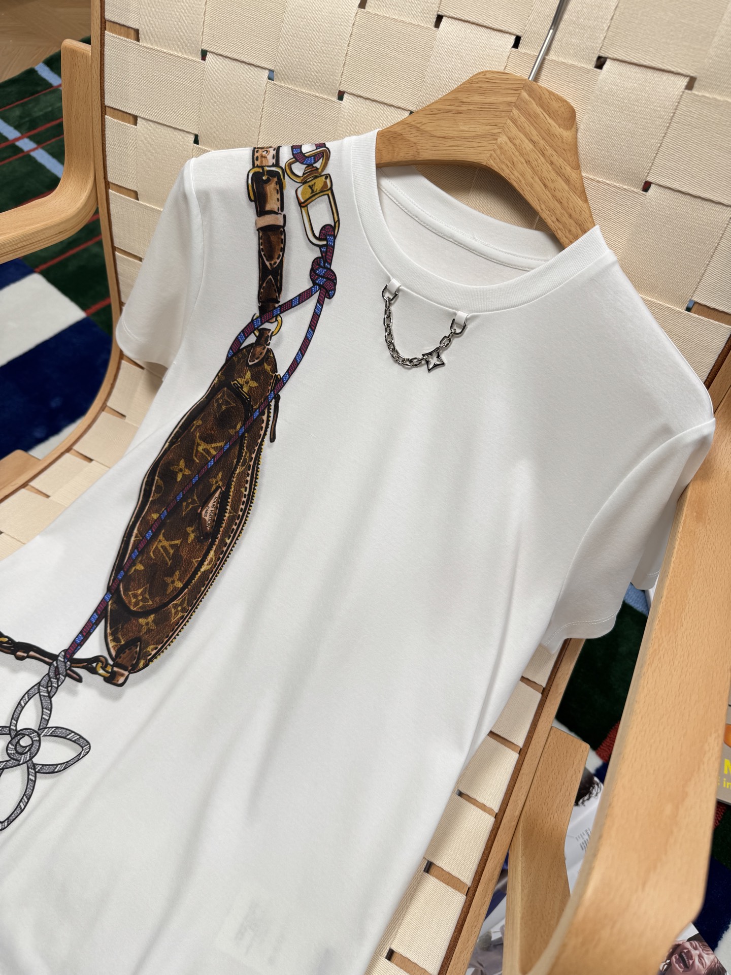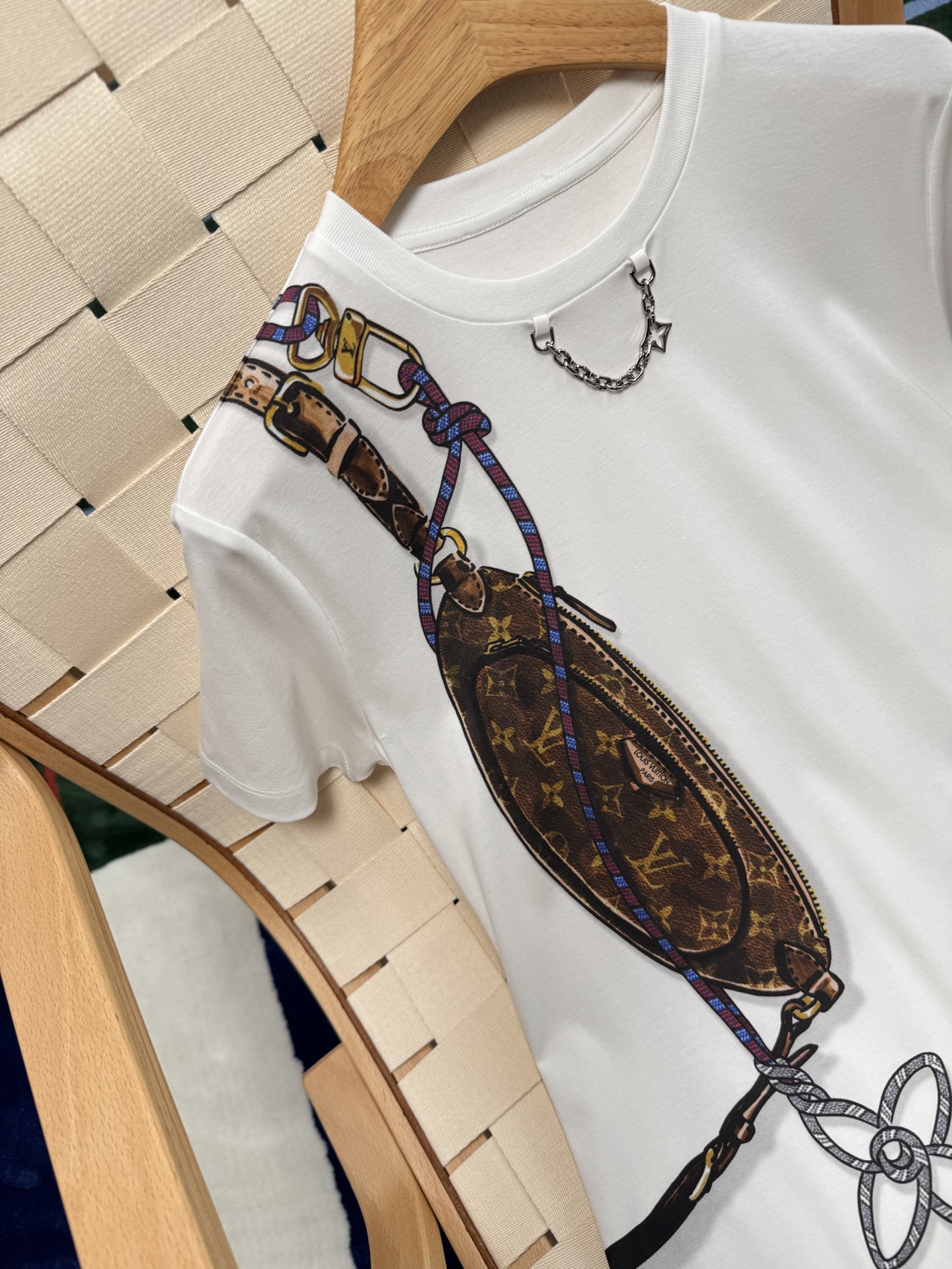這款設計真的太有意思了——右側肩部以「Keepit 腰包」為靈感,結合 Damier 格紋錯視效果圖案,讓整件 T 恤多了一份層次感與玩味。再加上以繽紛繩索勾勒出 Monogram 花卉圖案,整體視覺充滿活力與個性。