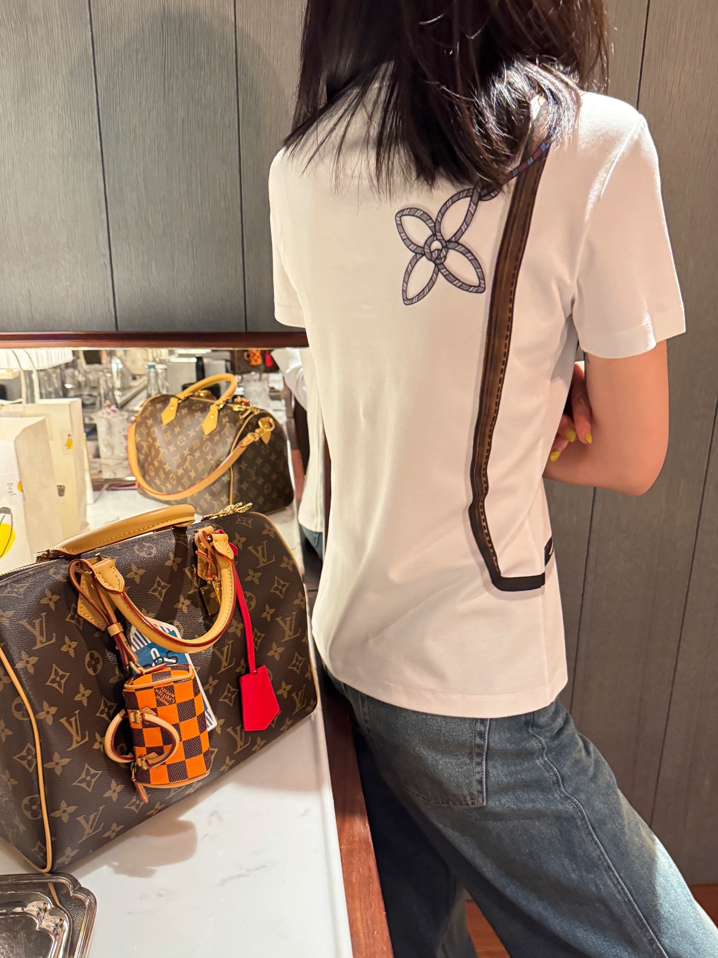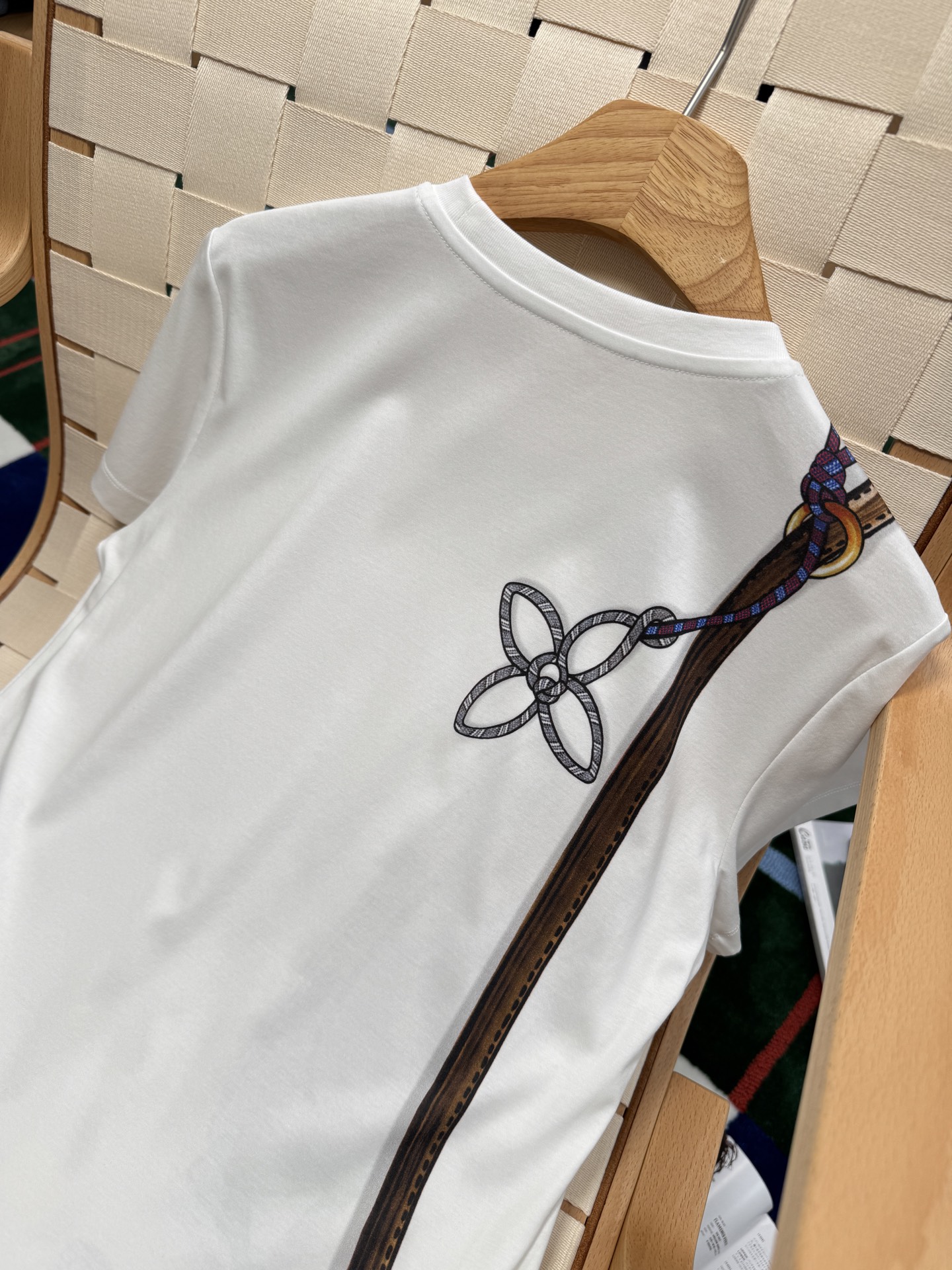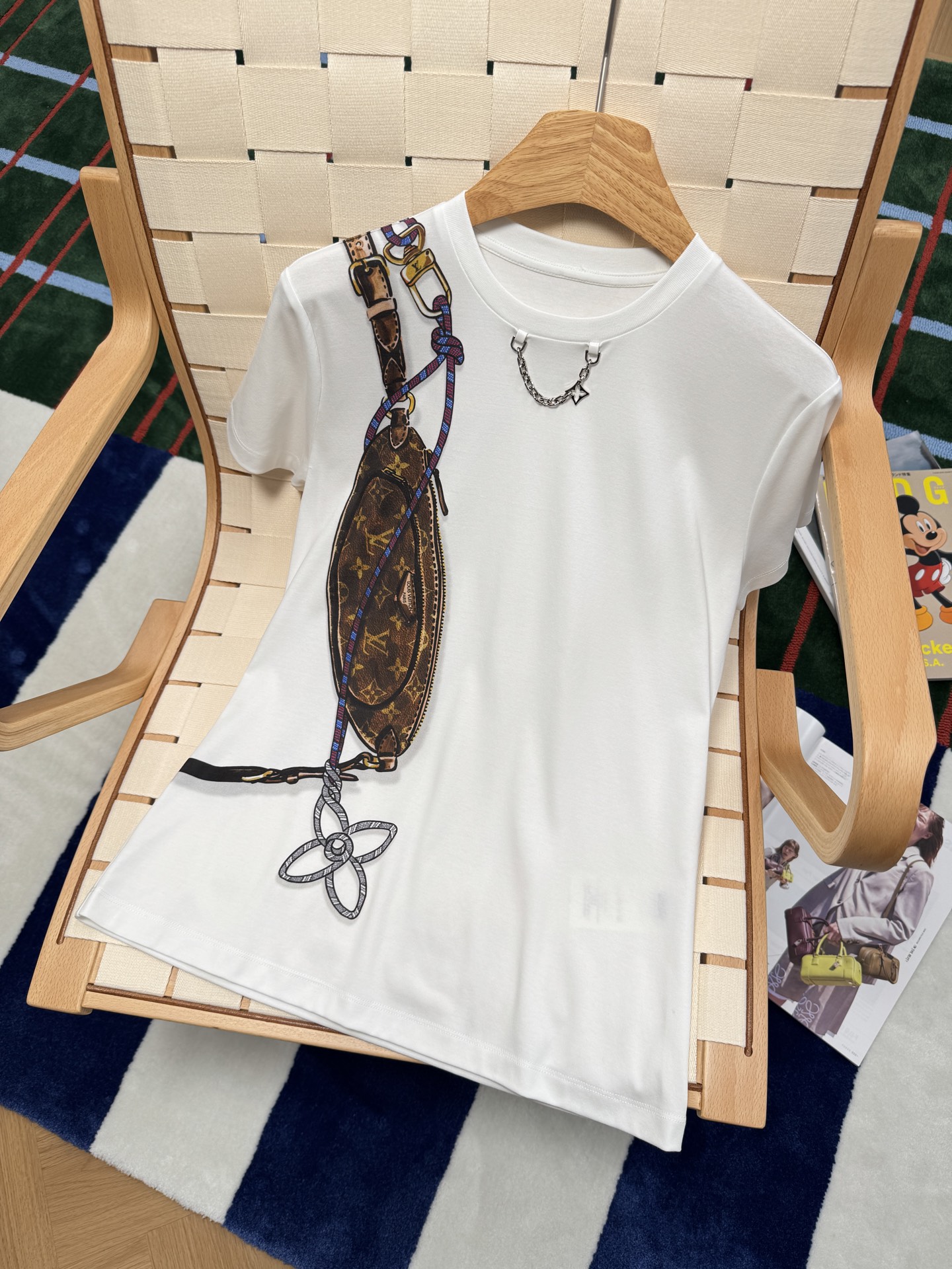 這款設計真的太有意思了——右側肩部以「Keepit 腰包」為靈感,結合 Damier 格紋錯視效果圖案,讓整件 T 恤多了一份層次感與玩味。再加上以繽紛繩索勾勒出 Monogram 花卉圖案,整體視覺充滿活力與個性。