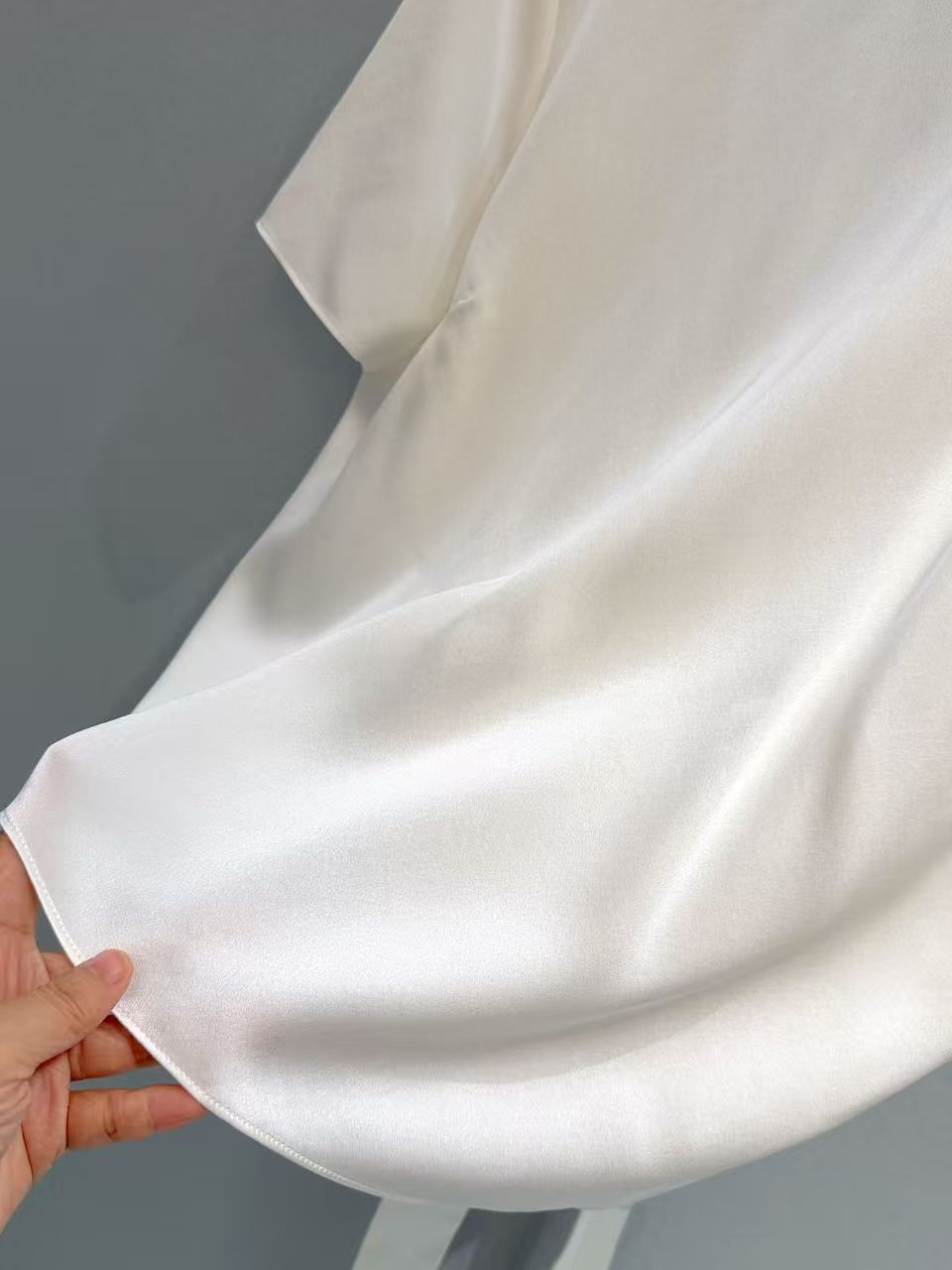 100% 頂級桑蠶絲: 嚴選重磅真絲材質,觸感如同流動的水波,細膩且親膚。這種材質具備天然的導溫性,是真正「能呼吸」的奢華。