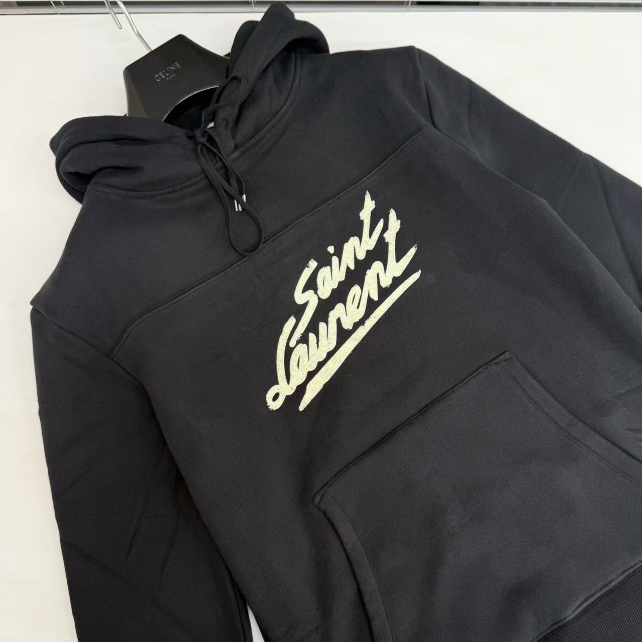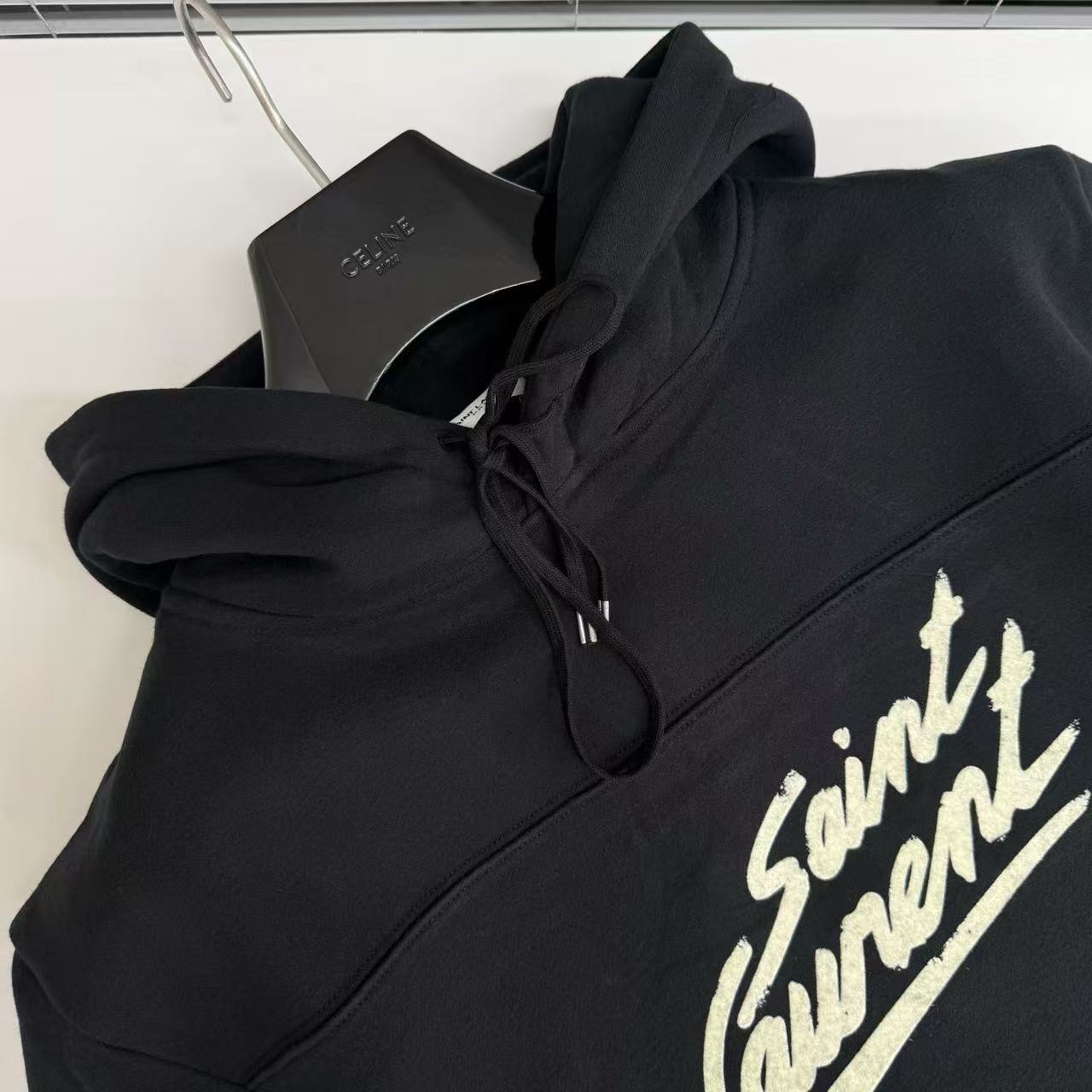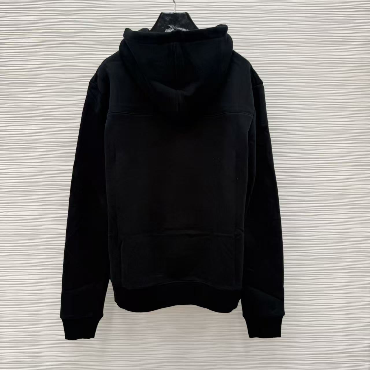 這款連帽衛衣以極簡的純黑為基底,胸前標誌性的草寫 Logo 採用精緻的植絨工法呈現,不僅極具品牌辨識度,更為整體的街頭氛圍注入了一份優雅的氣息。