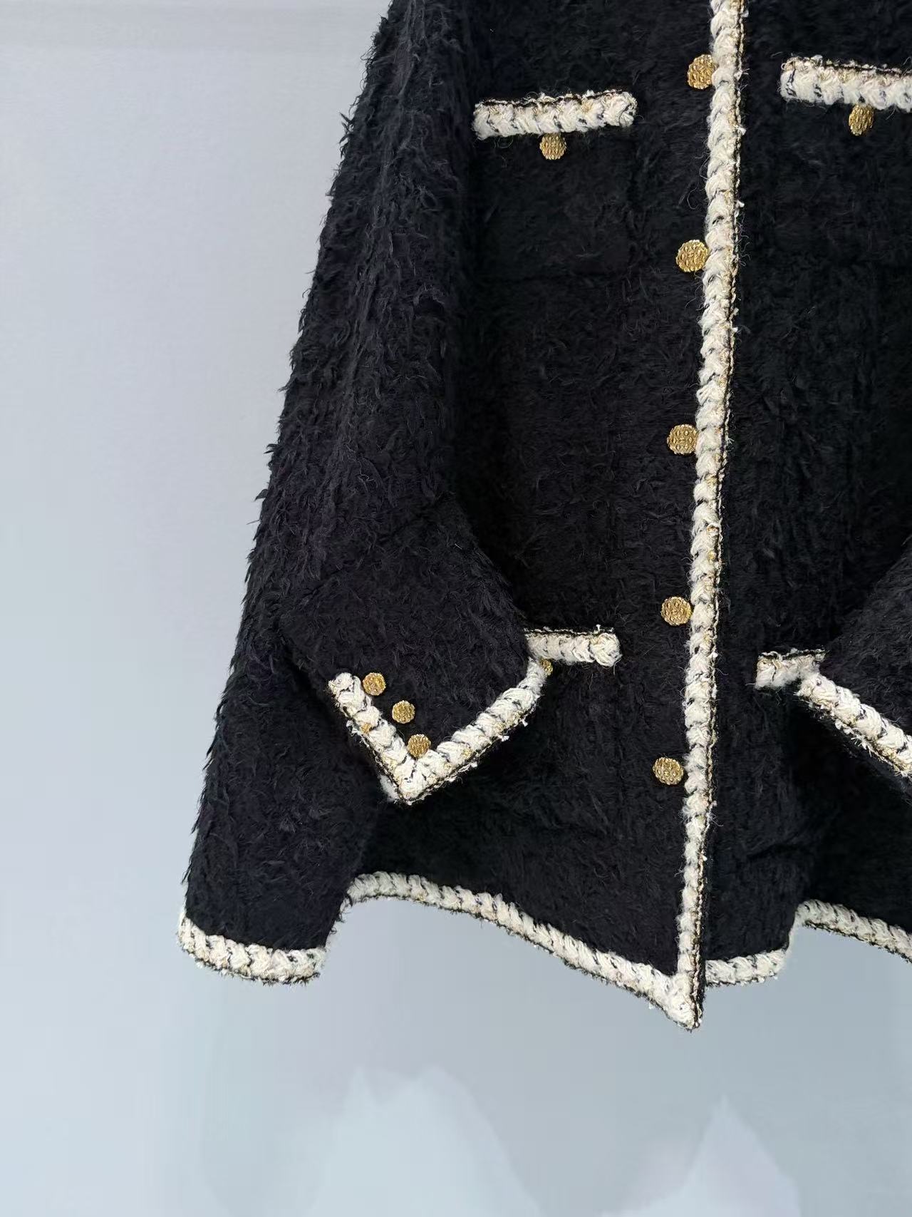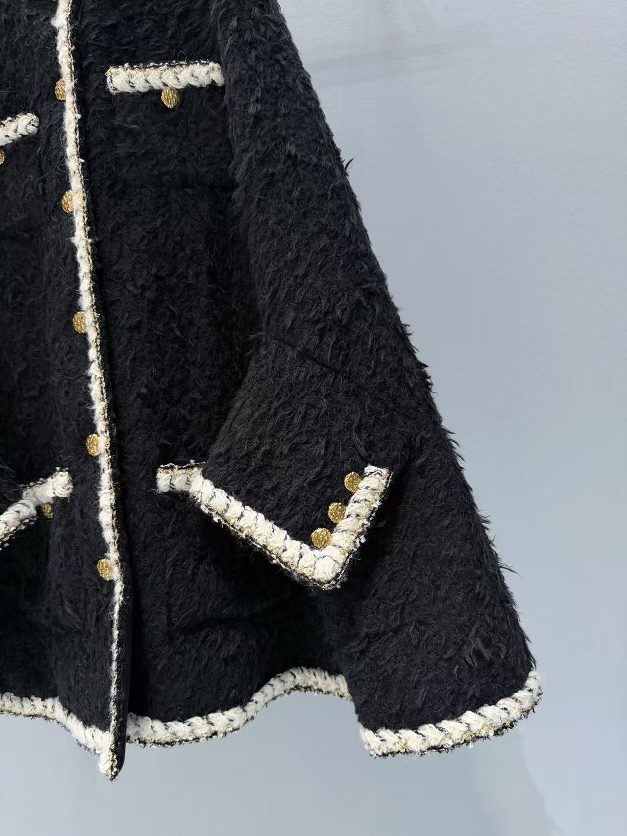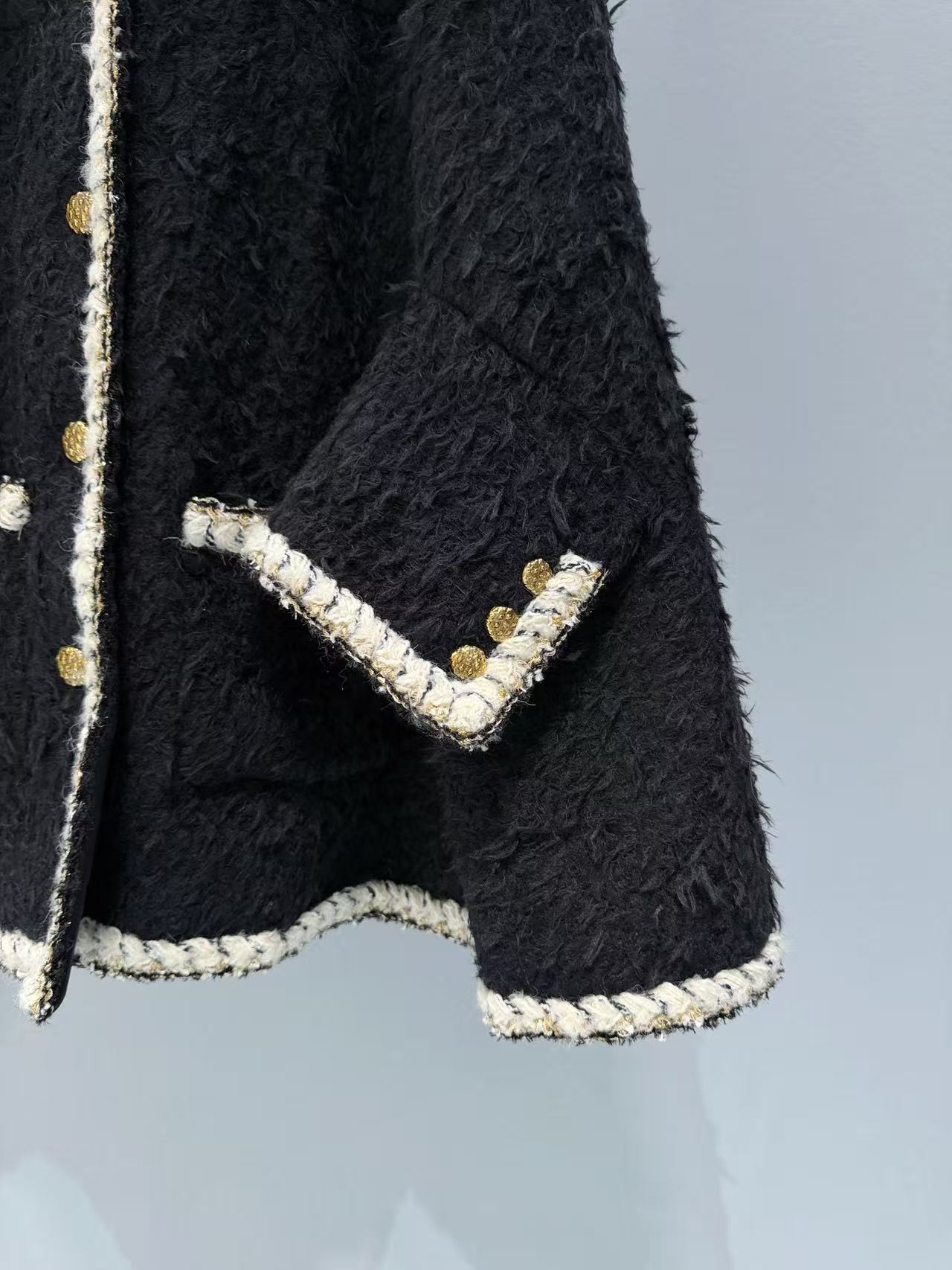 選用長毛黑色粗花呢,質地豐富立體,觸感柔軟卻帶有粗花呢獨特的顆粒感,白色鑲邊與金色紐扣增添細膩光澤,細節精致到不行,將經典元素完美融合現代剪裁,既時尚又實穿,保暖性與質感都一流。