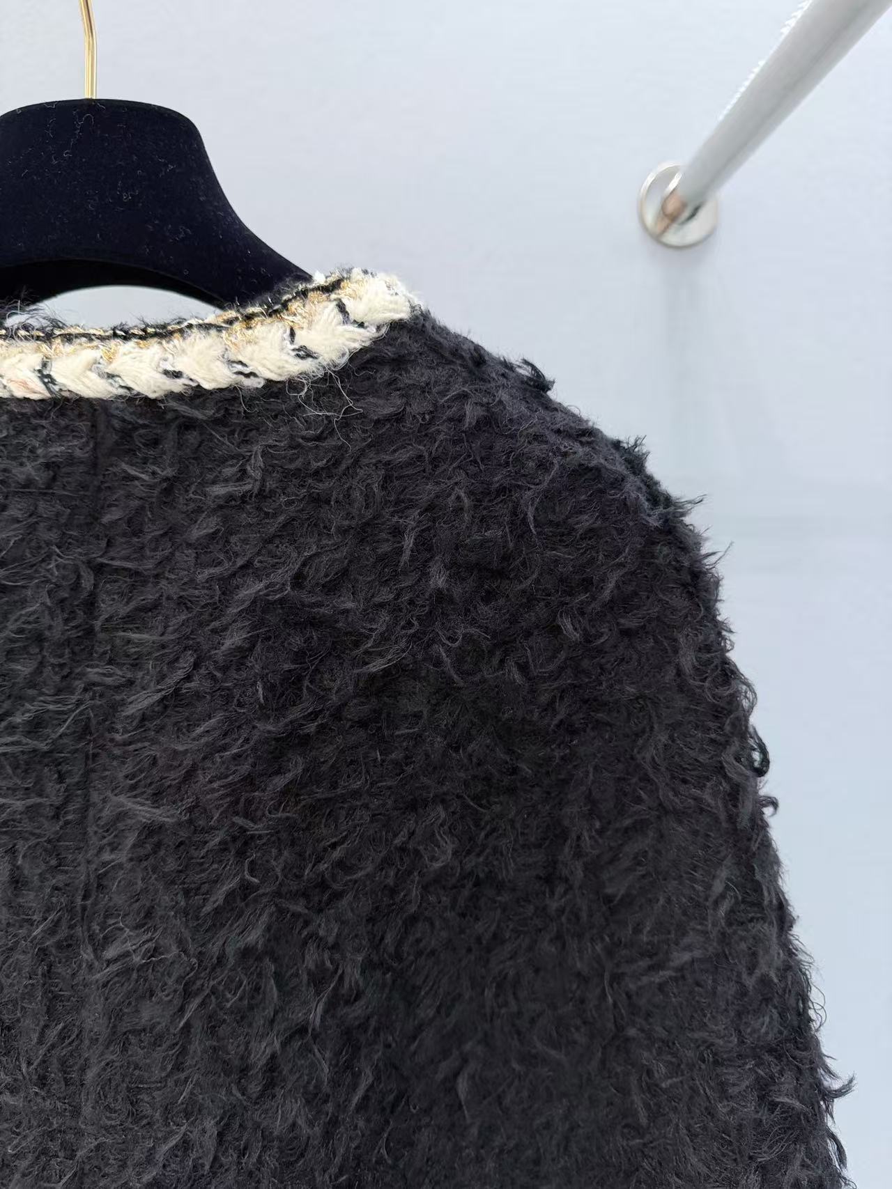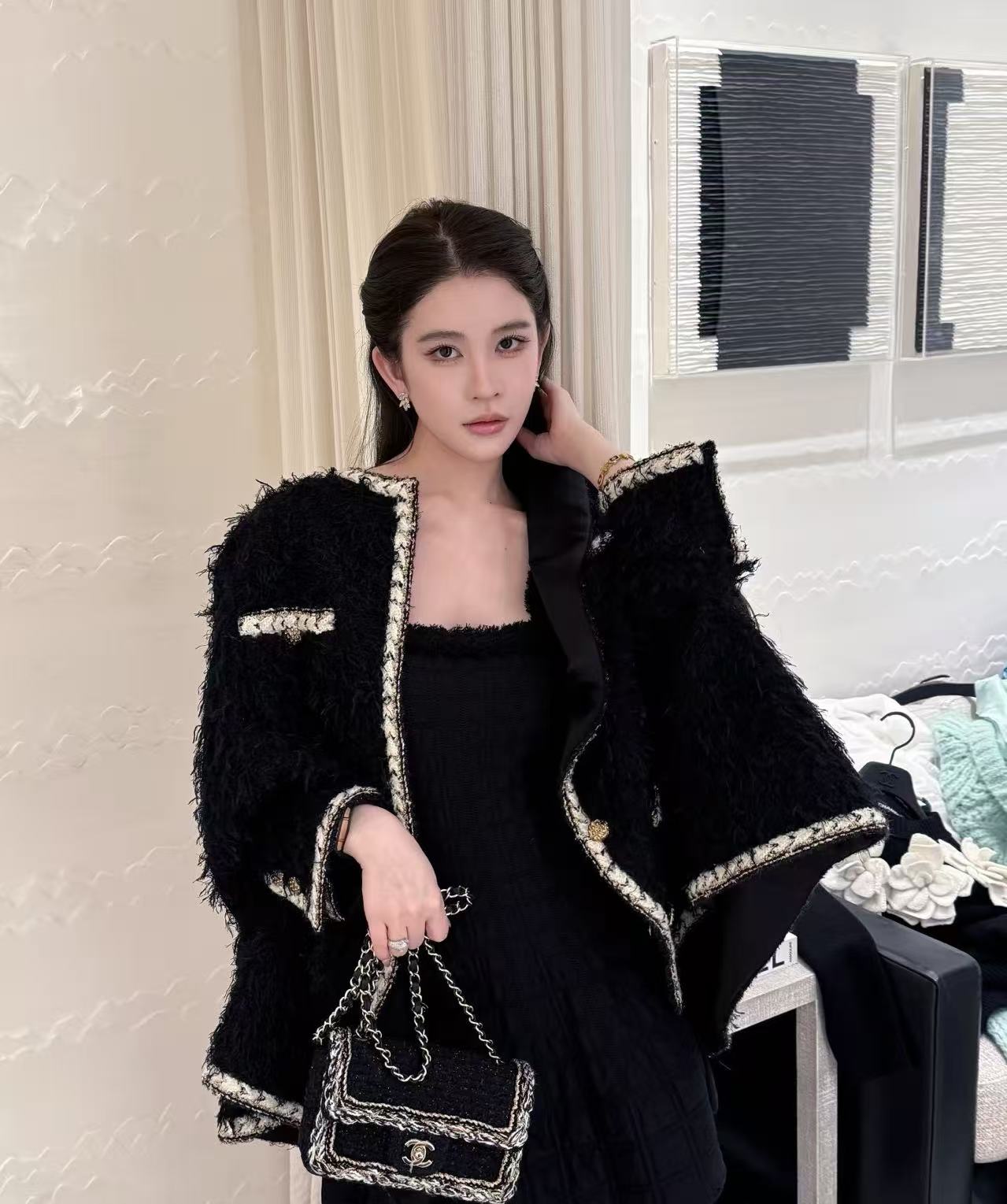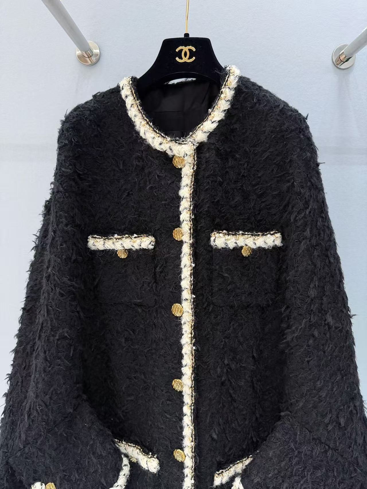 選用長毛黑色粗花呢,質地豐富立體,觸感柔軟卻帶有粗花呢獨特的顆粒感,白色鑲邊與金色紐扣增添細膩光澤,細節精致到不行,將經典元素完美融合現代剪裁,既時尚又實穿,保暖性與質感都一流。