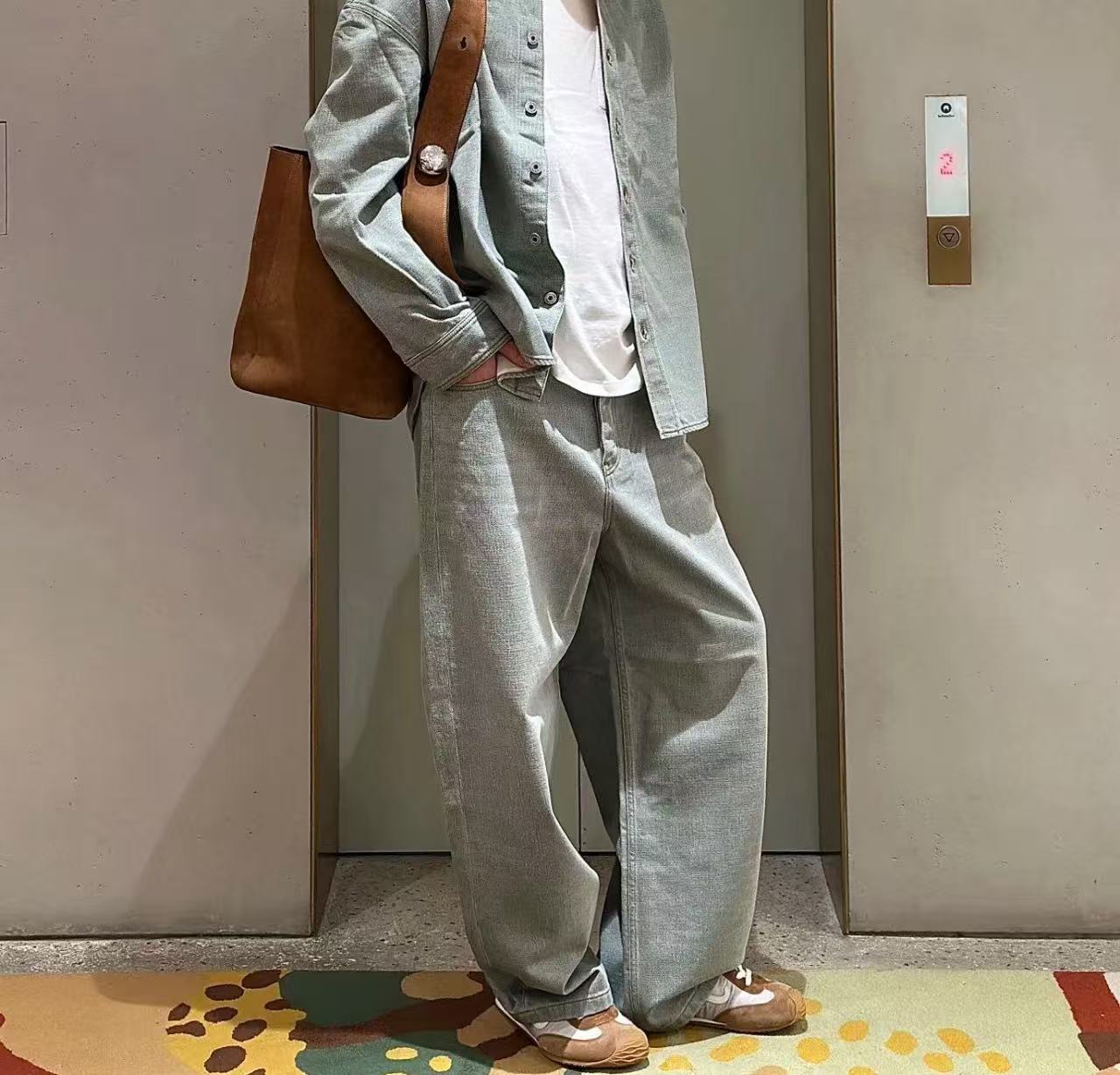 這件牛仔褲的材質真的非常講究!它使用了高密度的棉質丹寧布,還融入了微量的彈性纖維,讓你在擁有挺括版型的同時,也能兼顧穿著的舒適度。面料經過多階段水洗處理,包括酶洗、石磨和手工刷色,讓褲子呈現出自然的褪色效果,完美營造出復古的做舊質感。