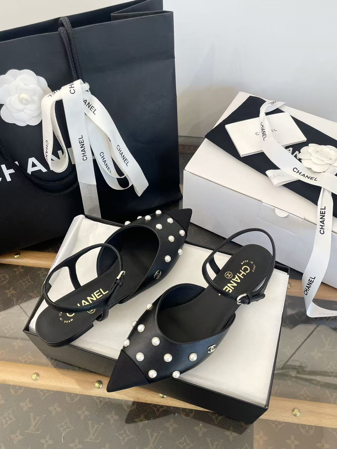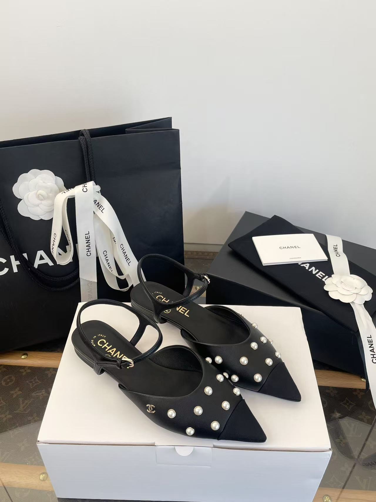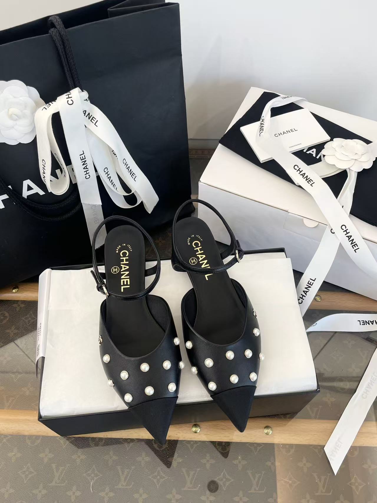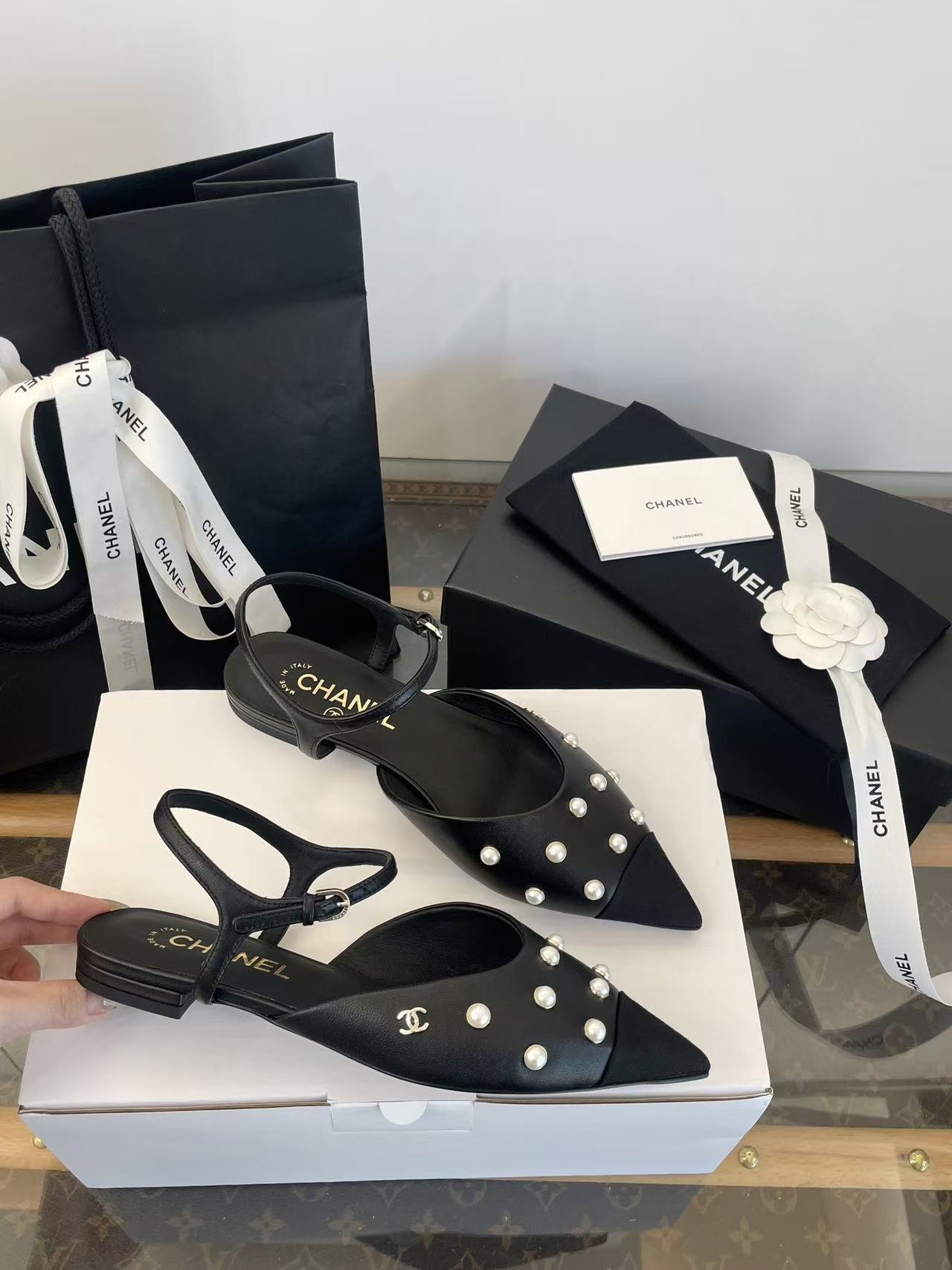珍珠鑲嵌: 涼鞋上點綴著珍珠鑲嵌,這是標誌性的奢華元素,讓鞋子充滿了精緻感與光澤度,非常顯貴。