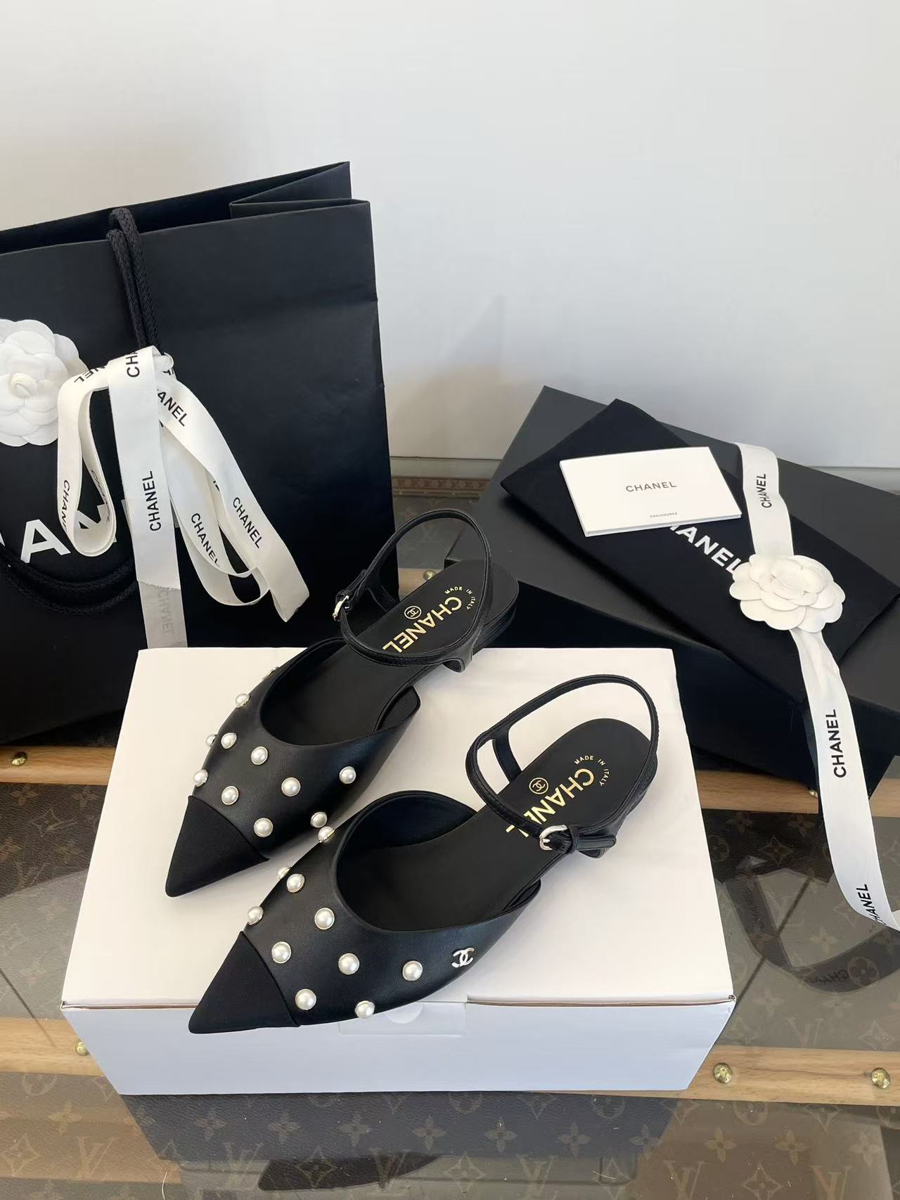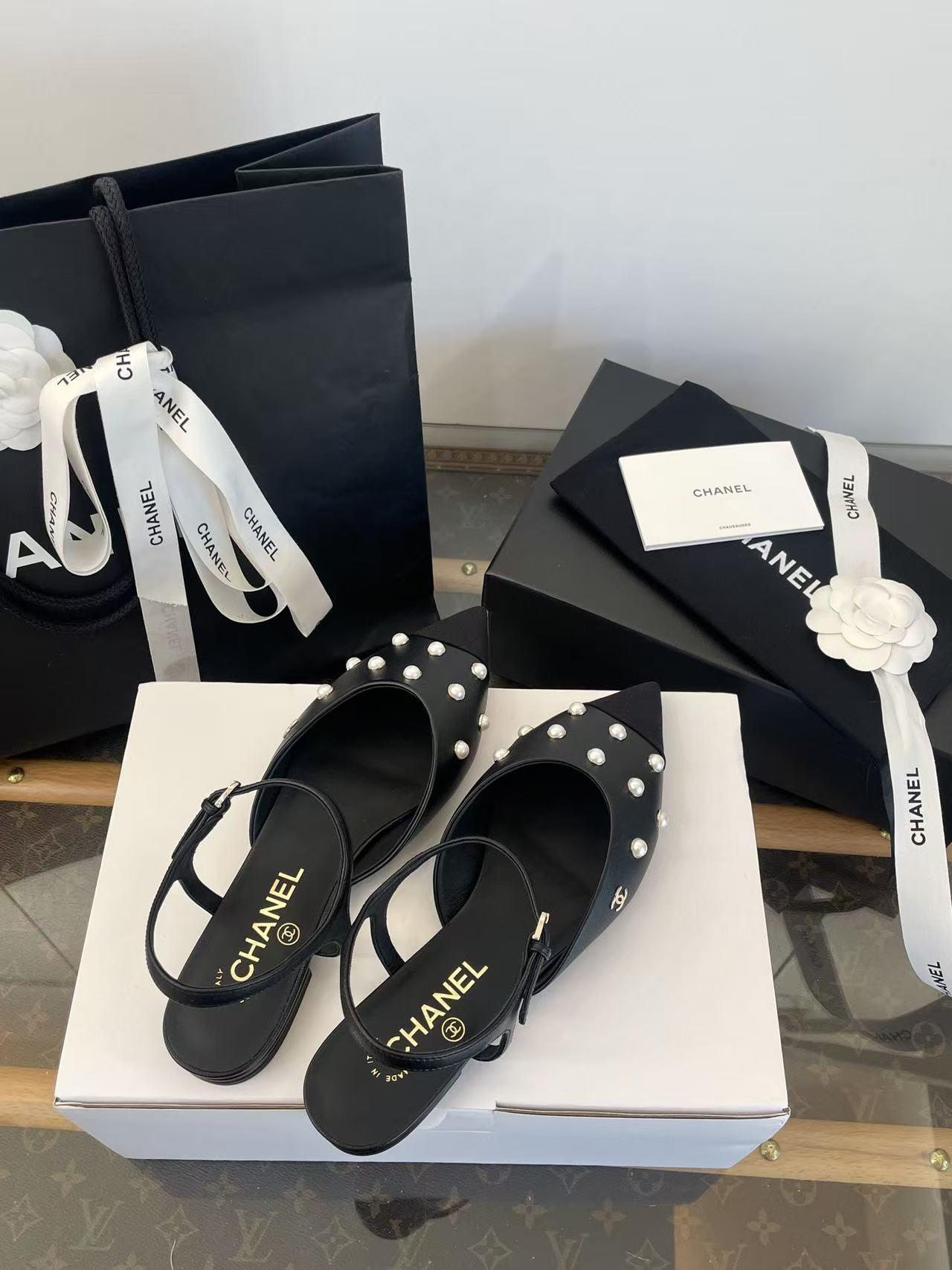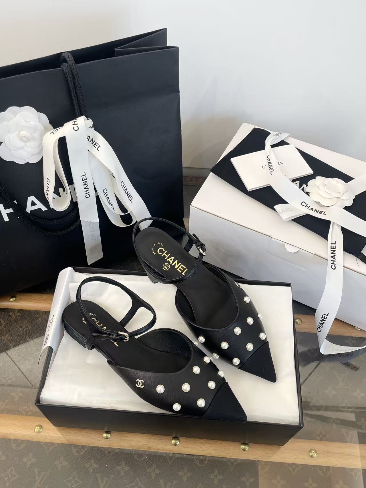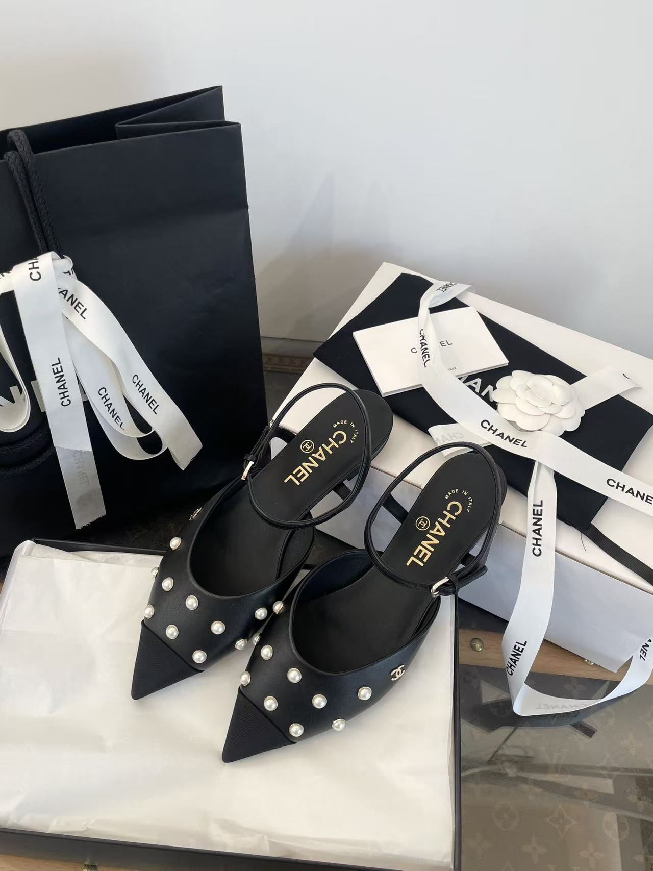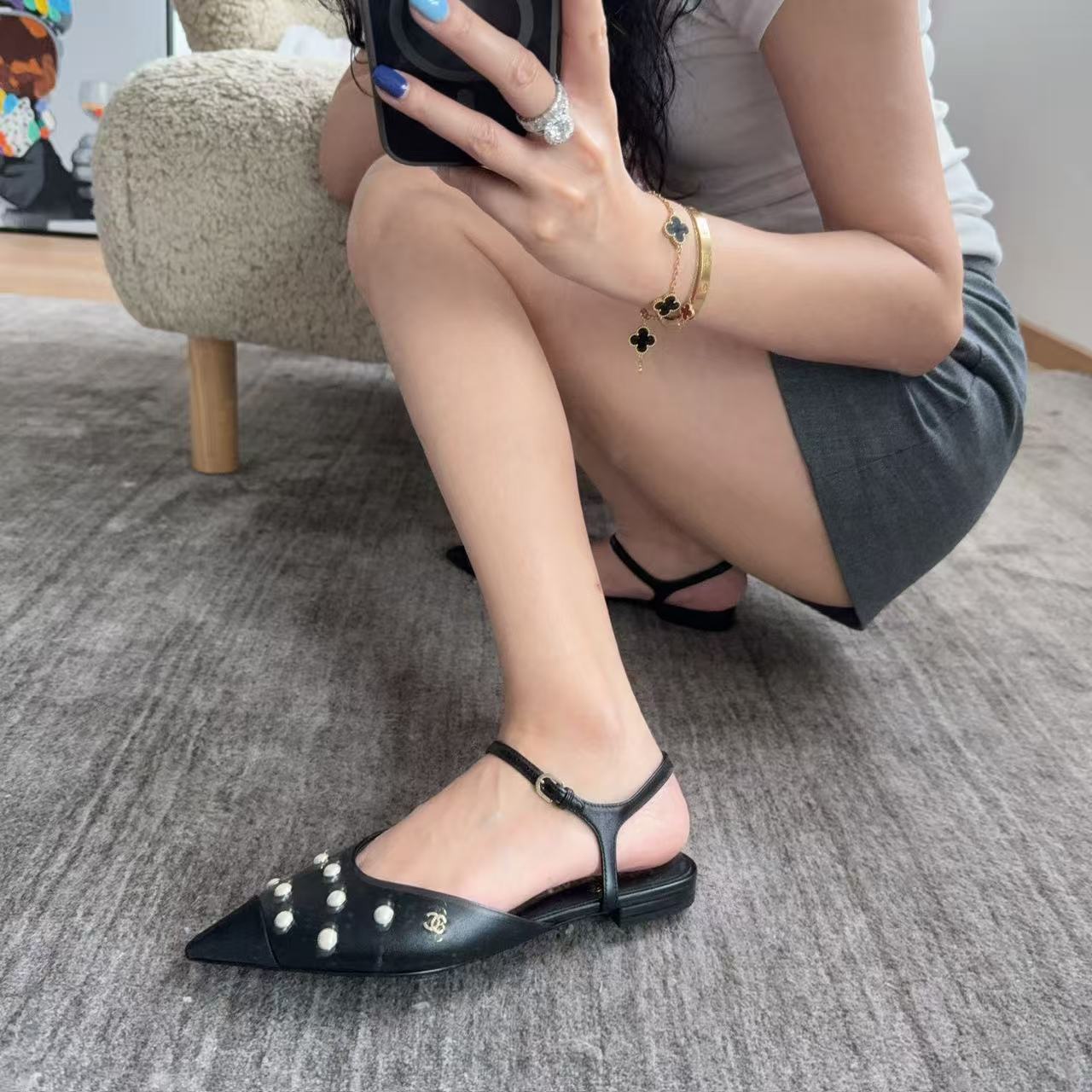 珍珠鑲嵌: 涼鞋上點綴著珍珠鑲嵌,這是標誌性的奢華元素,讓鞋子充滿了精緻感與光澤度,非常顯貴。