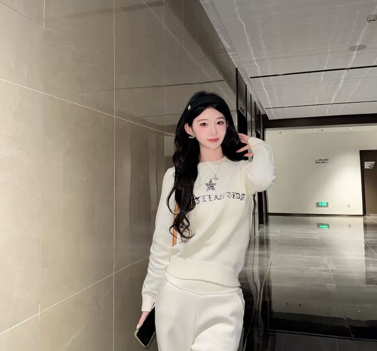 奶白色底色乾淨溫柔,胸前以立體字母刺繡搭配閃耀幸運星裝飾,細節精緻度直接拉滿,低調中透著品牌獨有的華麗亮點,上身瞬間提升氣質,清新又帶點甜美小幸運的感覺。