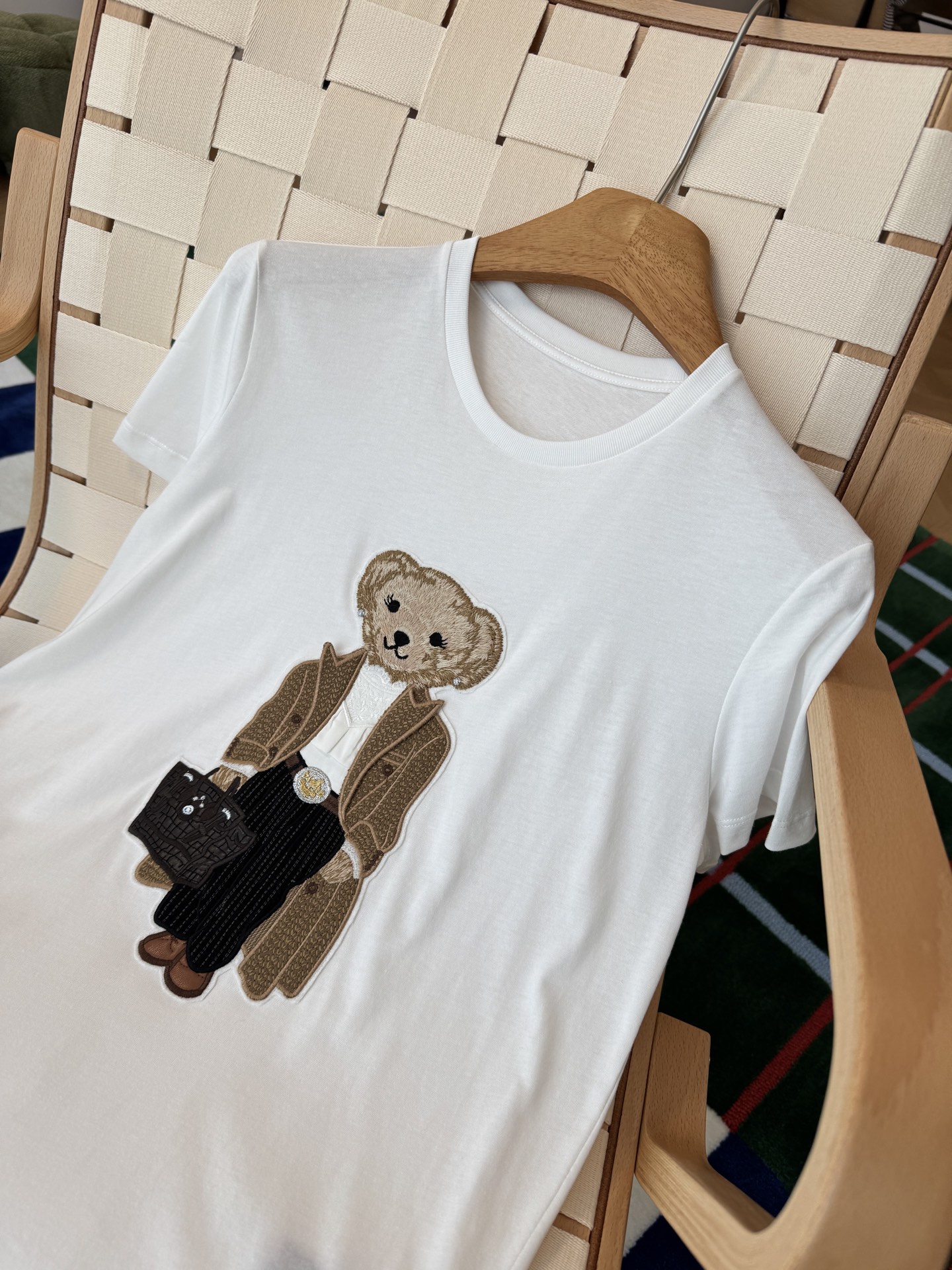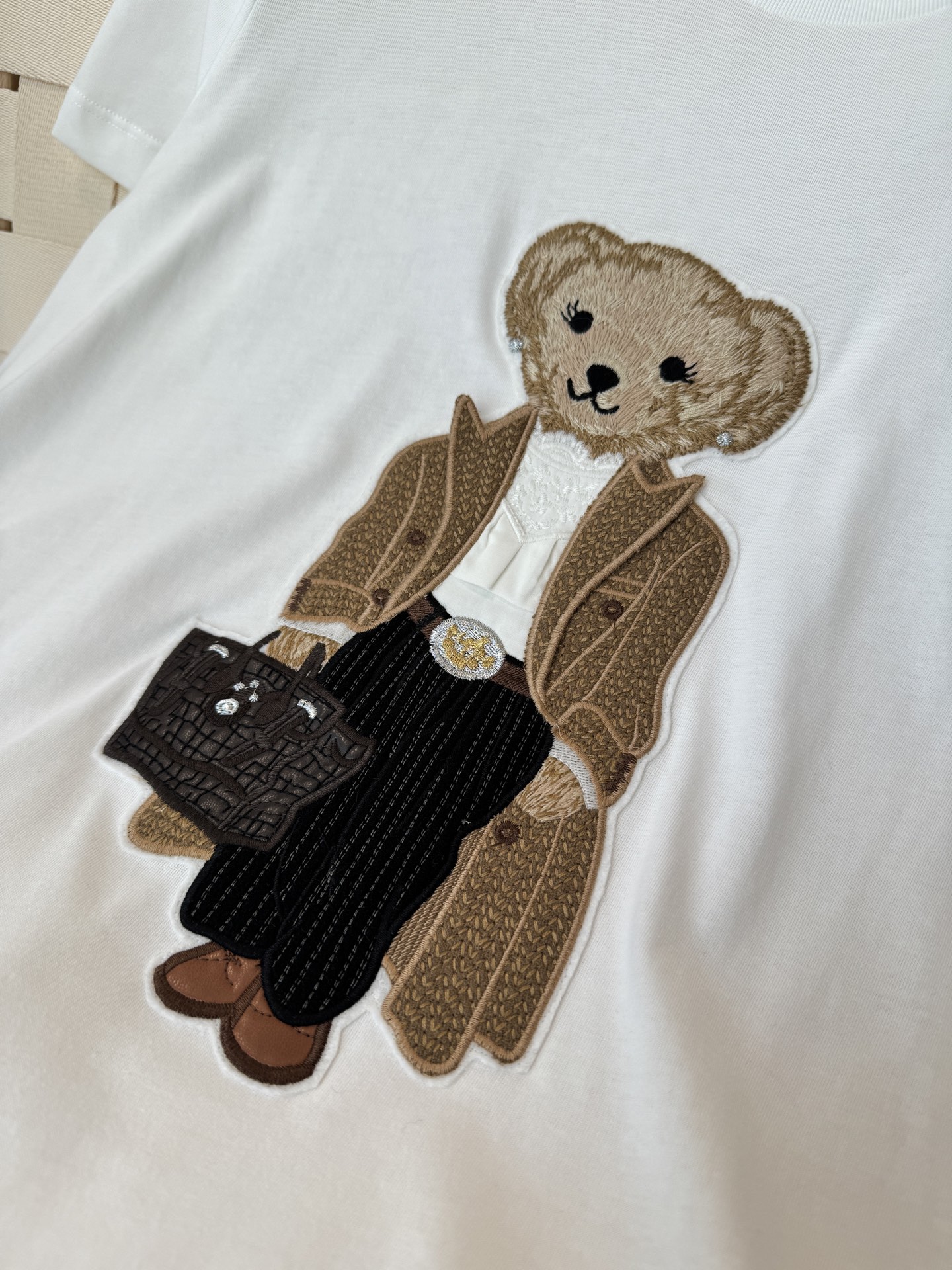 胸前的「風衣小熊」刺繡章仔細節滿滿,立體精緻、層次分明,完全是品牌工藝的精華呈現。整體風格乾淨俐落,不浮誇卻非常有存在感,讓人越看越喜歡。