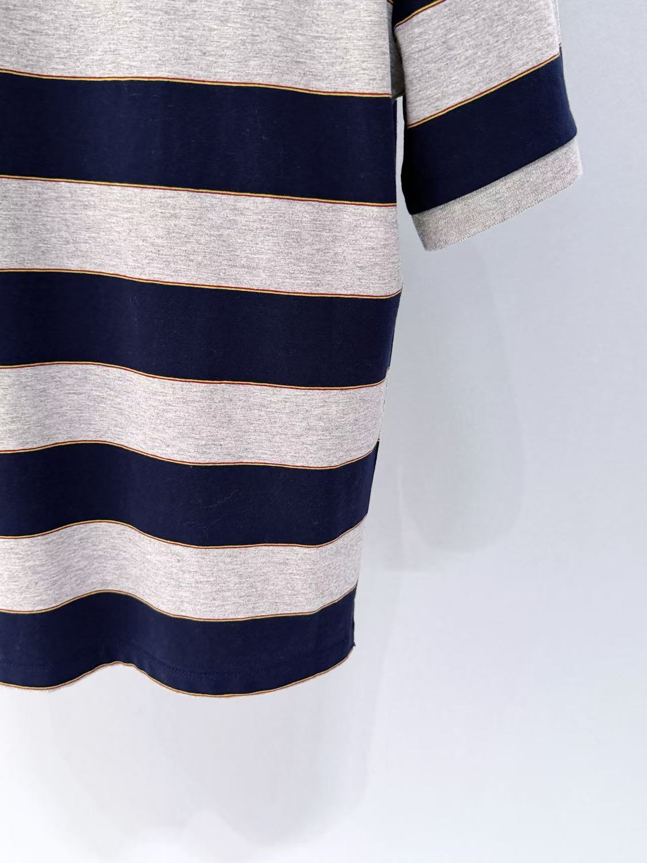 整件衣服採用了超經典的 Polo 領設計,搭配質感的藏藍與淺灰撞色條紋,配色低調卻顯得非常高級。俐落的短袖剪裁,加上胸前精緻的品牌徽标點綴,細節感直接拉滿。