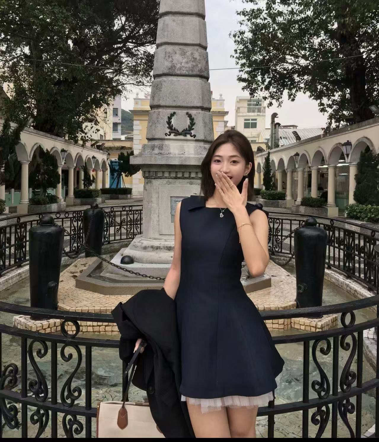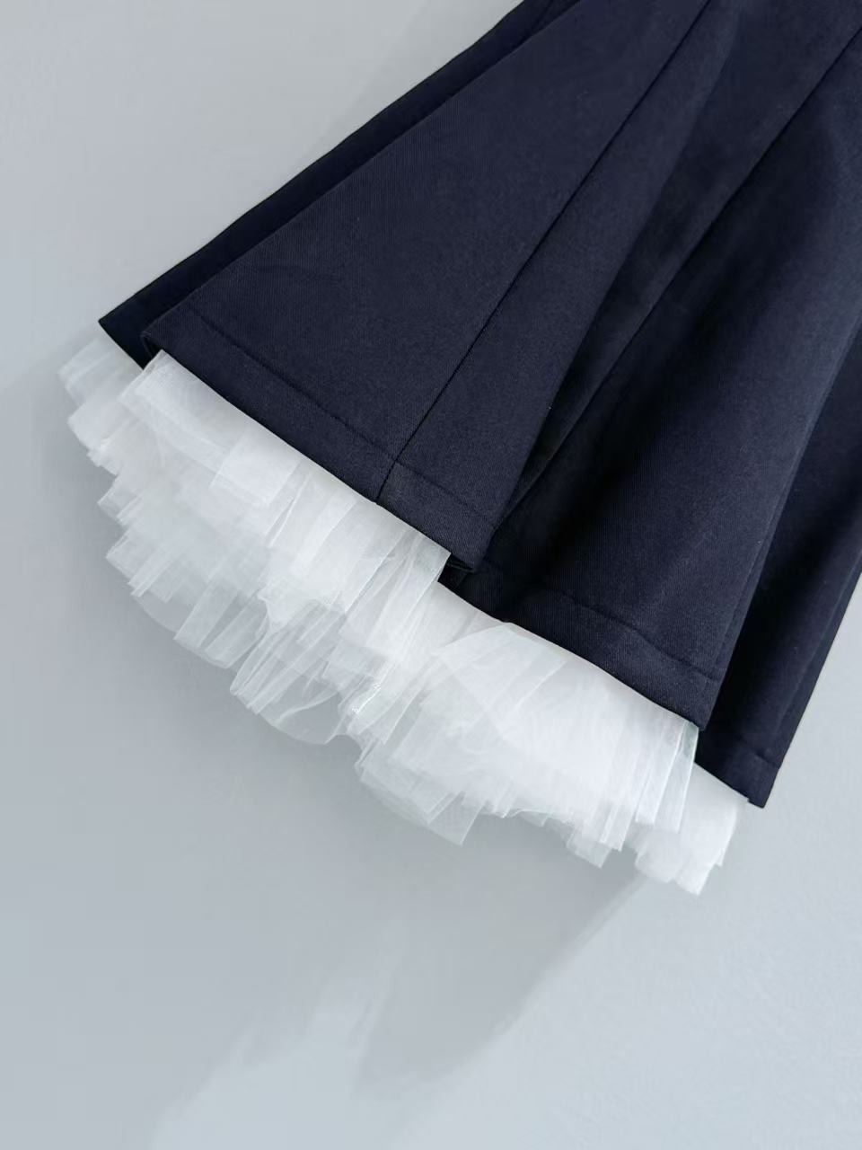 下擺拼接的一層白色細緻薄紗,在挺括的材質下若隱若現,完美平衡了藏青色的沉穩,注入了一份靈動的夢幻感。