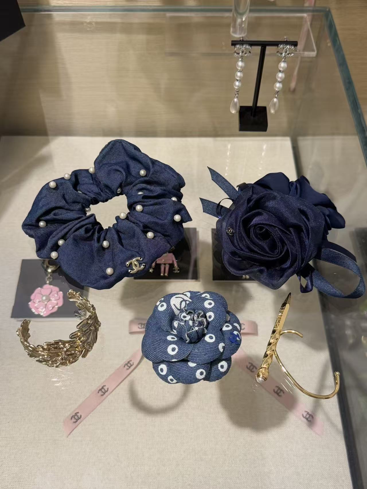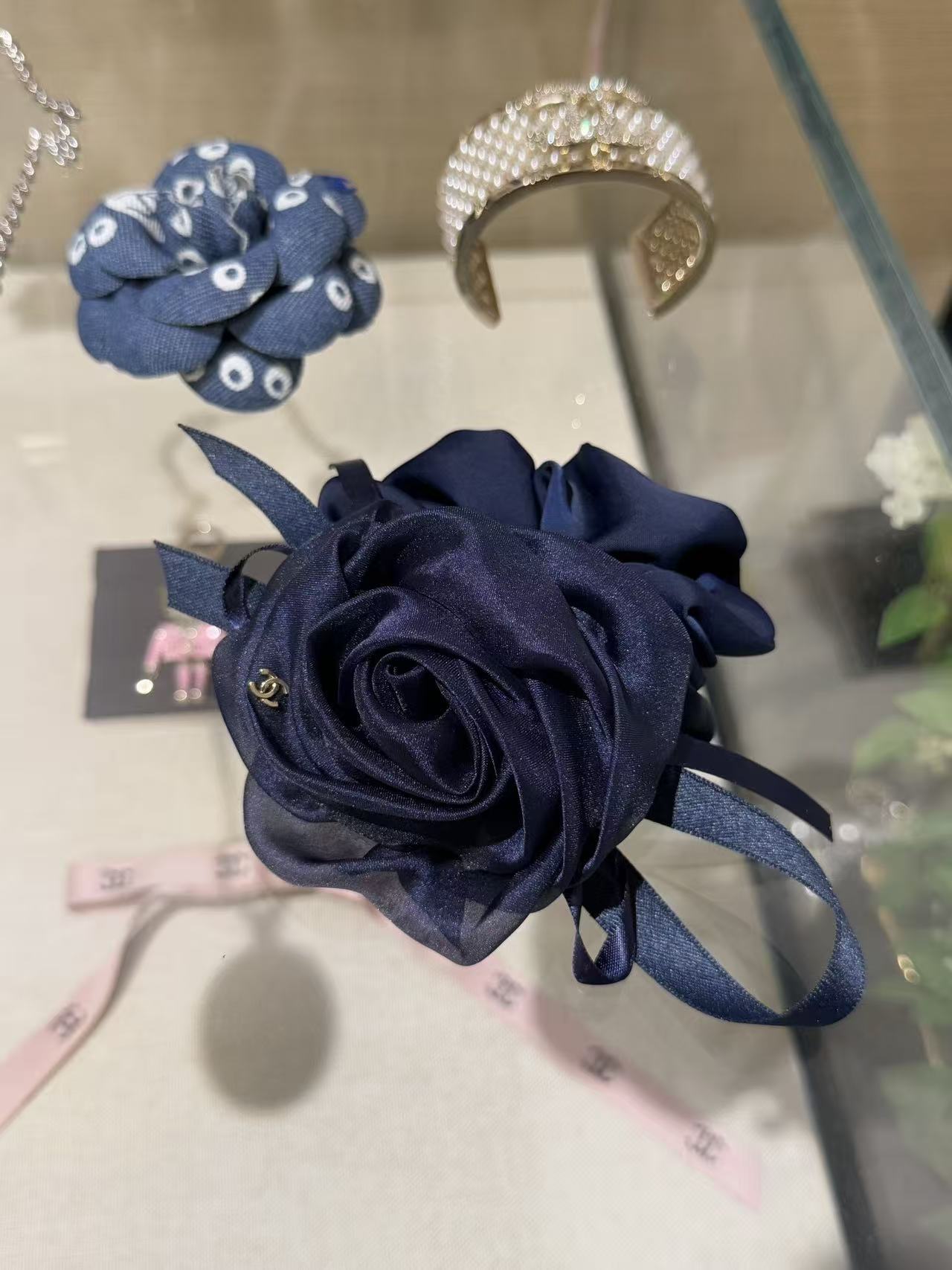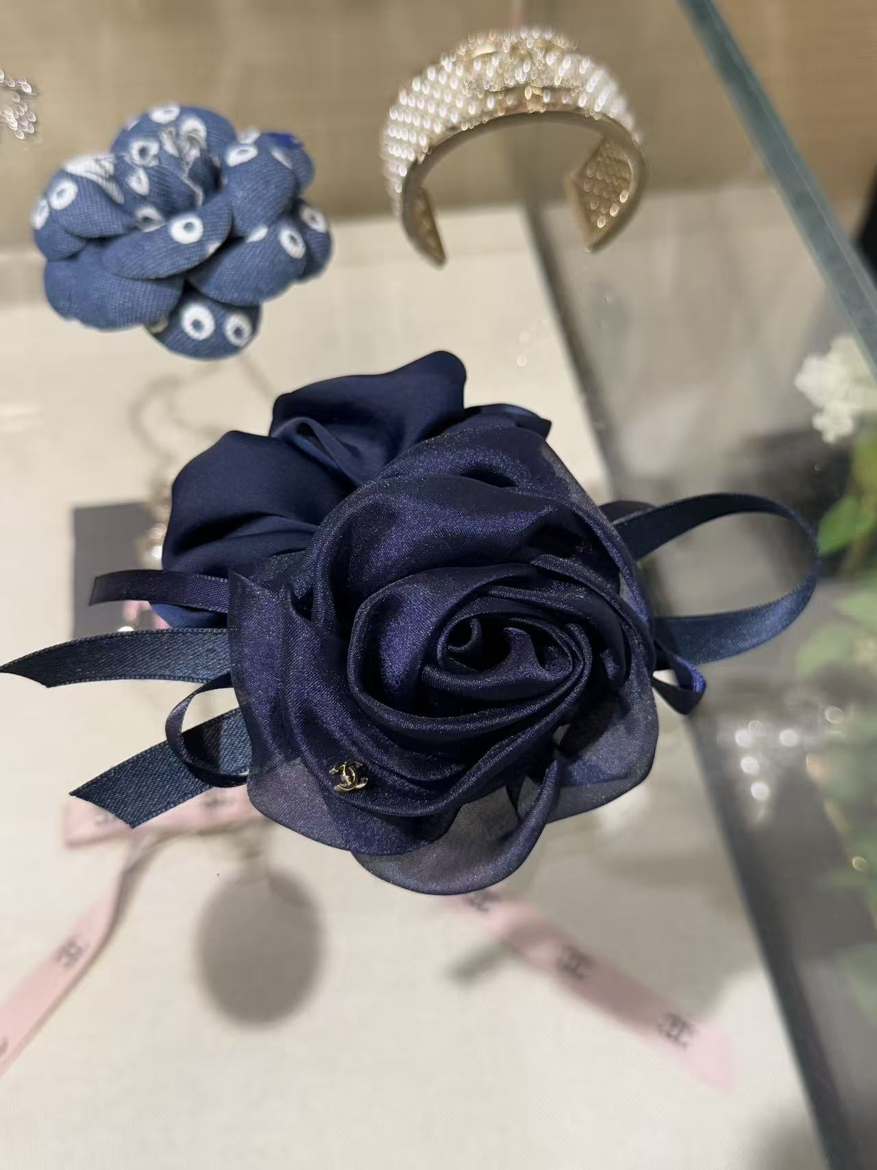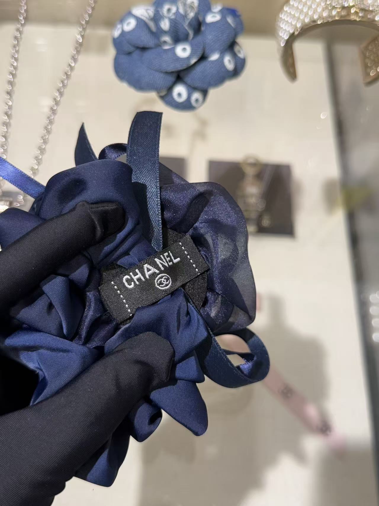 深邃的午夜藍緞面打底,立體網紗山茶花層層綻放,旁邊綁著同色系織帶蝴蝶結,