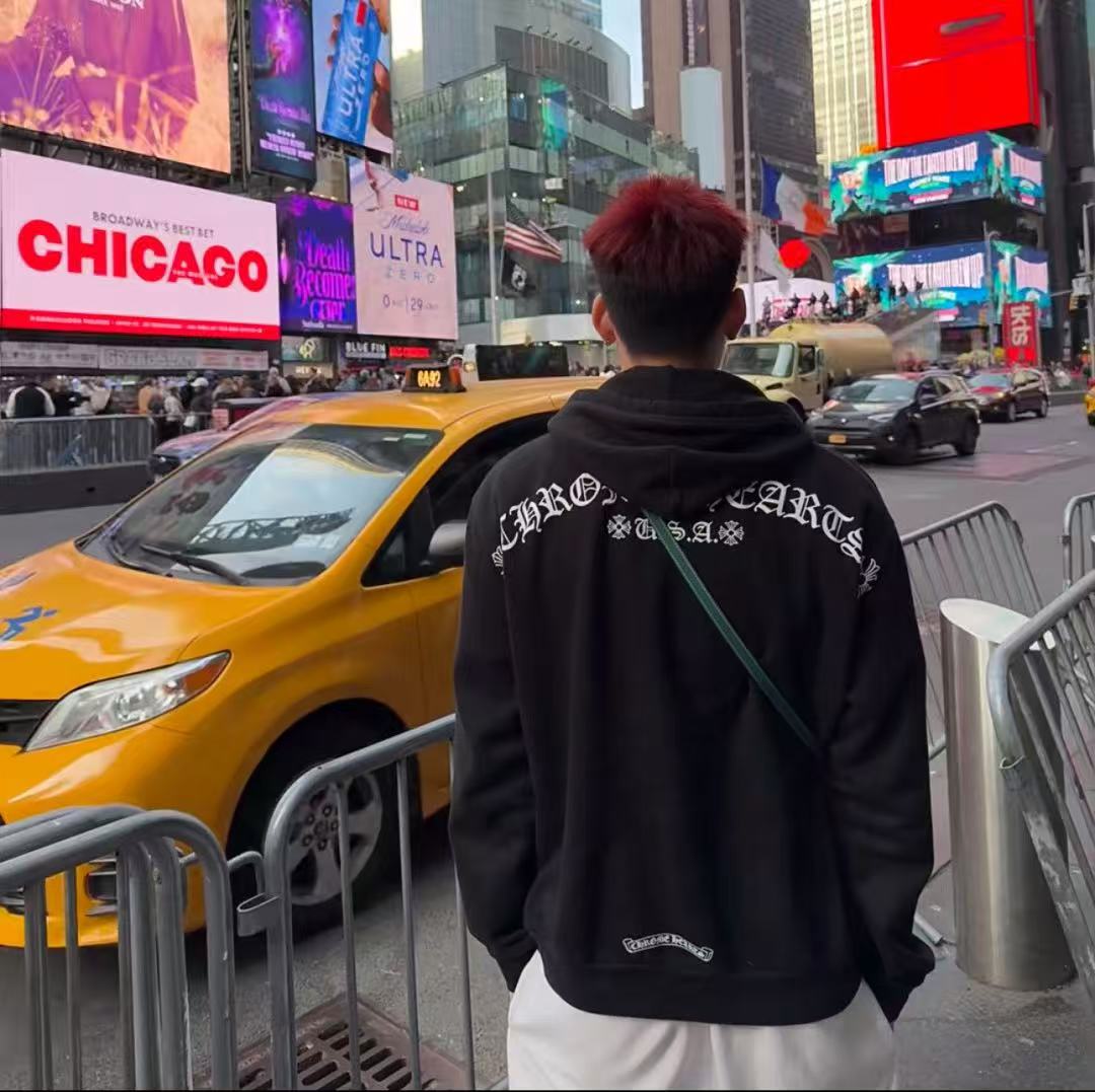 這次分享的梵文燙銀拉鍊衛衣,將複雜的梵文字體與華麗的燙銀工藝結合,光線照射下的銀色光澤與漆黑的重磅棉布形成強烈對比,不僅展現了暗黑街頭的硬派質感,更散發出一種高級的視覺壓迫感。