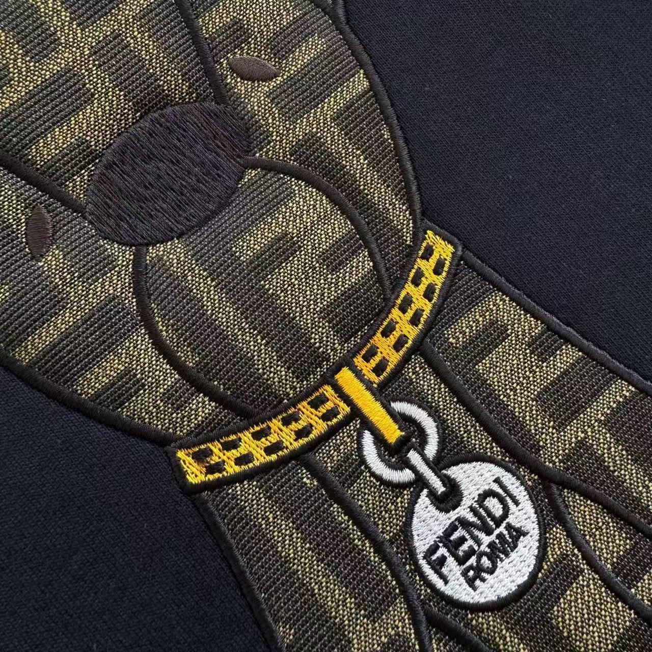 提花大貼片工藝: FF 標誌是先將一塊預先織造好的 FF 提花貼片,透過貼布繡工藝精準地固定於衛衣胸前。這種方式讓 Logo 更有層次和立體感。