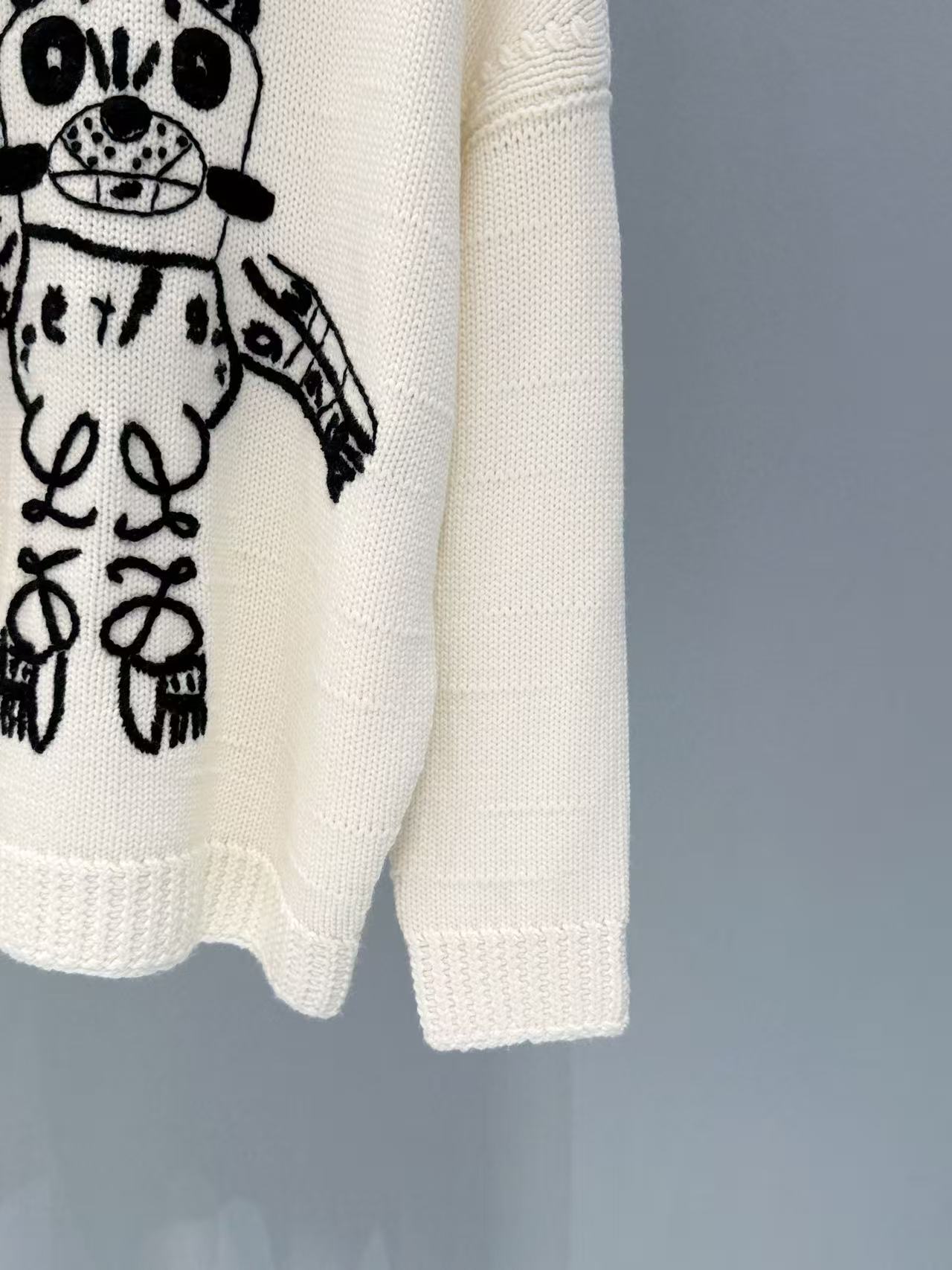 材質選用 100% 羊毛,觸感極致柔軟且親膚,完全沒有羊毛的紮身感,保暖度也非常優秀。設計亮點在於胸前那隻神態生動的擬人化熊貓,搭配經典的 Anagram 品牌刺繡,將童趣、藝術與奢華感融合得恰到好處。