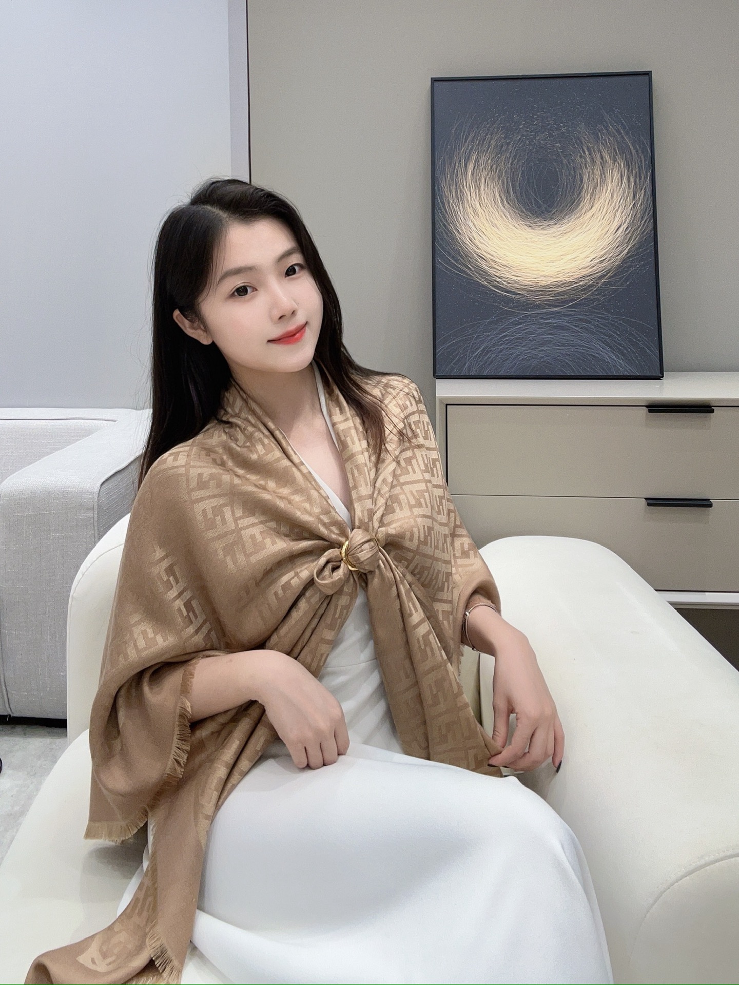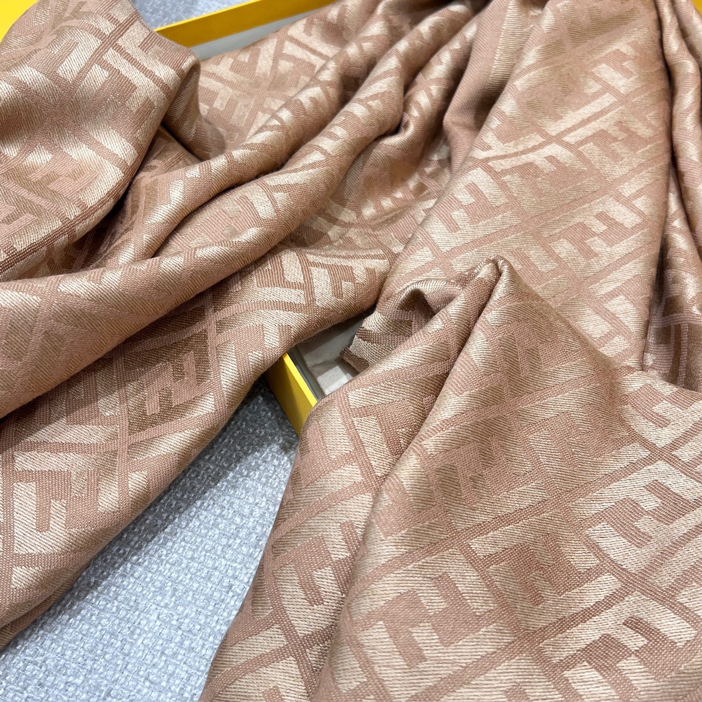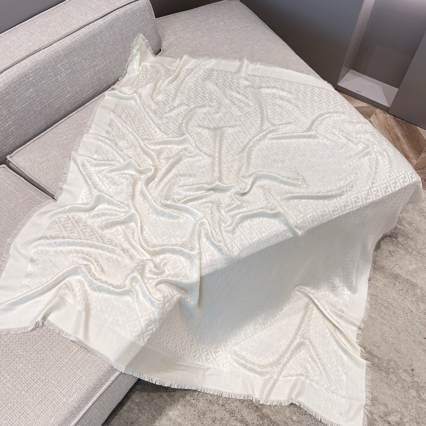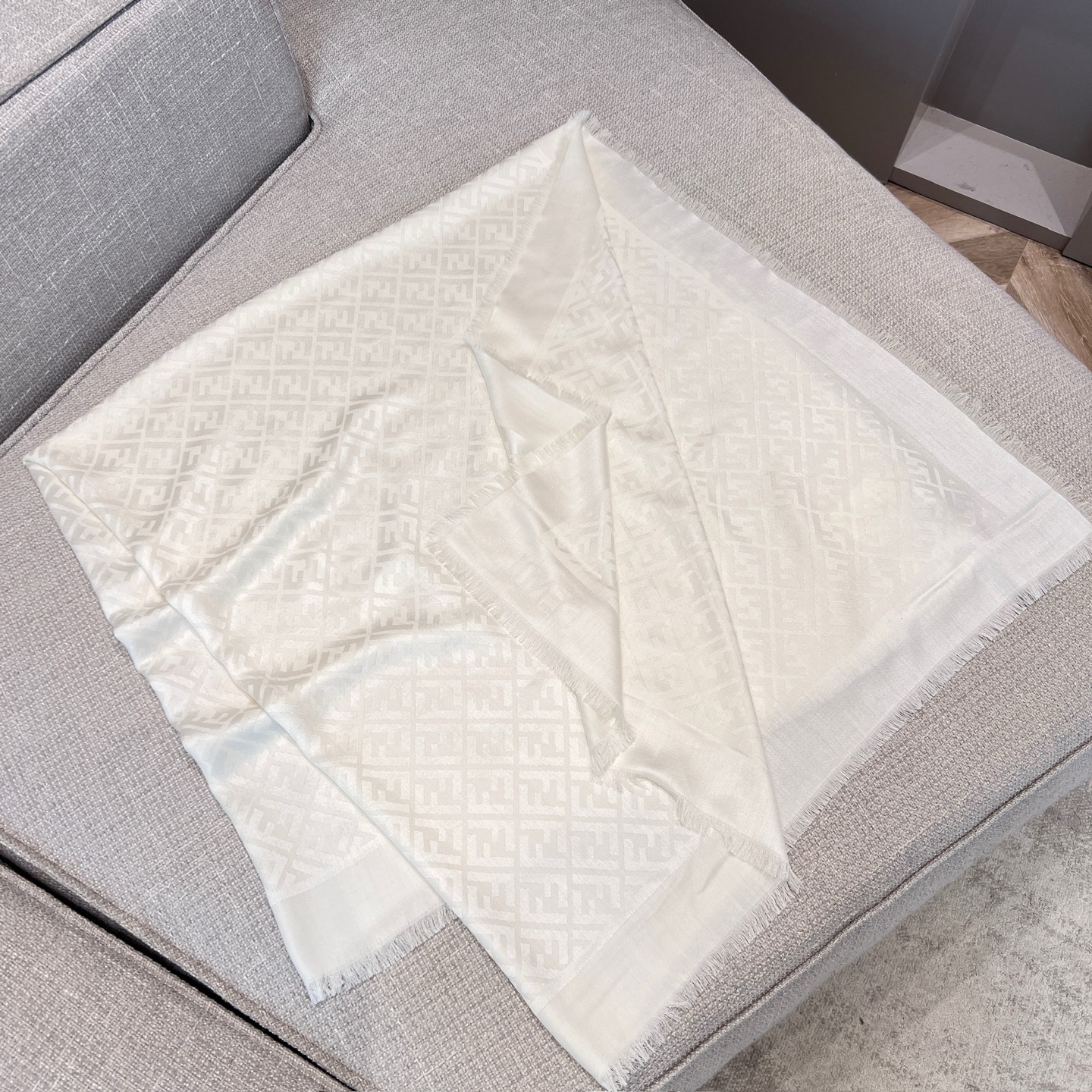 這條披肩真的是早秋穿搭中最不可或缺的一條!以經典雙 F 提花為主軸,結合細膩的織紋層次感,低調卻極具辨識度,無論是通勤、出遊還是約會都能輕鬆駕馭。