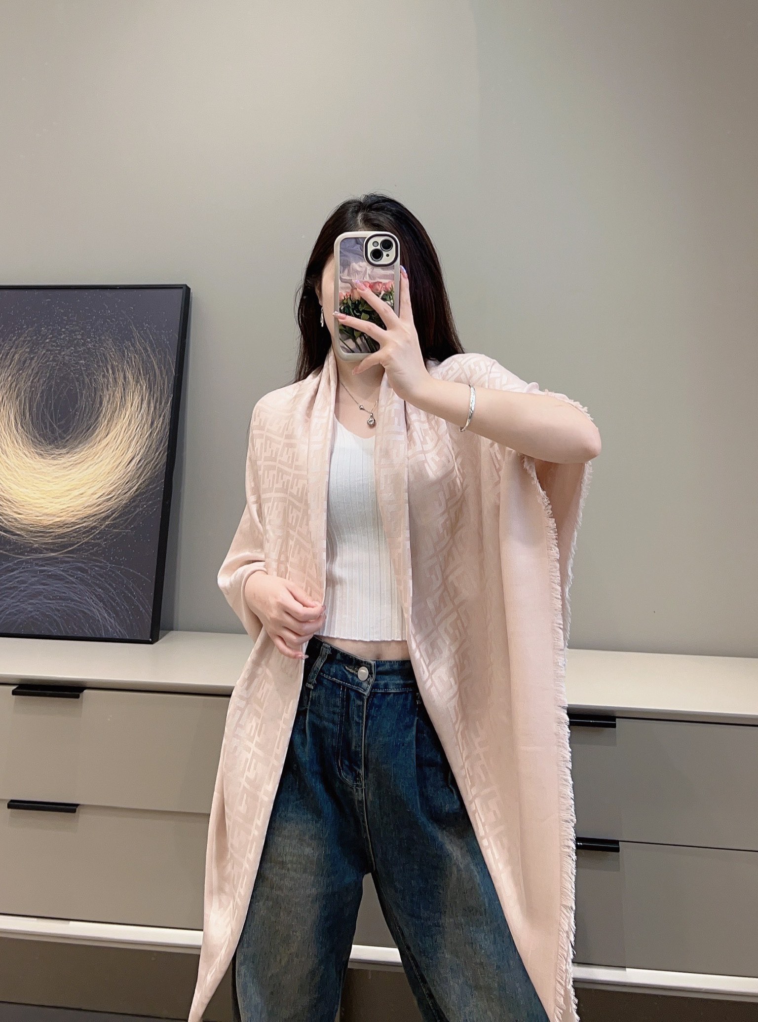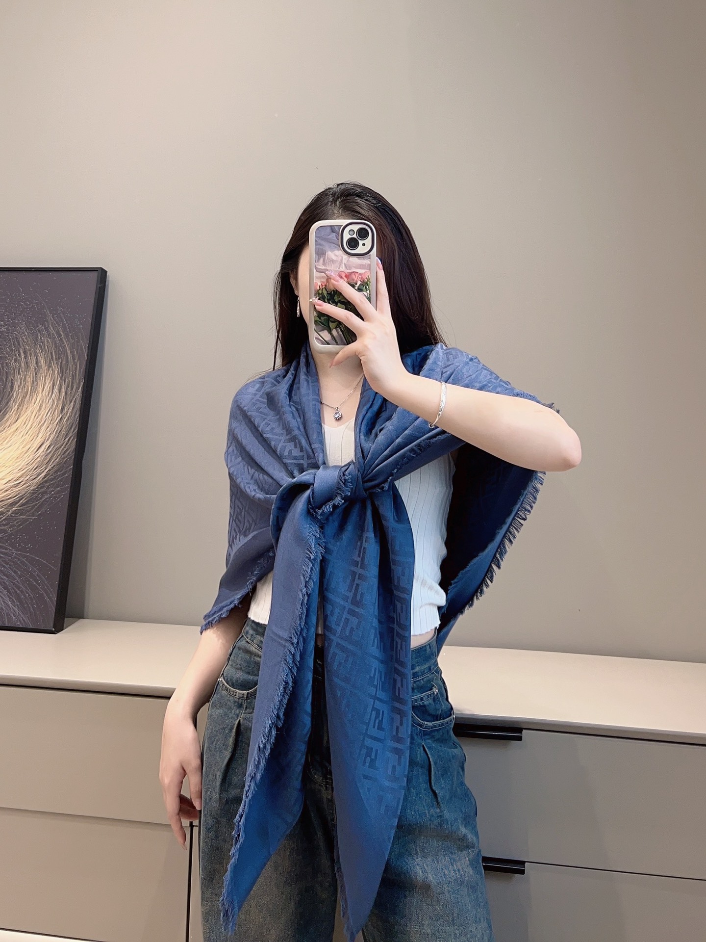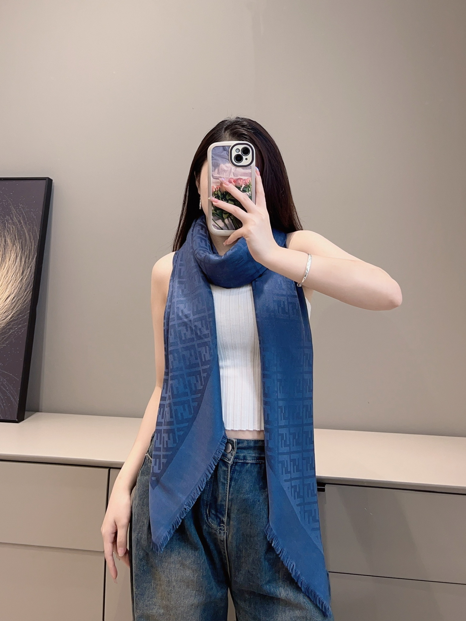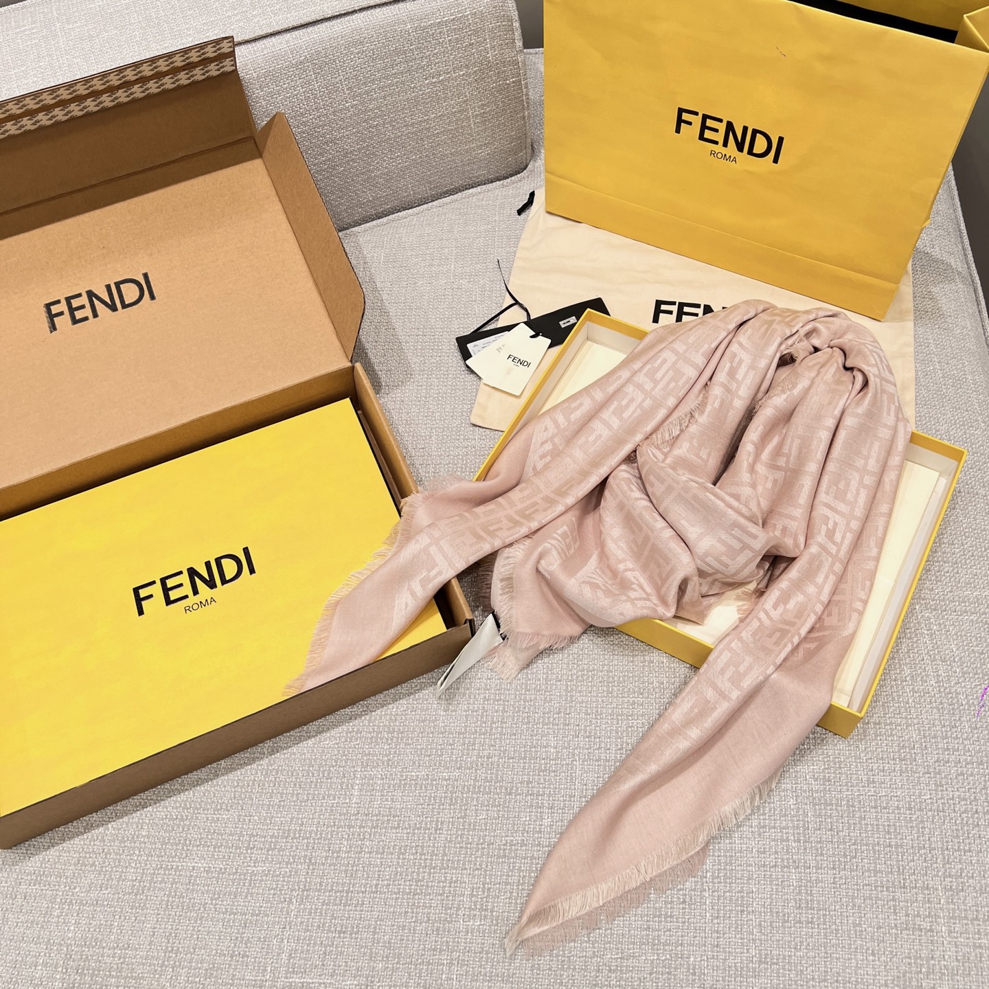 這條披肩真的是早秋穿搭中最不可或缺的一條!以經典雙 F 提花為主軸,結合細膩的織紋層次感,低調卻極具辨識度,無論是通勤、出遊還是約會都能輕鬆駕馭。