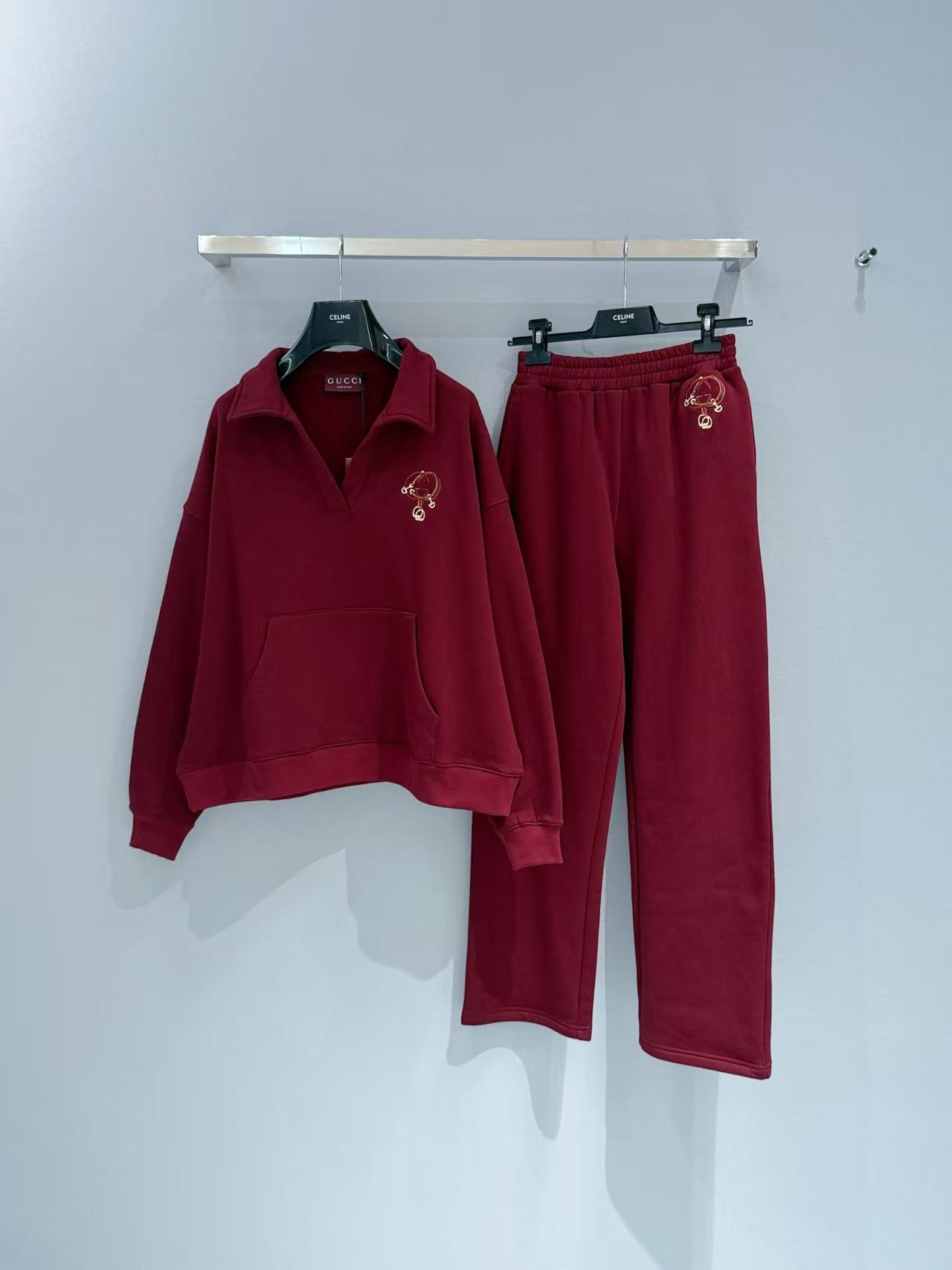 寬鬆剪裁把慵懶隨性直接拉滿,經典馬銜扣刺繡點綴在衣身與褲側,細膩針腳融入新年紅韻,低調卻超有辨識度!