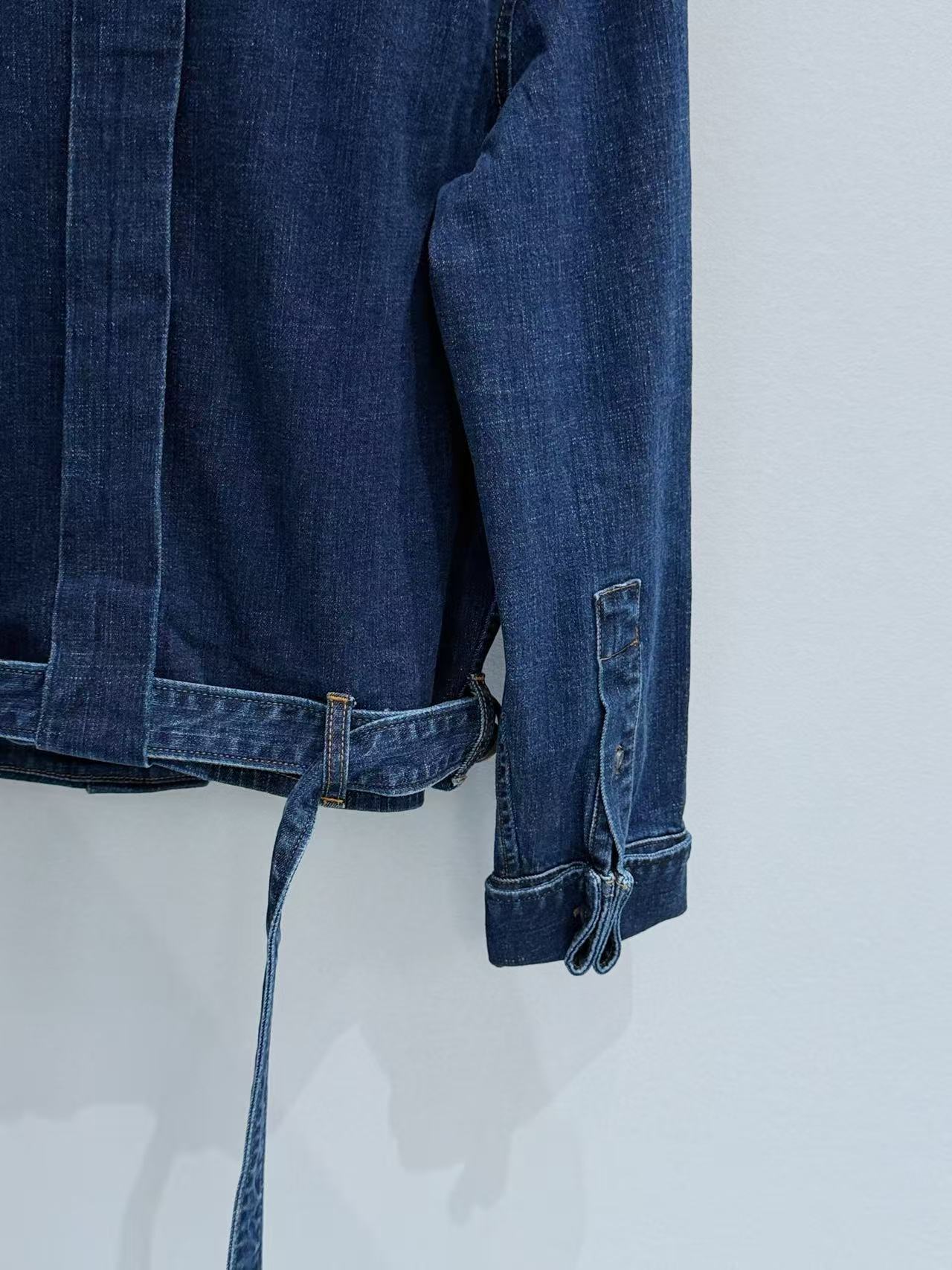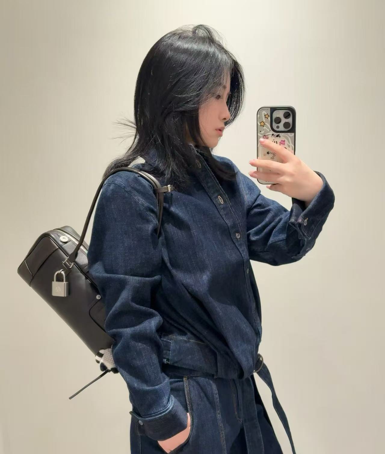 襯衫打破常規,採用了迷人的斜向側排扣設計,視覺上極具辨識度。最厲害的是腰部的金屬環扣搭配調節抽繩,輕輕一拉就能自然形成顯瘦的褶皺收腰效果,讓丹寧也能穿出精緻的曲線感。