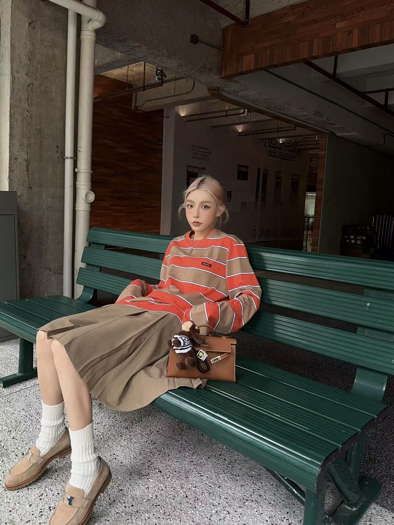 以橙棕色為主調,搭配經典條紋撞色,遠看像極了70年代的復古海報風格,卻又注入現代的俏皮能量!