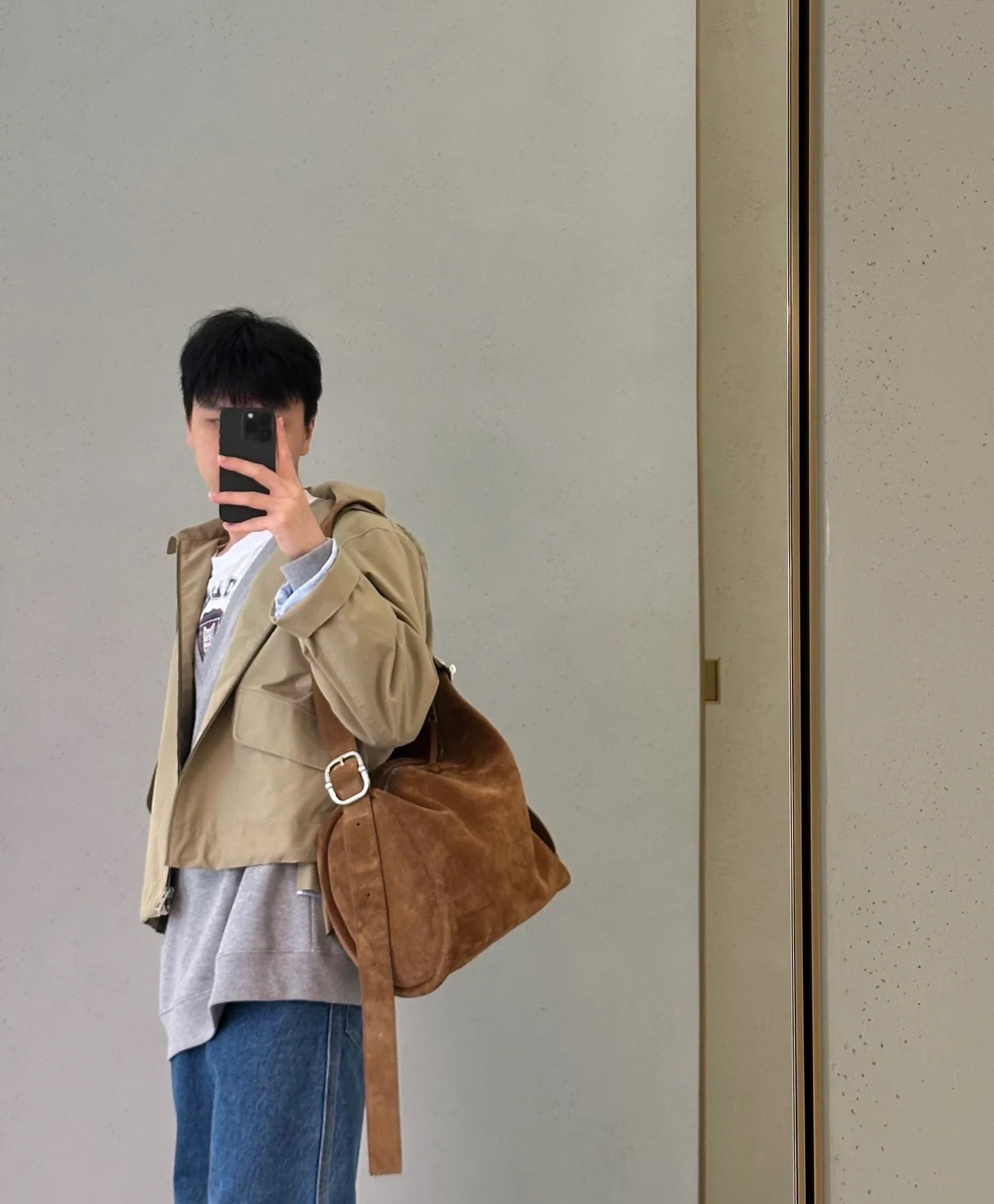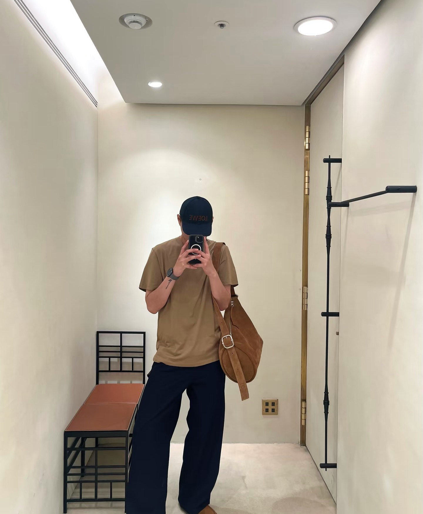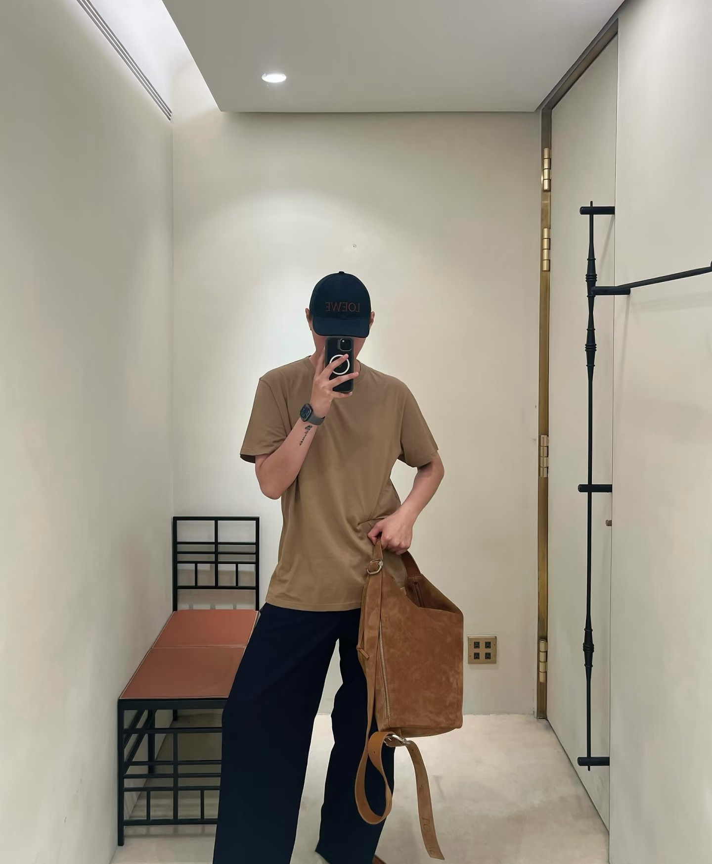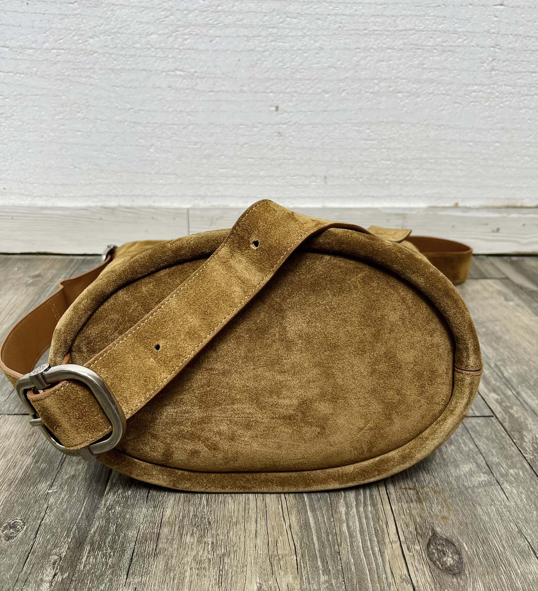 主體選用淺棕色麂皮,觸感柔軟,帶有天然的霧面光澤,營造復古氛圍。拼接小牛皮讓包包更具挺度與細緻質感。