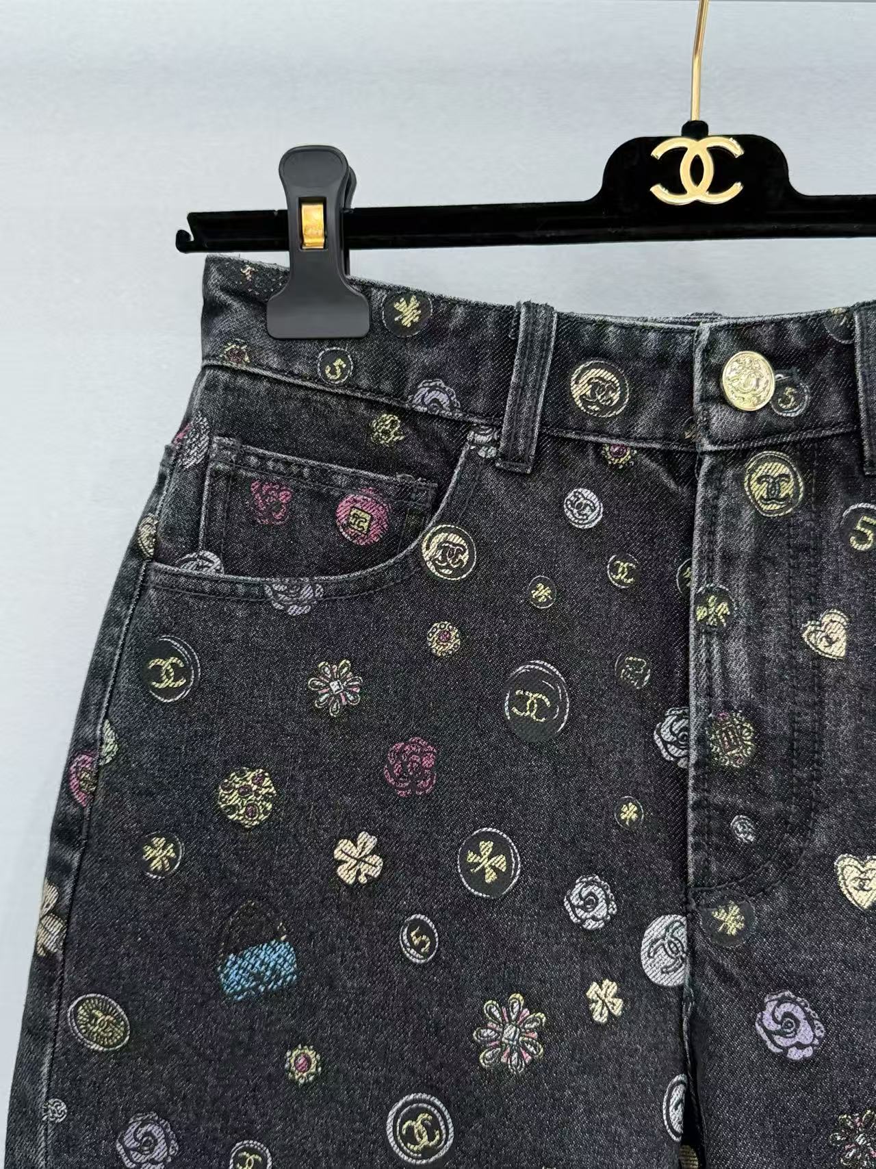 整件褲子佈滿了經典的雙 C 與山茶花元素,卻因為黑灰色的多重做舊工藝,顯得低調帥氣而不失高級感。