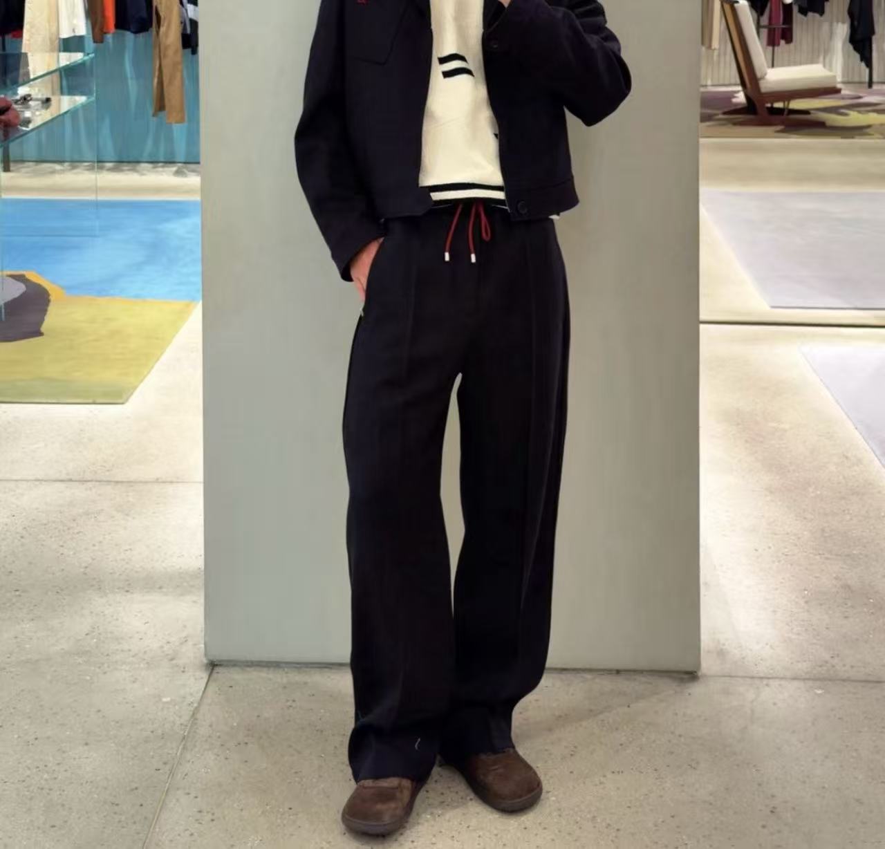 這款長褲在版型與細節處展現了極致的「平衡感」。採用最受推崇的中腰垂直運動版型,不僅能有效修飾腿部線條,更營造出不費力的鬆弛感。腰頭處特別選用紅棕色抽繩與松緊帶設計,在極簡的視覺中點綴出溫潤的層次跳色,讓舒適度與設計感並存。