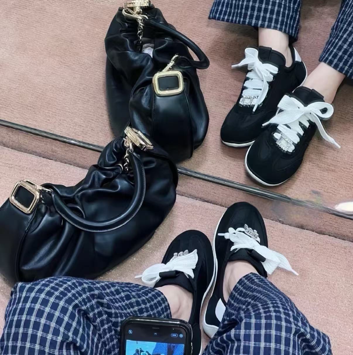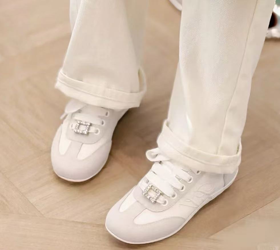 這雙鞋子完美詮釋了巴黎左岸的優雅風尚。它結合了運動鞋的舒適與精緻,鞋面使用了進口真絲和進口麂皮,側邊飾有刺繡字母組合,正面還有標誌性的迷你金屬搭扣,上面還綴有方形閃鑽,經典又華麗,貴氣十足!