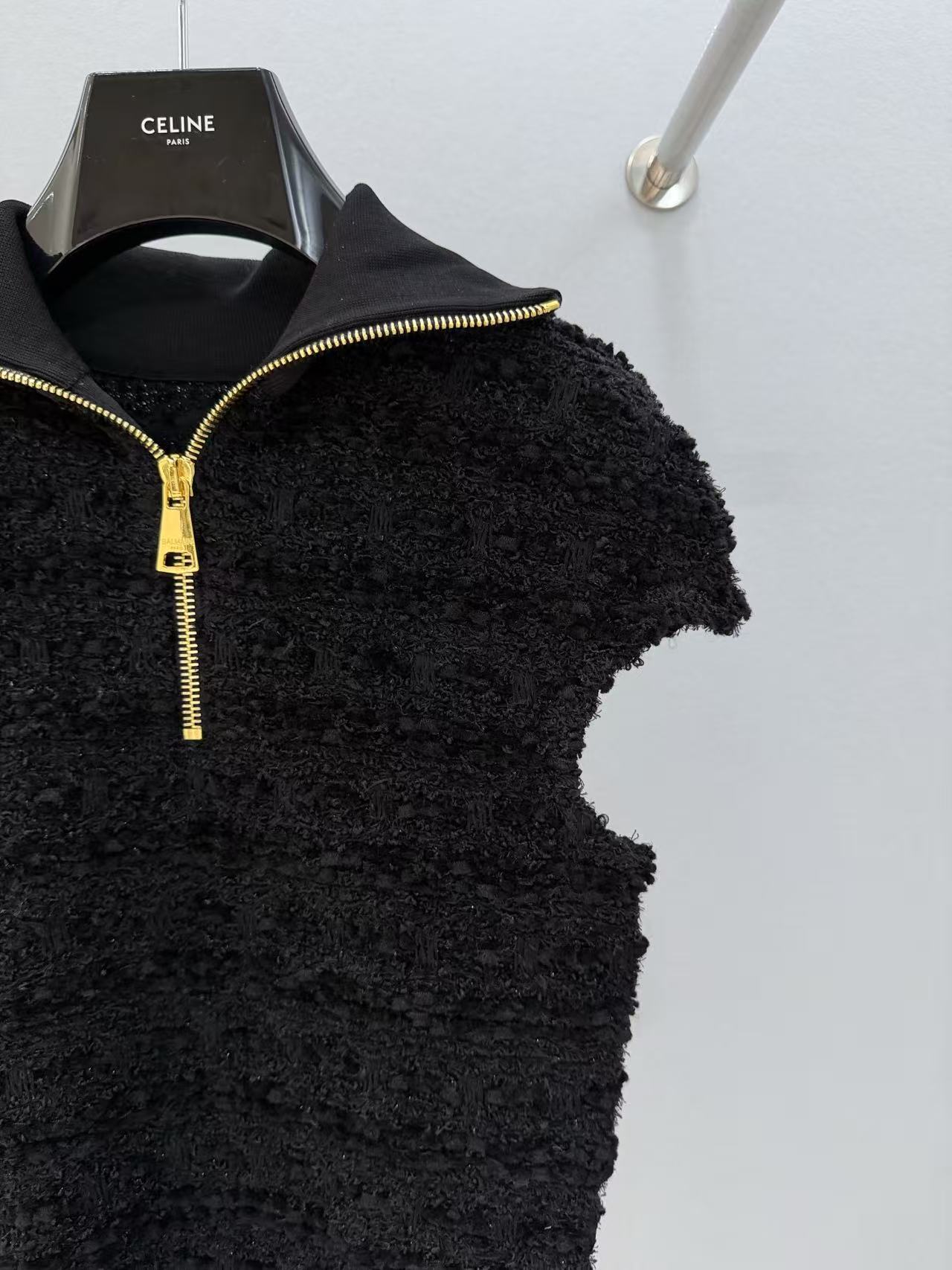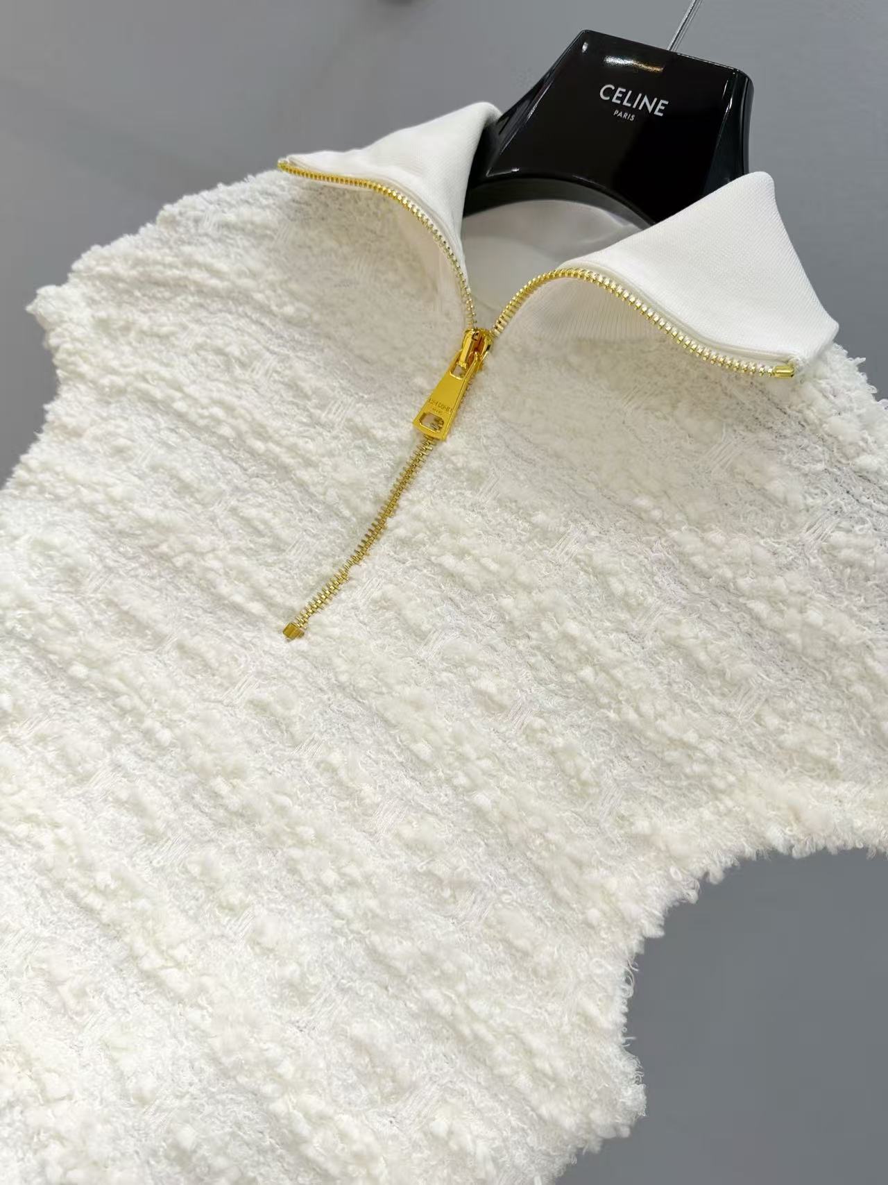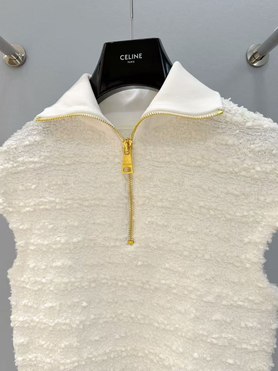 設計走極簡風,前片一條金色細拉鍊從領口一路到底,隨手拉開就是小V領,拉上又變高領,變化超級實用;無袖剪裁俐落,側邊還有輕微收腰線條,穿起來完全不會像水桶。肩線剛好,長度蓋住褲頭,顯腿長又隨性。