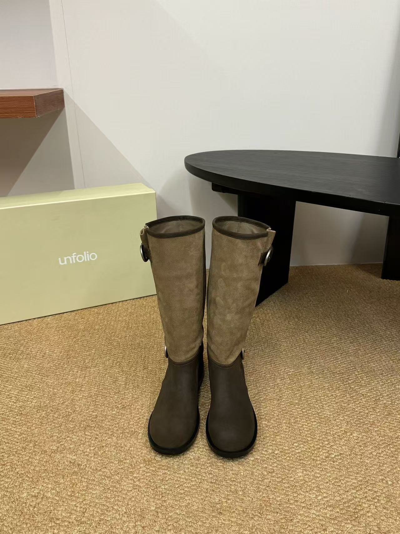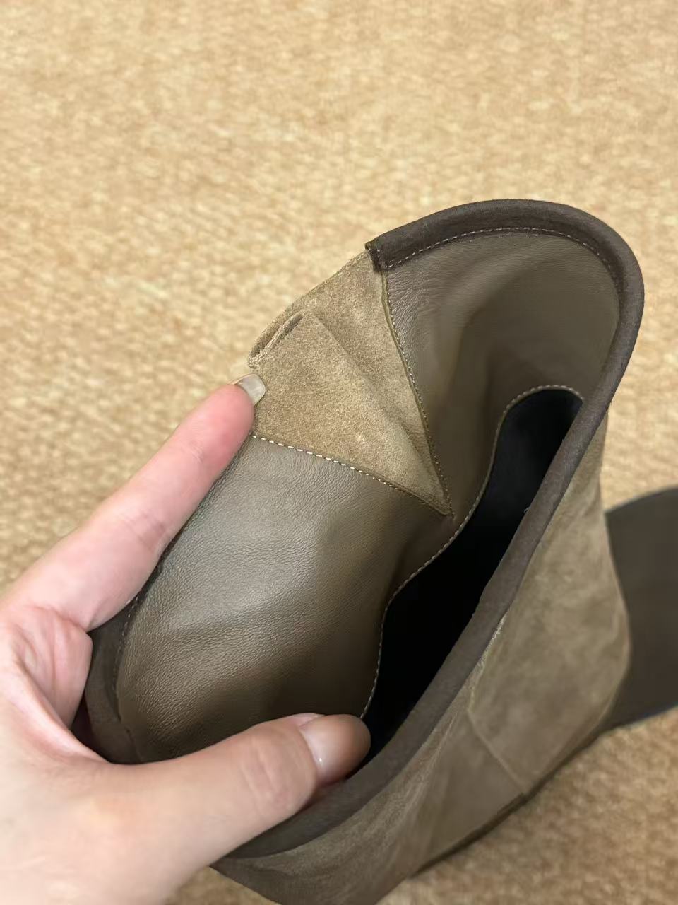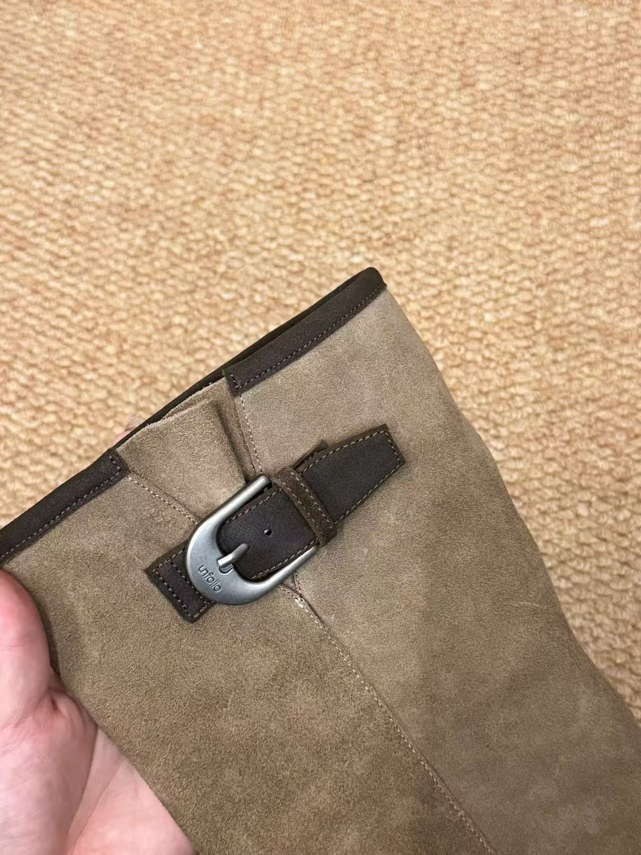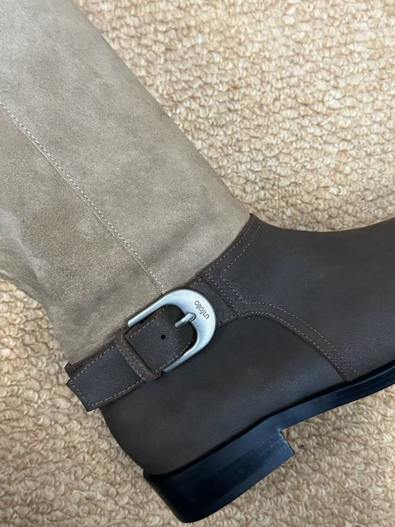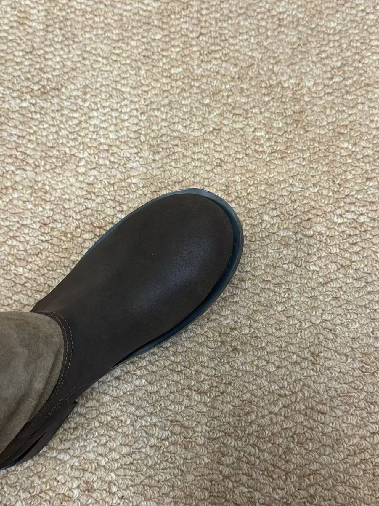 牛反絨觸感細膩到犯規,羊裡包腳零負擔,橡膠大底防滑又耐走。及膝線條拉長腿部比例,側面零多餘設計,低調卻自帶氣場。