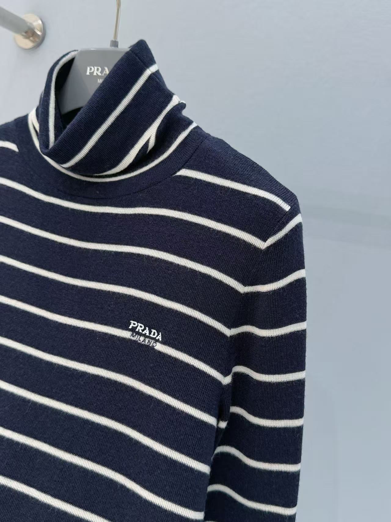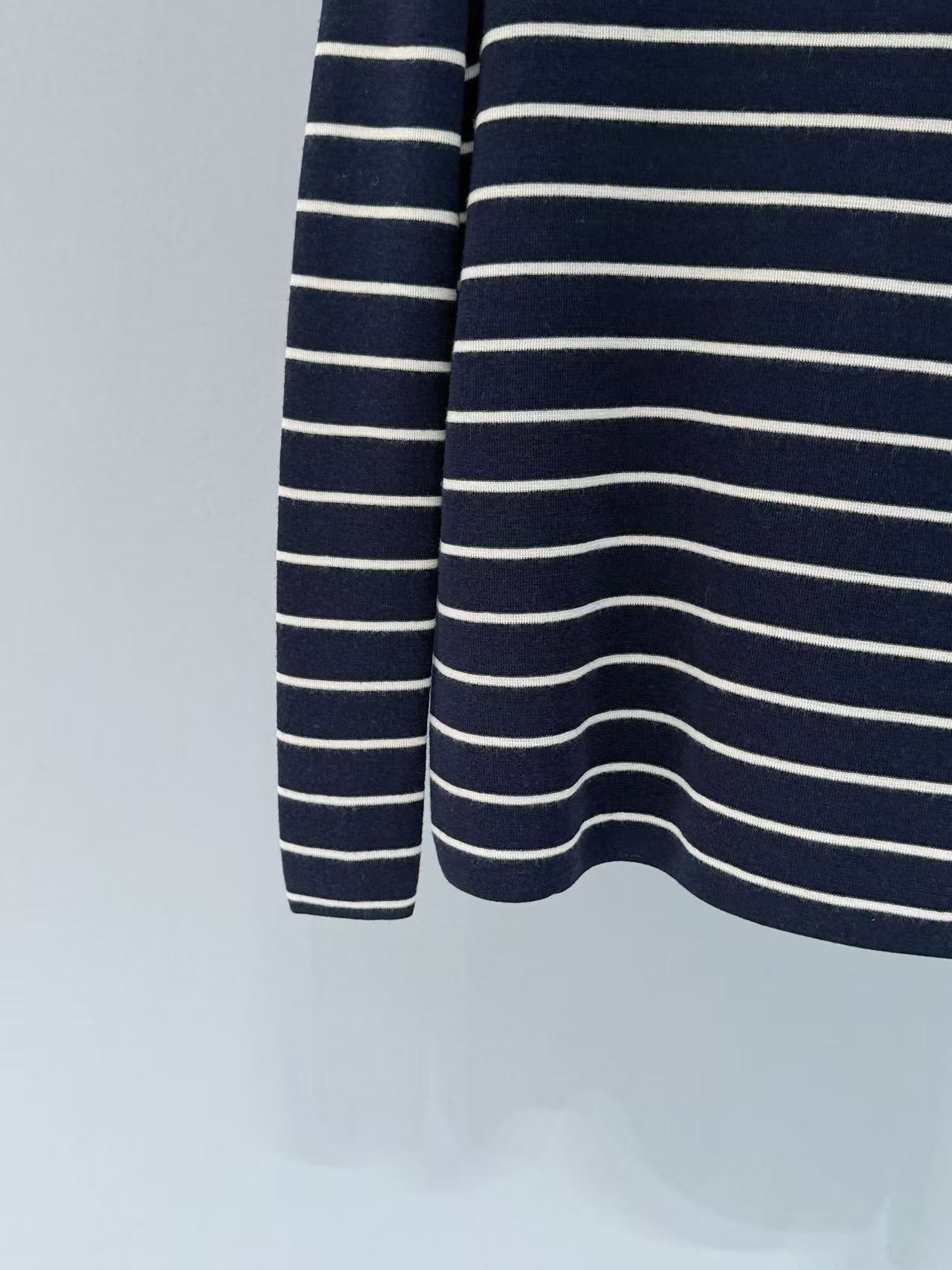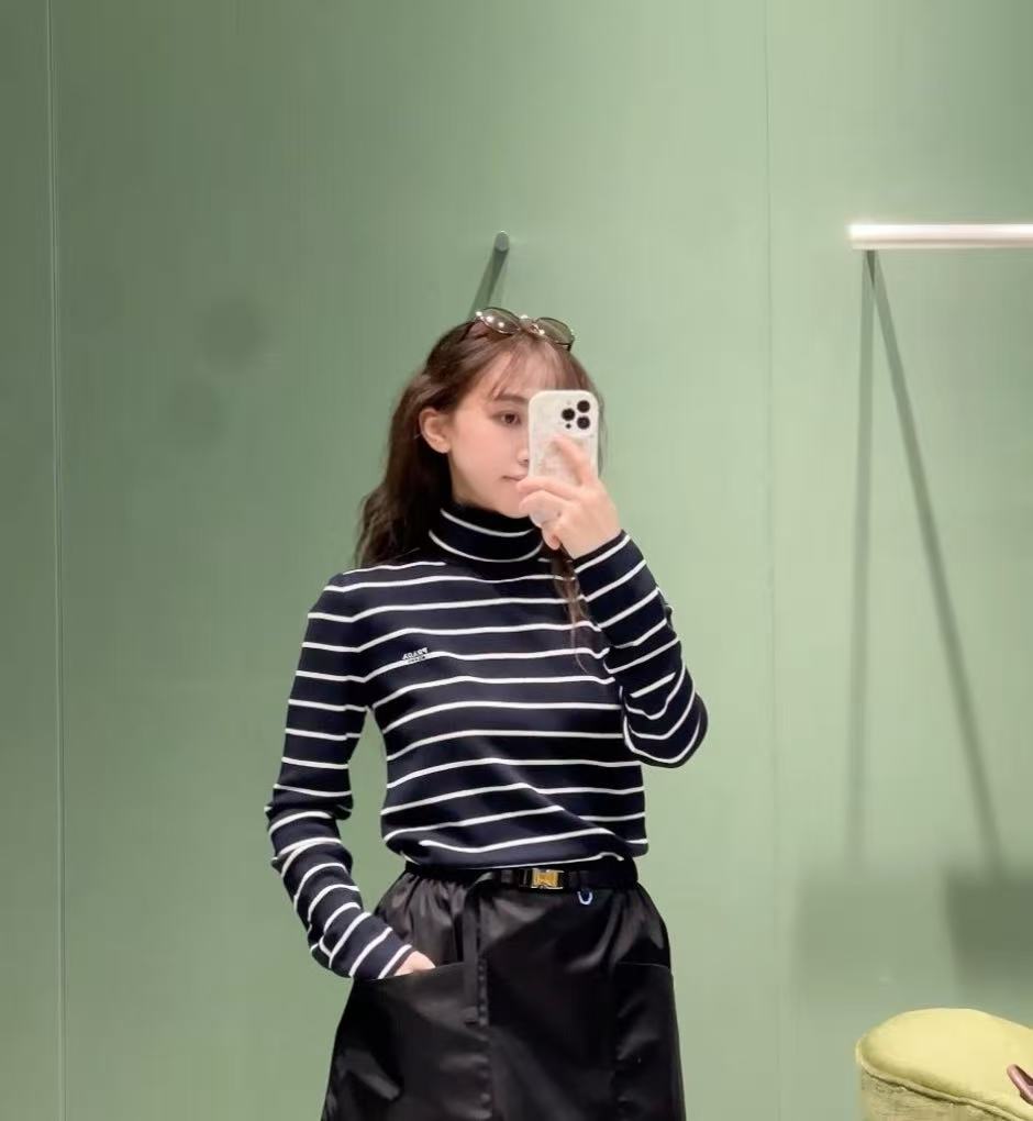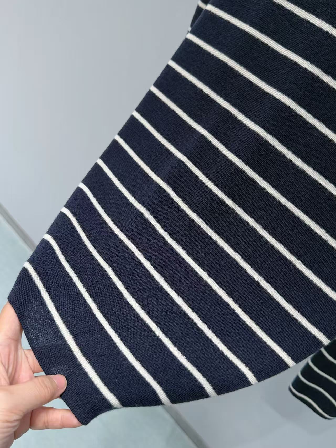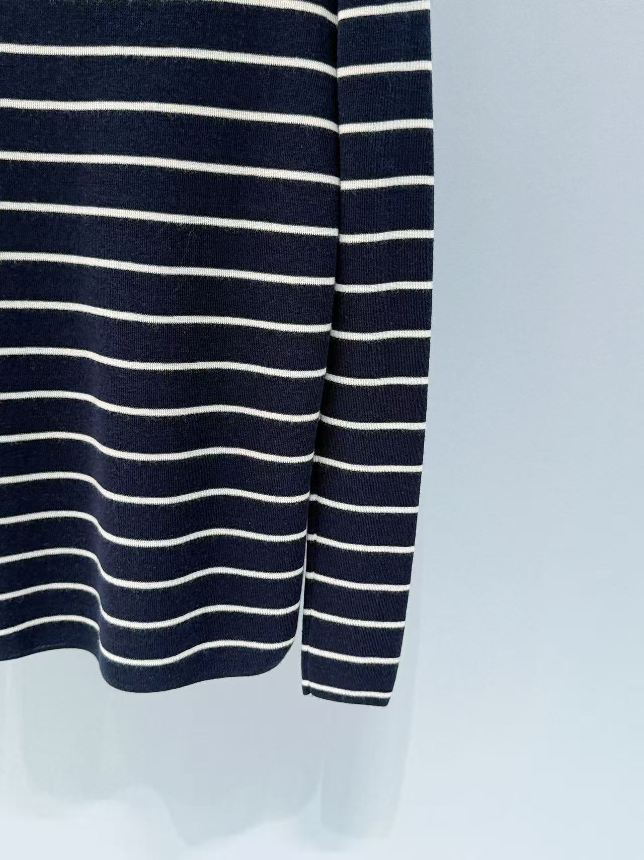 經典黑白條紋搭配高領設計,簡約卻充滿高級感,胸前的小 Logo 低調點綴,完美彰顯品牌調性。