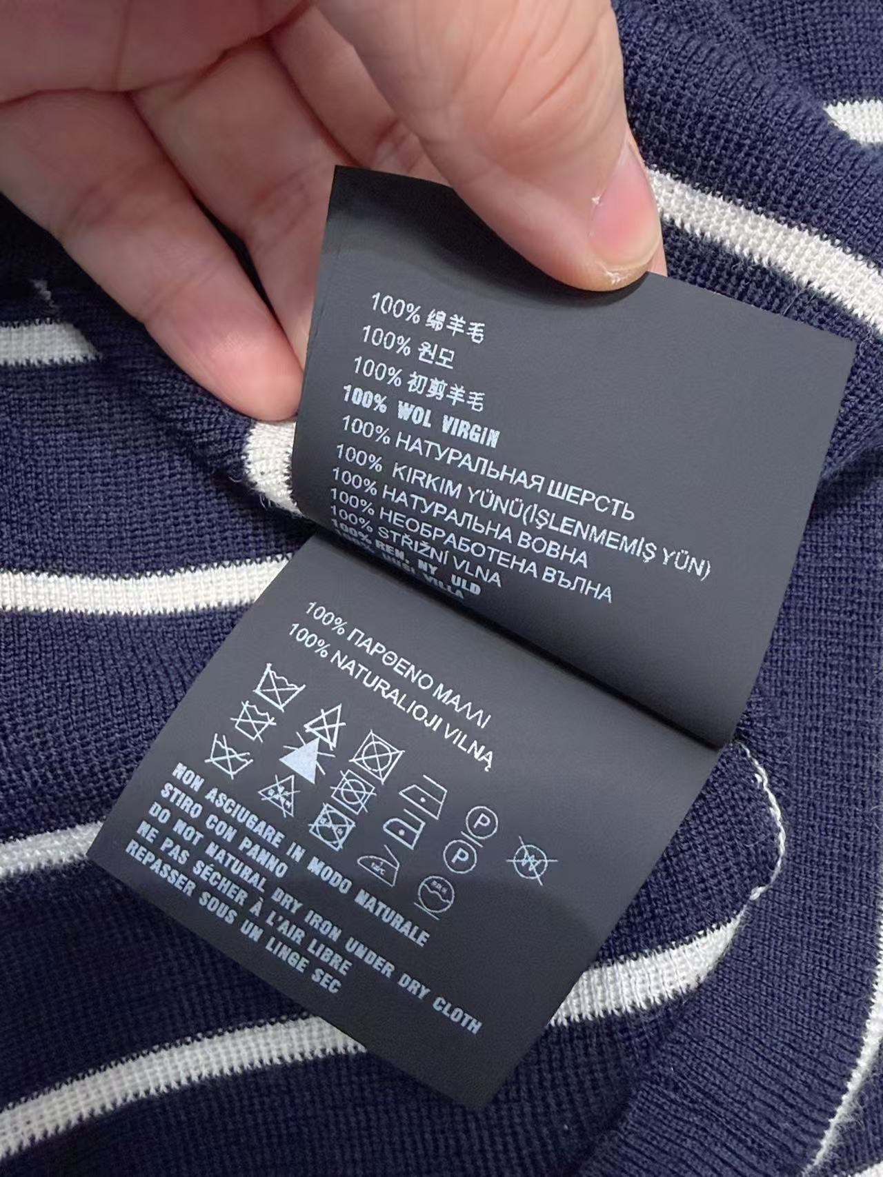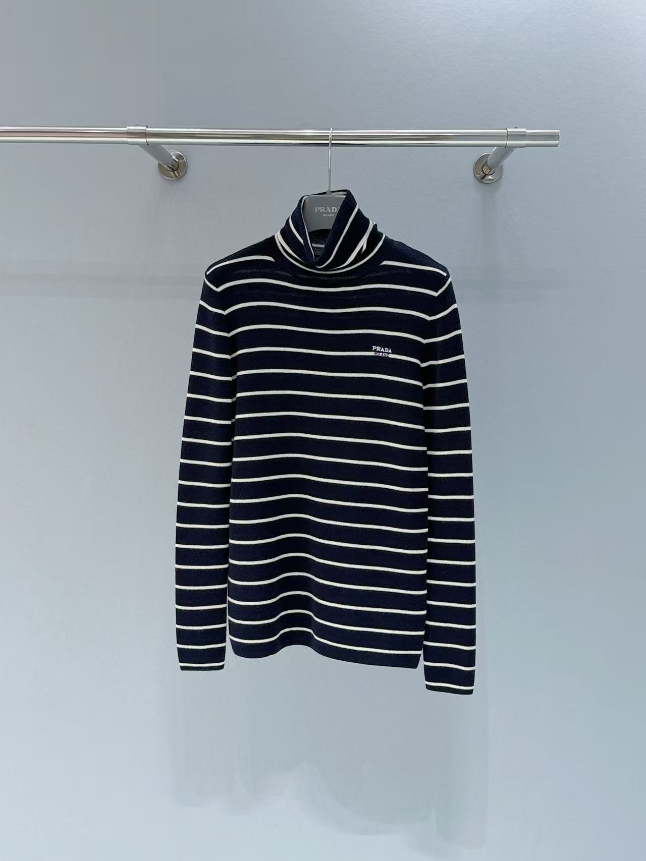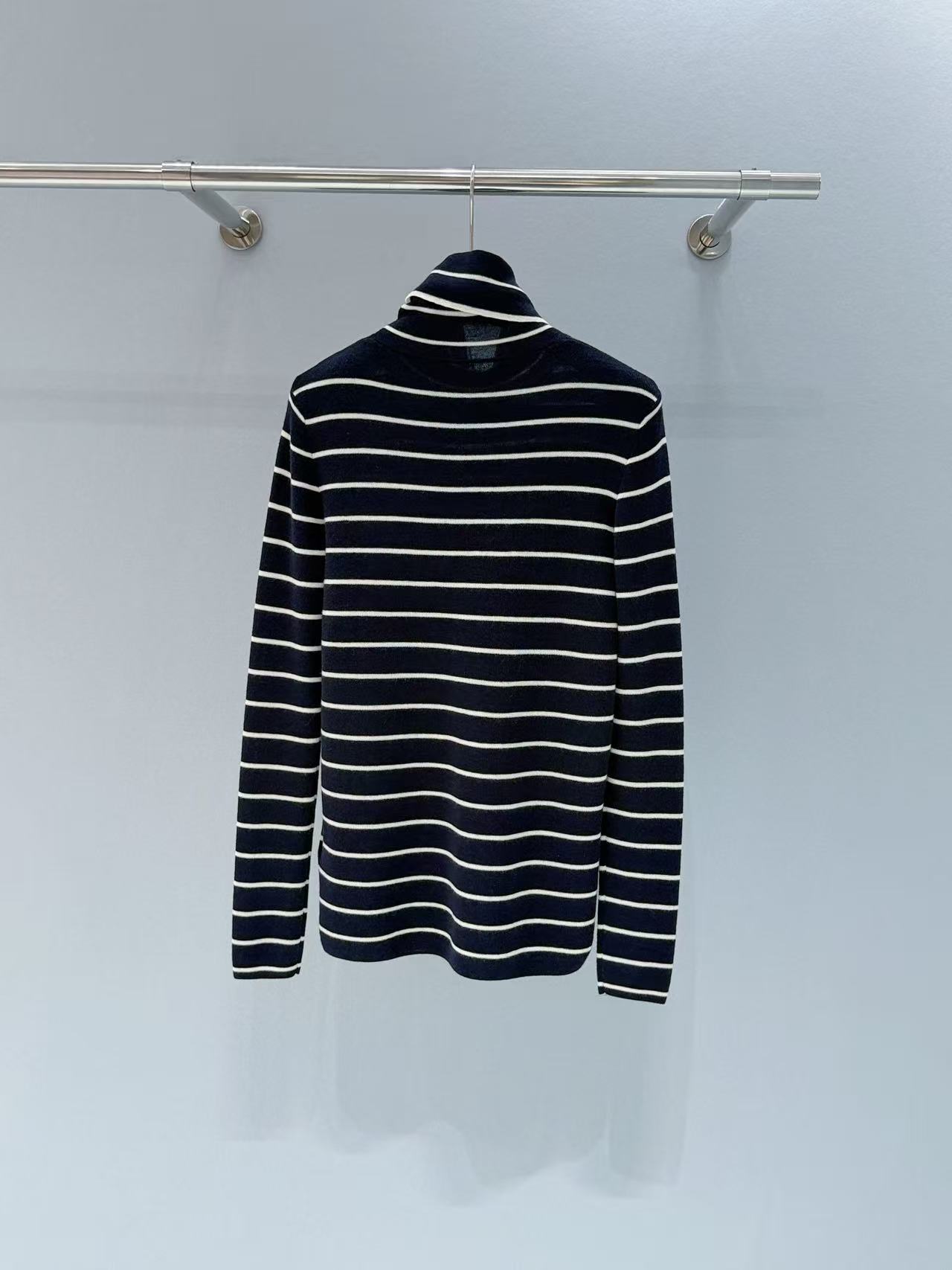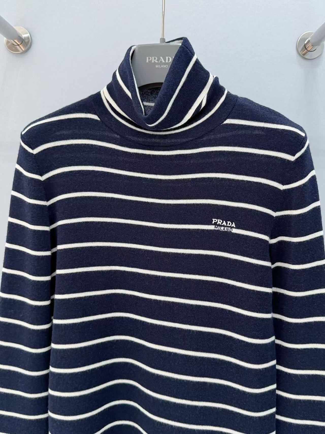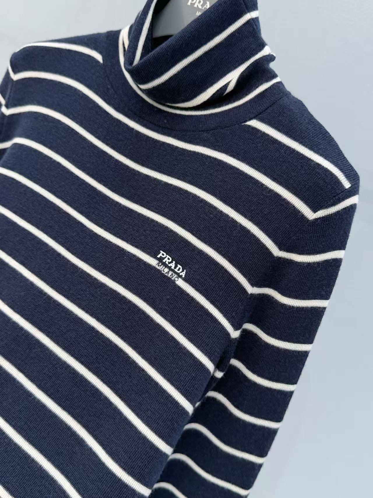 經典黑白條紋搭配高領設計,簡約卻充滿高級感,胸前的小 Logo 低調點綴,完美彰顯品牌調性。
