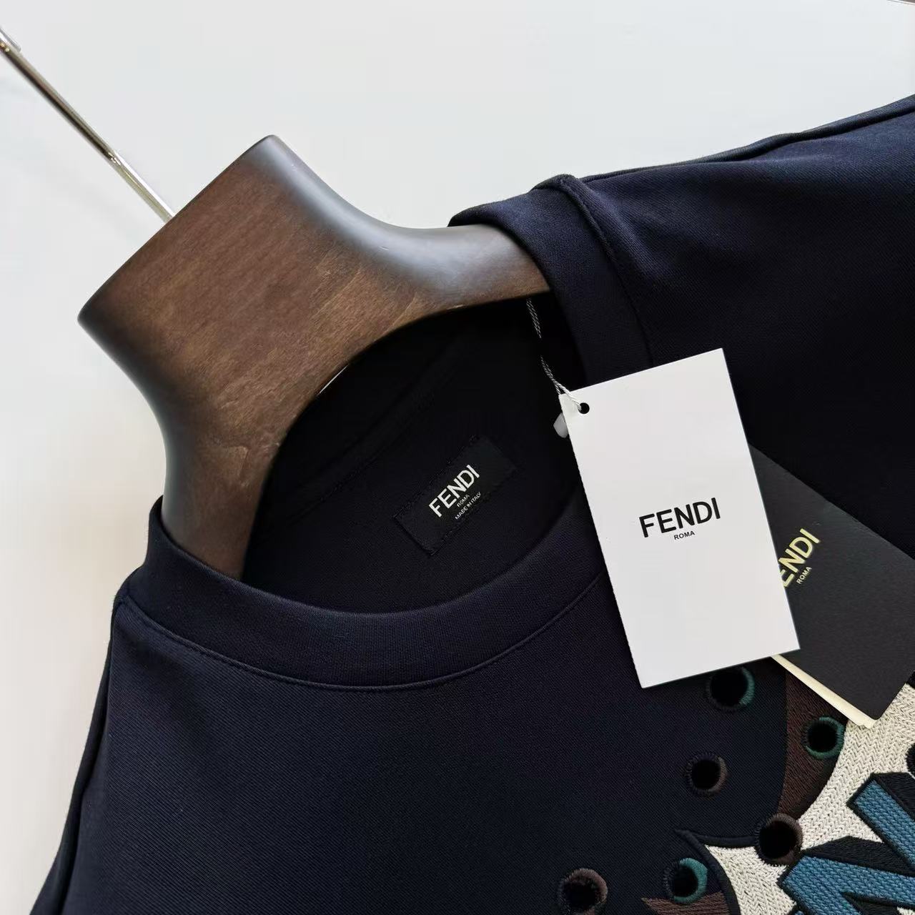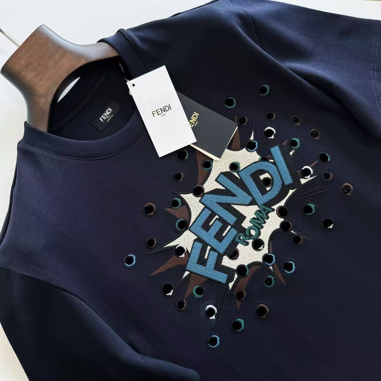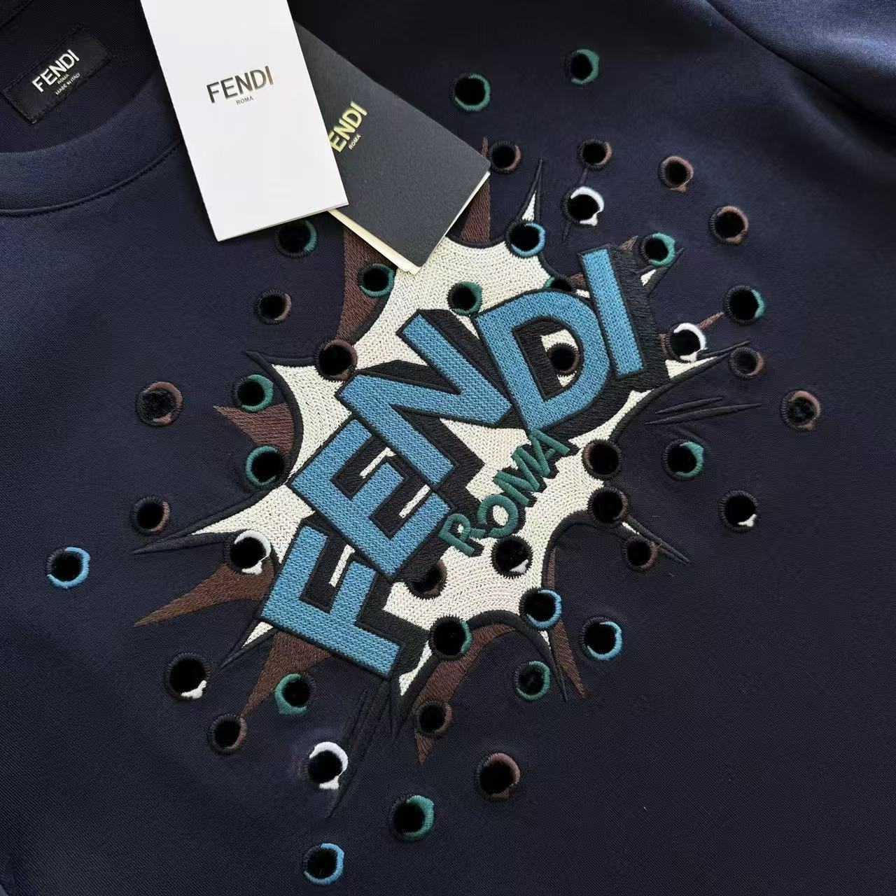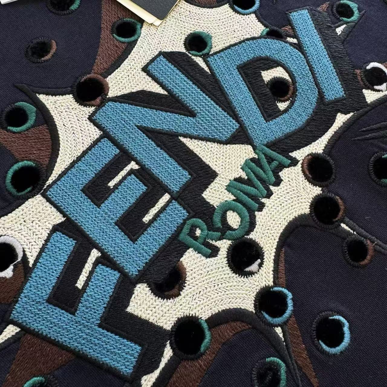 最瘋狂的當然是胸前那塊「撞色Boompop立體貼布繡」!不是普通電腦繡,而是先把布料裁成特定形狀固定,再用繡線一圈圈鎖邊+內部細化,摸起來厚厚一層超有份量,立體到光線打過去會有陰影,動一下還會跟著晃,細節變態到讓強迫症直接淚崩~