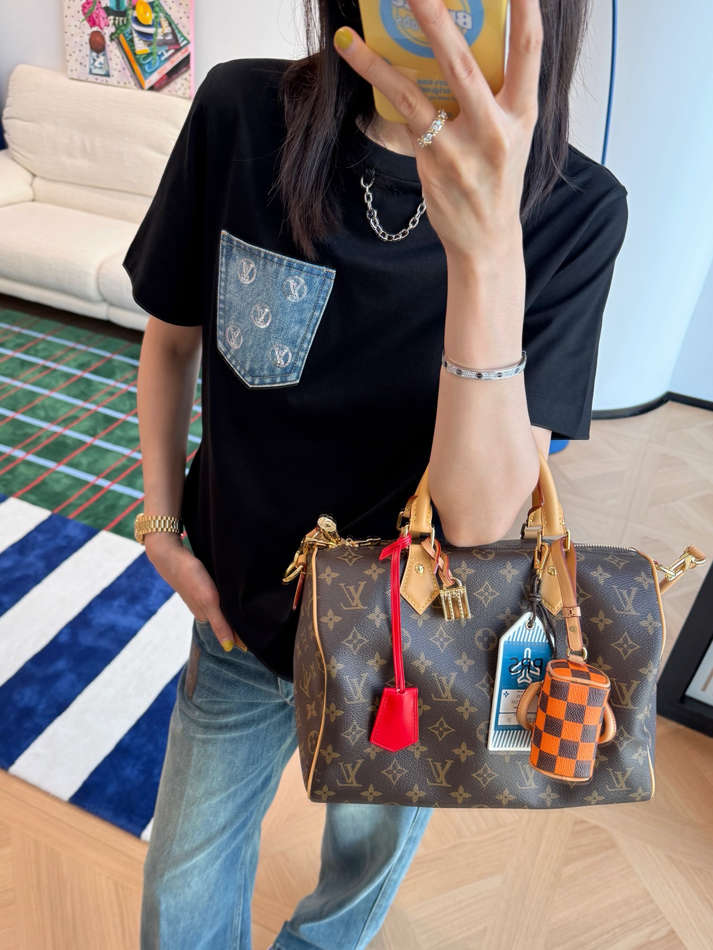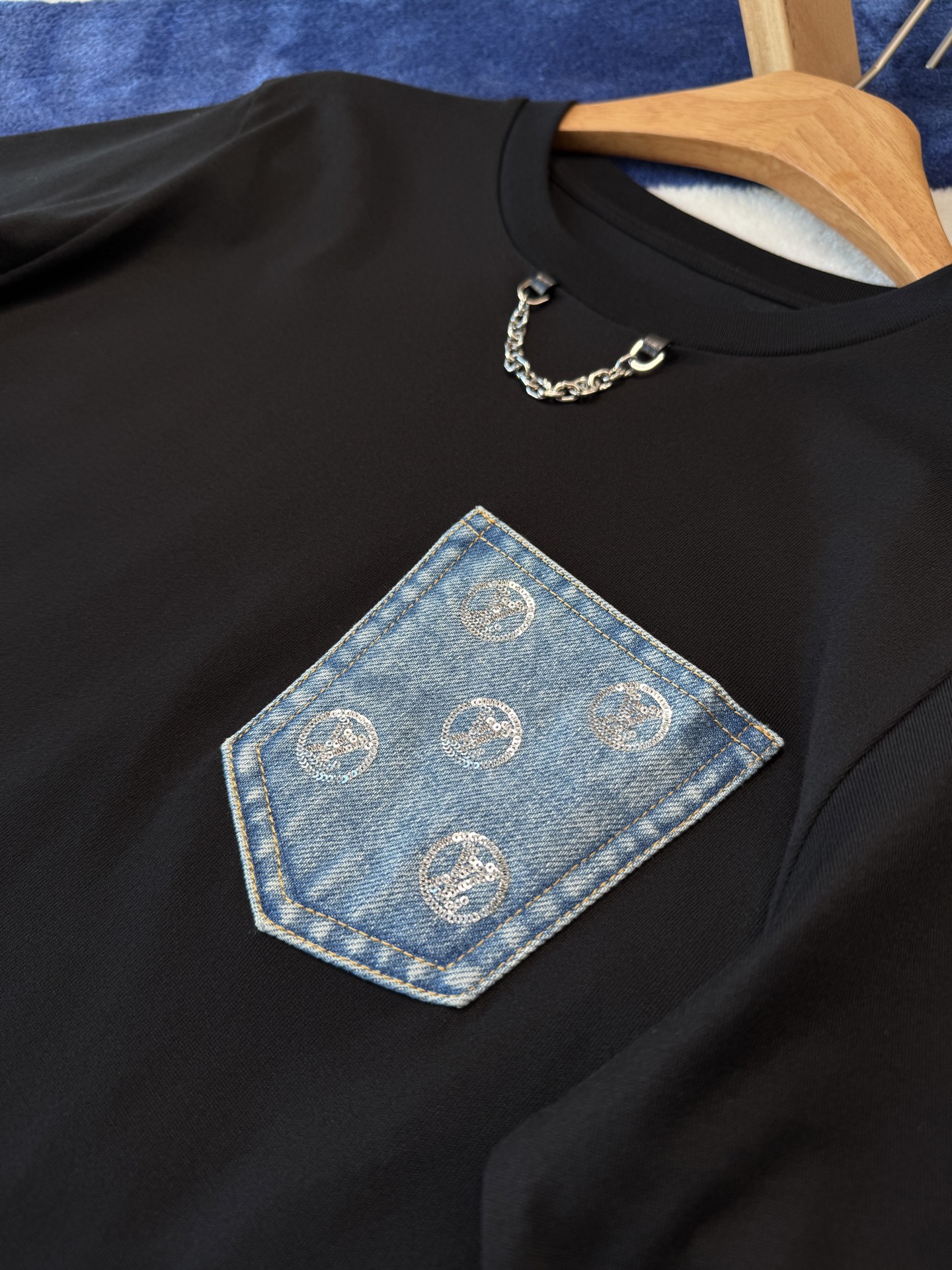 胸前的丹寧口袋+珠片點綴 是這件的亮點,看似低調,卻悄悄提升整體精緻度,讓基礎款多了一點亮眼細節。