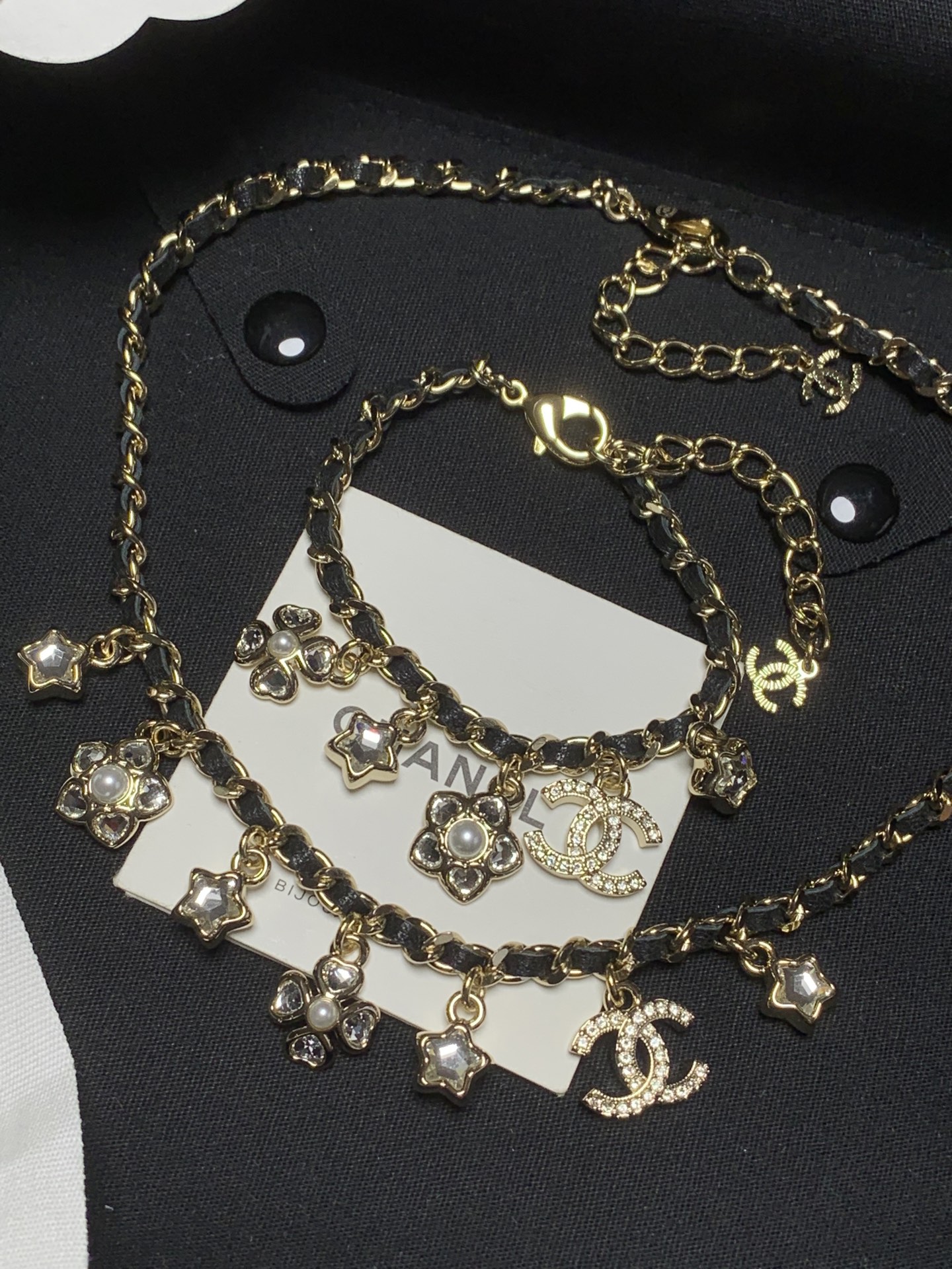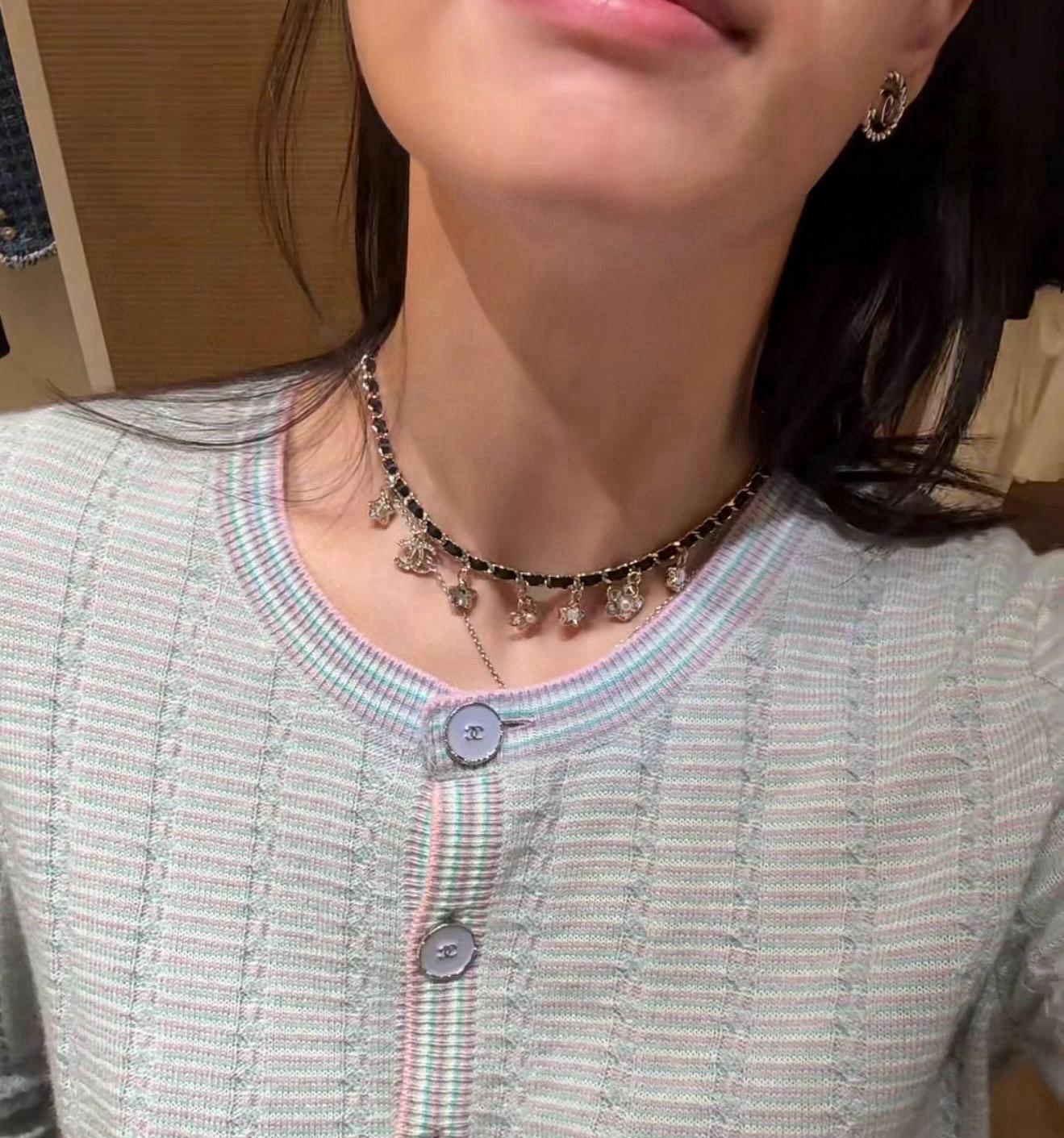 項鍊整體線條纖細優雅,以愛心、星星、四葉草、山茶花與經典雙C皮穿鏈元素為主視覺,層層堆疊的設計,讓配戴時更加靈動。