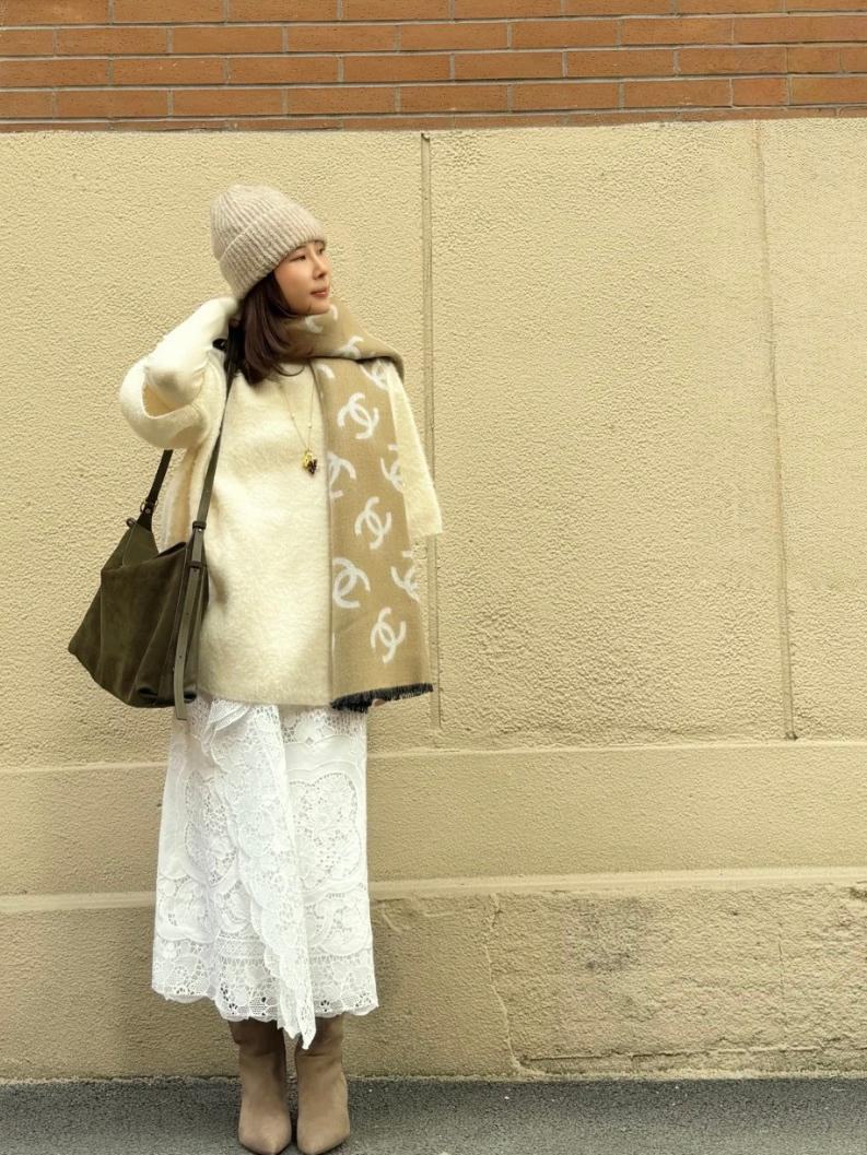 大面積輕柔垂墜的設計,無論是隨性披在肩上、繞一圈當圍巾,還是搭配大衣外套,都能瞬間讓整體穿搭變得更精緻。