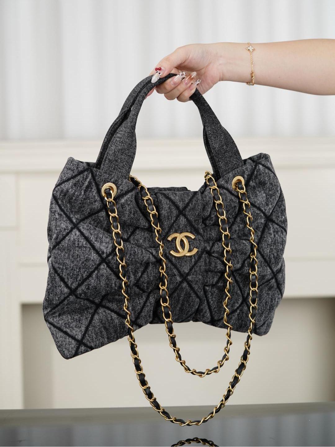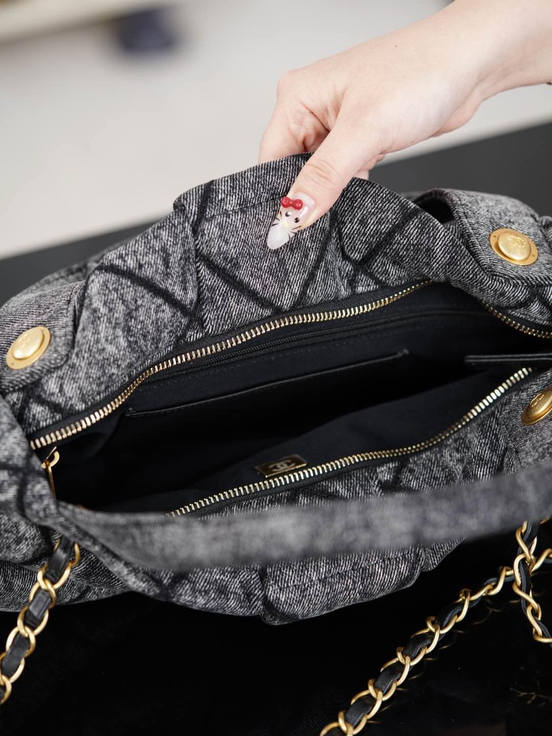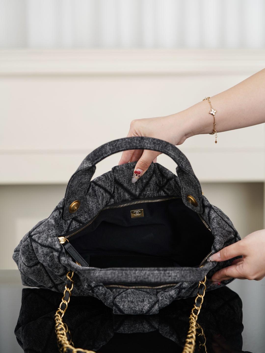 五金部分使用純銅厚鍍砂金工藝,表面帶有斑駁做舊感,與皮穿鏈設計相得益彰。雙C刻印清晰,細節質感拉滿。內裡採用黑色棉質布料,耐磨又好打理,並設有拉鍊隔層,收納更實用。