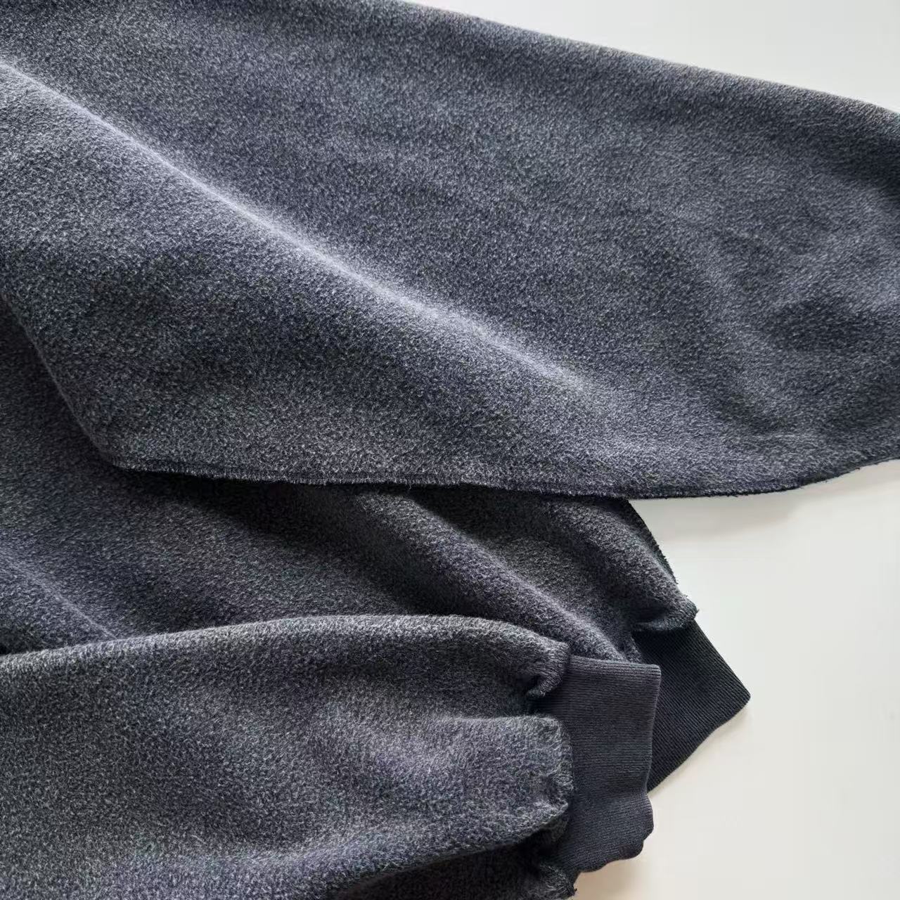 顏色走定織定染洗水褪色灰,成衣再下炒鹽機——面料跟粗鹽高溫翻滾,鹽粒均勻摩擦吸走染料,褪色不過度又帶自然磨白,邊緣輕微泛白,整體過渡柔和,像穿了幾年卻依然乾淨的老衣,復古味撲鼻而來。