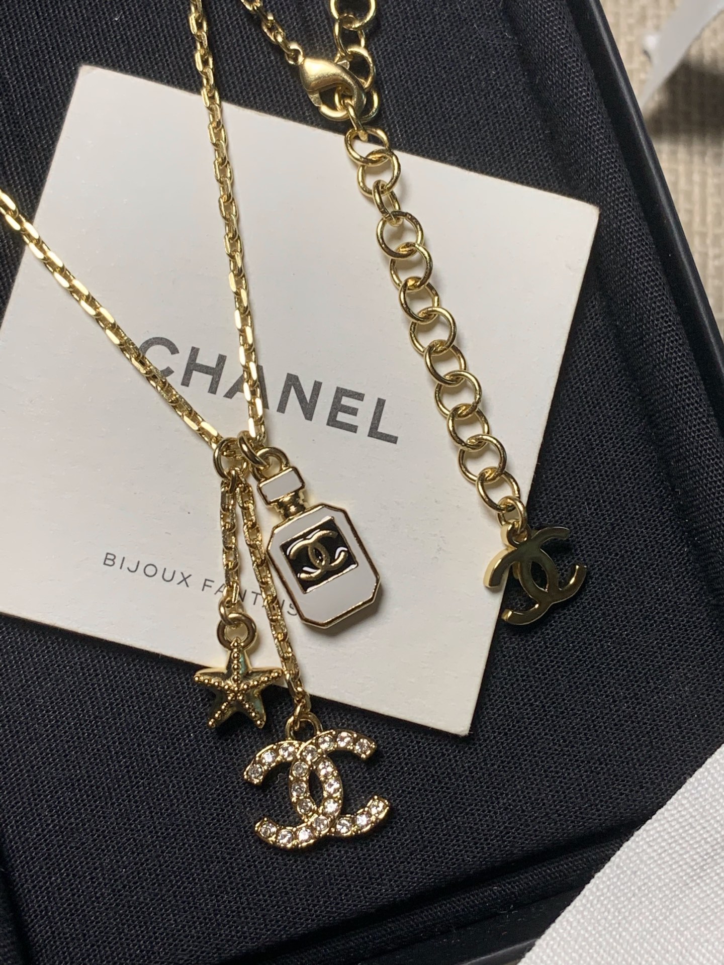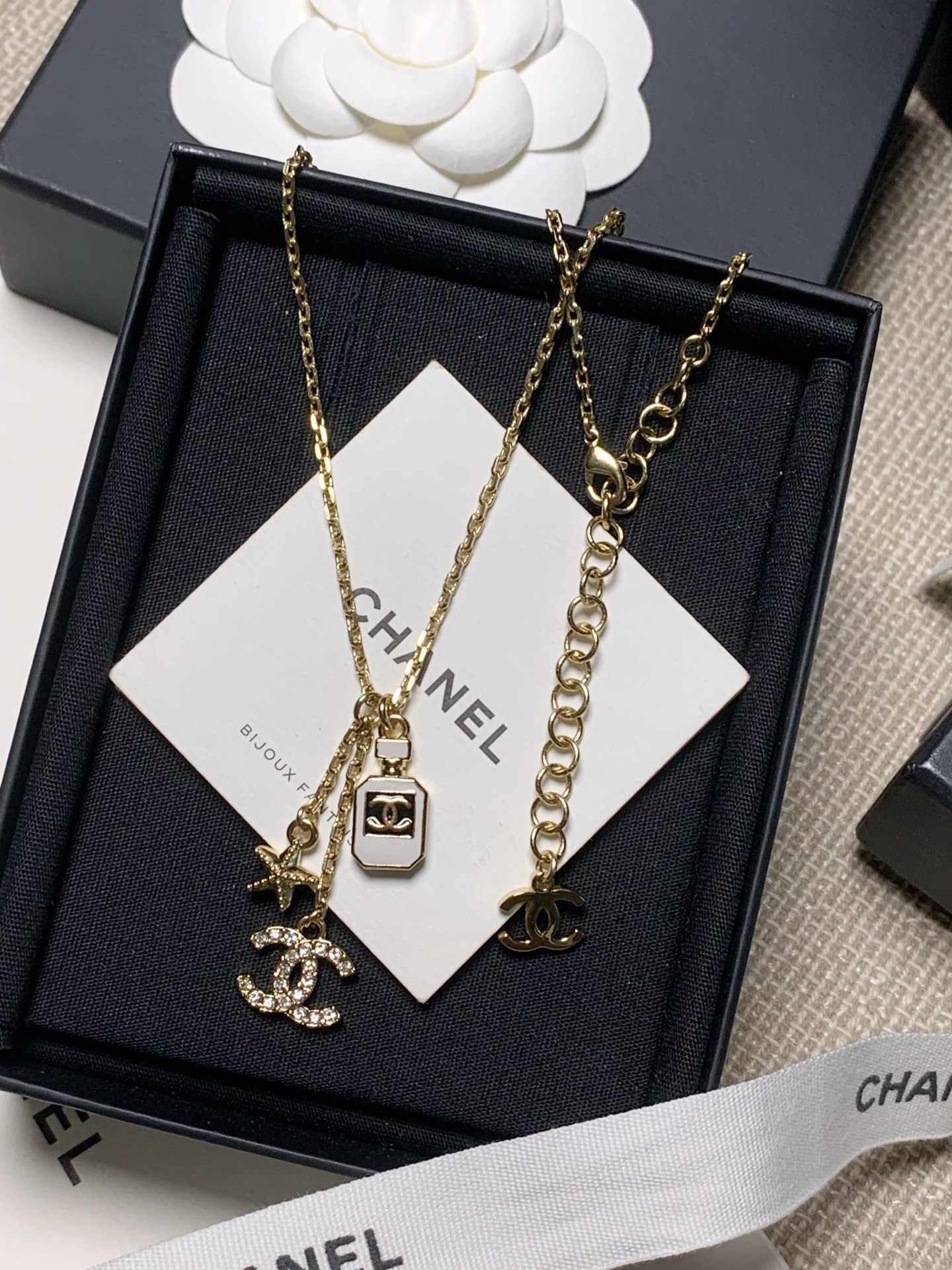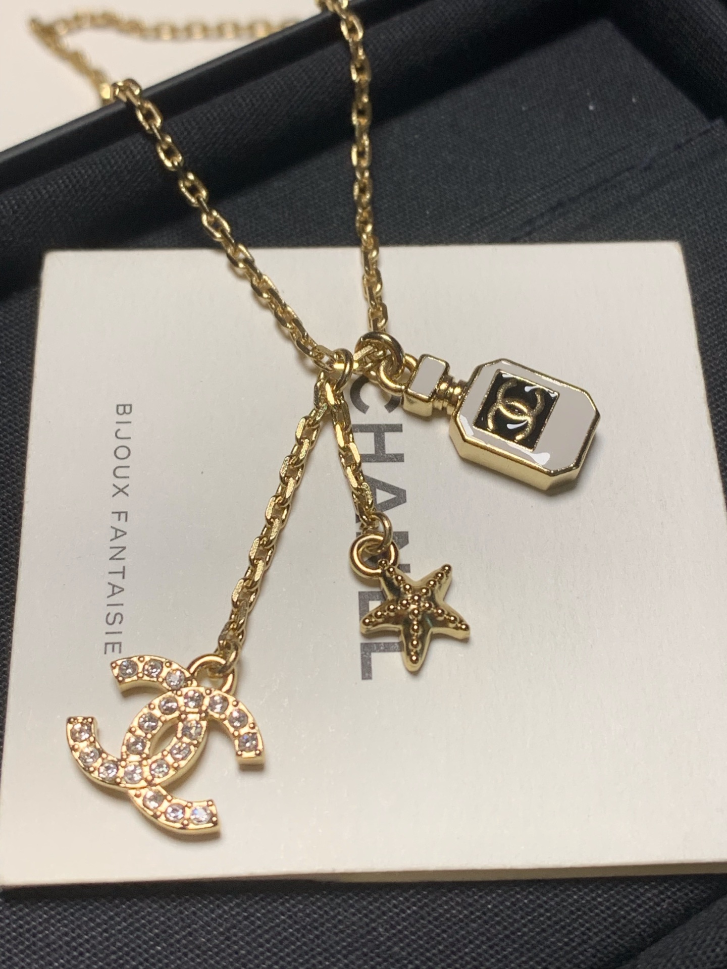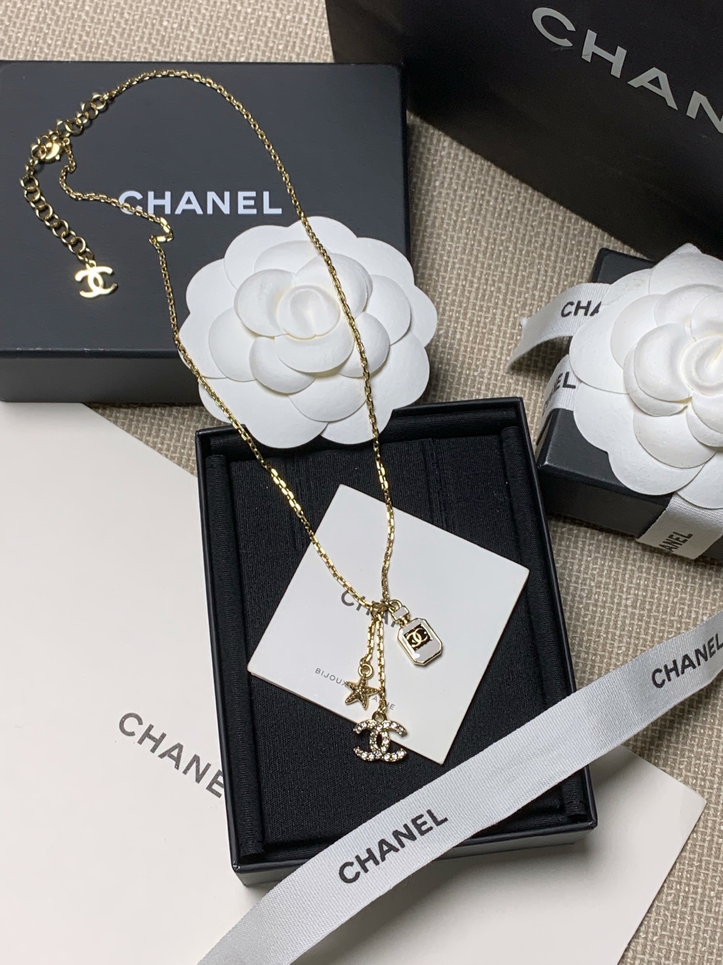 將小巧的海星、滿鑽雙 C 與迷你香水瓶結合在一起,營造出充滿層次感的視覺效果。