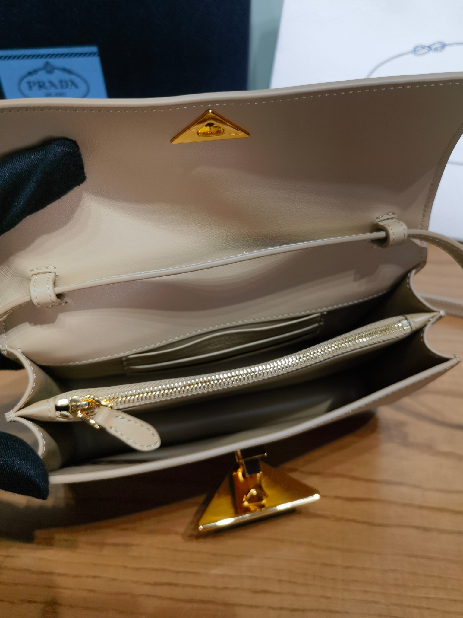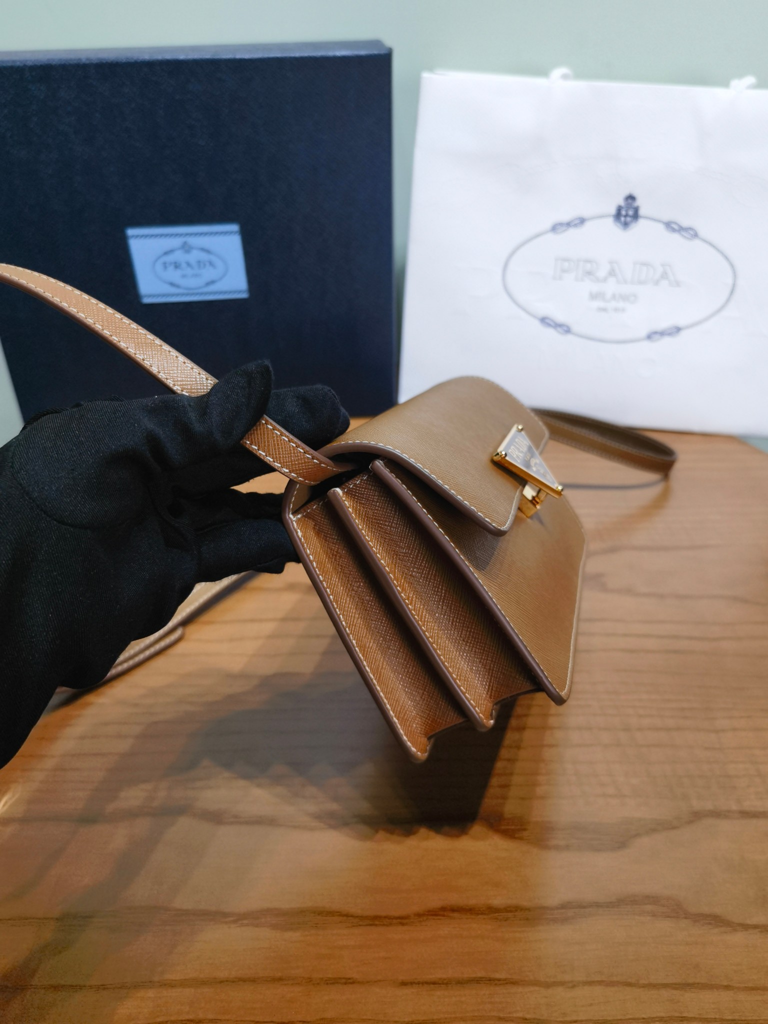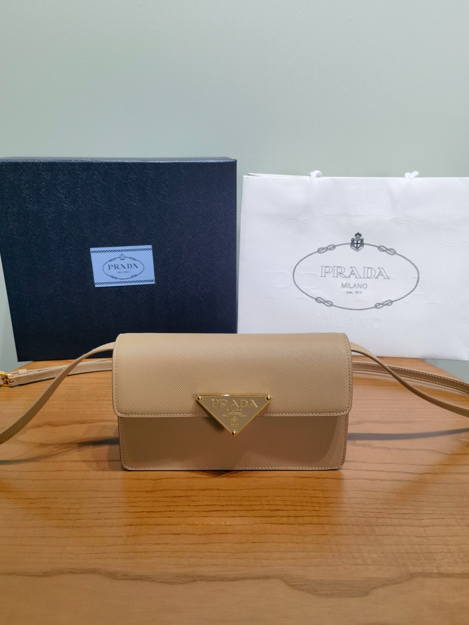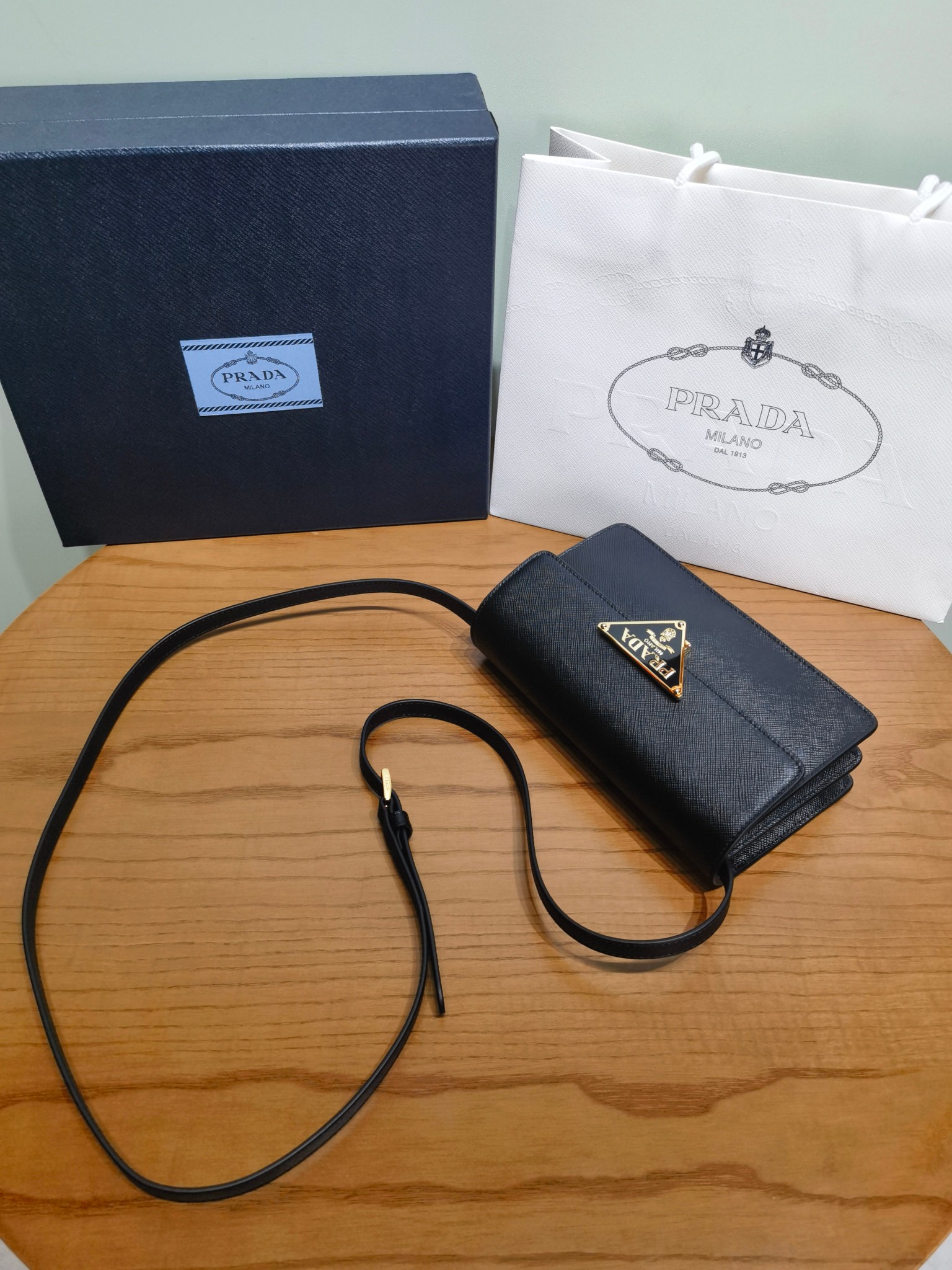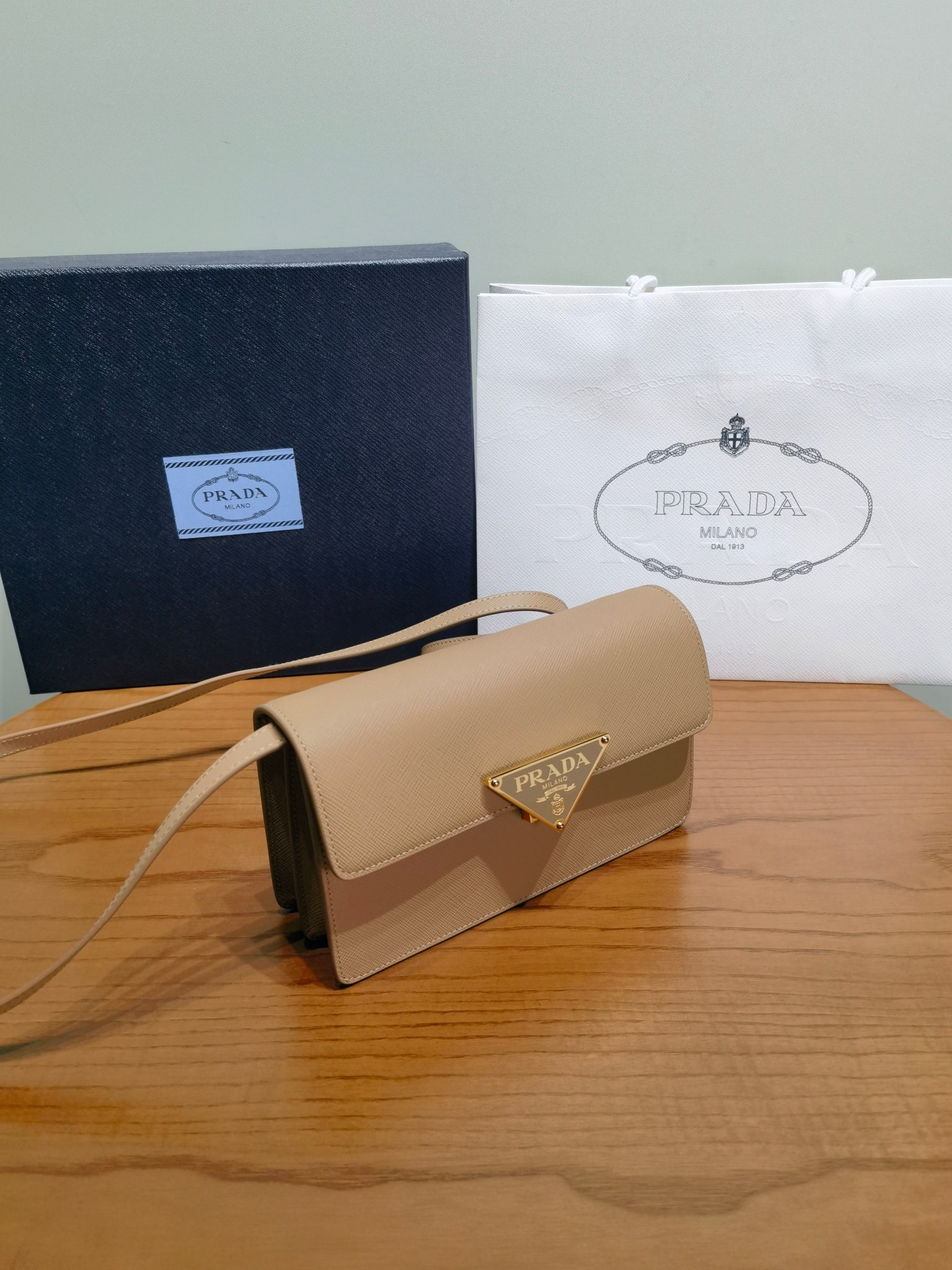 方正輪廓搭配品牌經典的三角形金屬標誌,低調又不失精緻感,一眼就能認出是P家的經典之作。