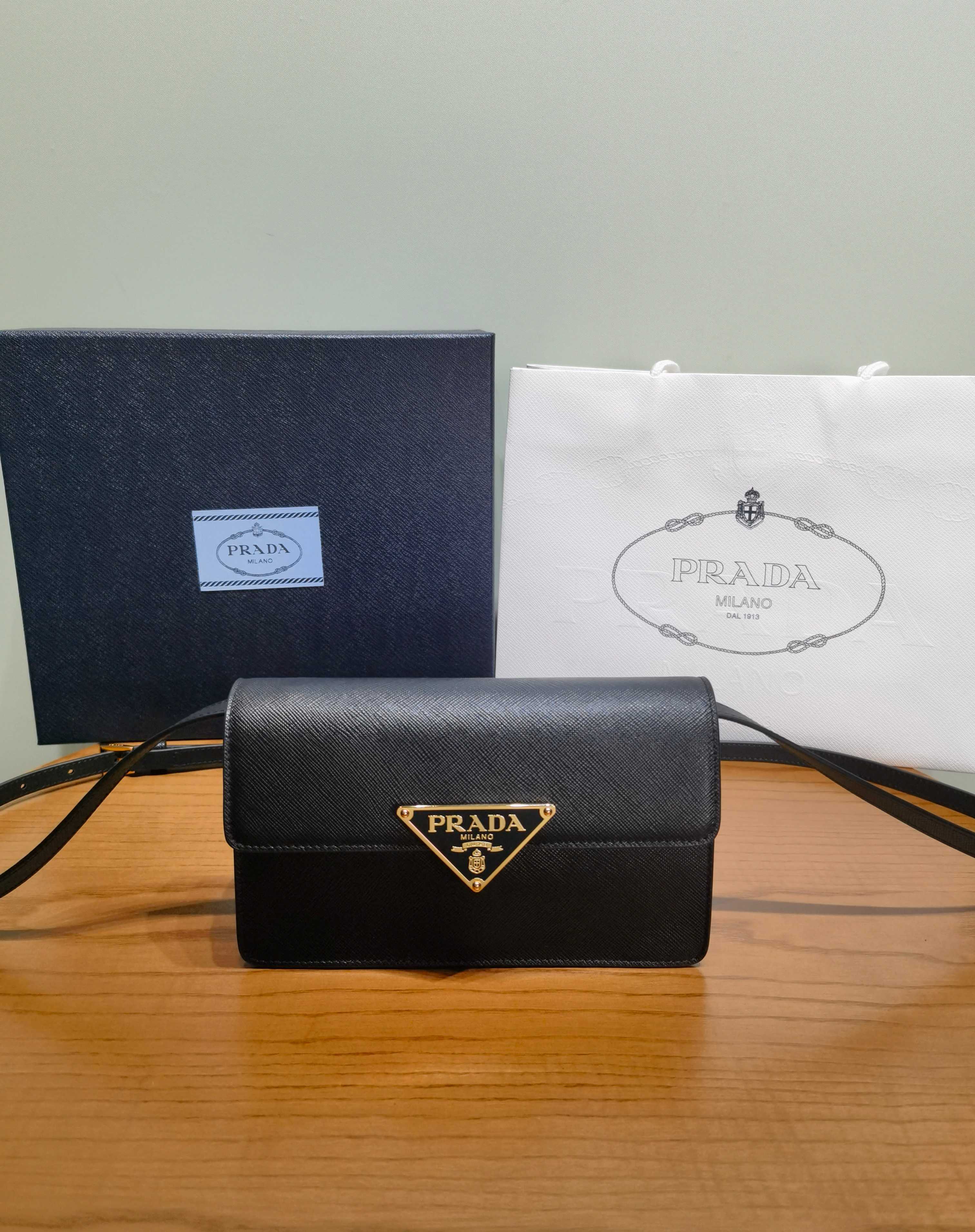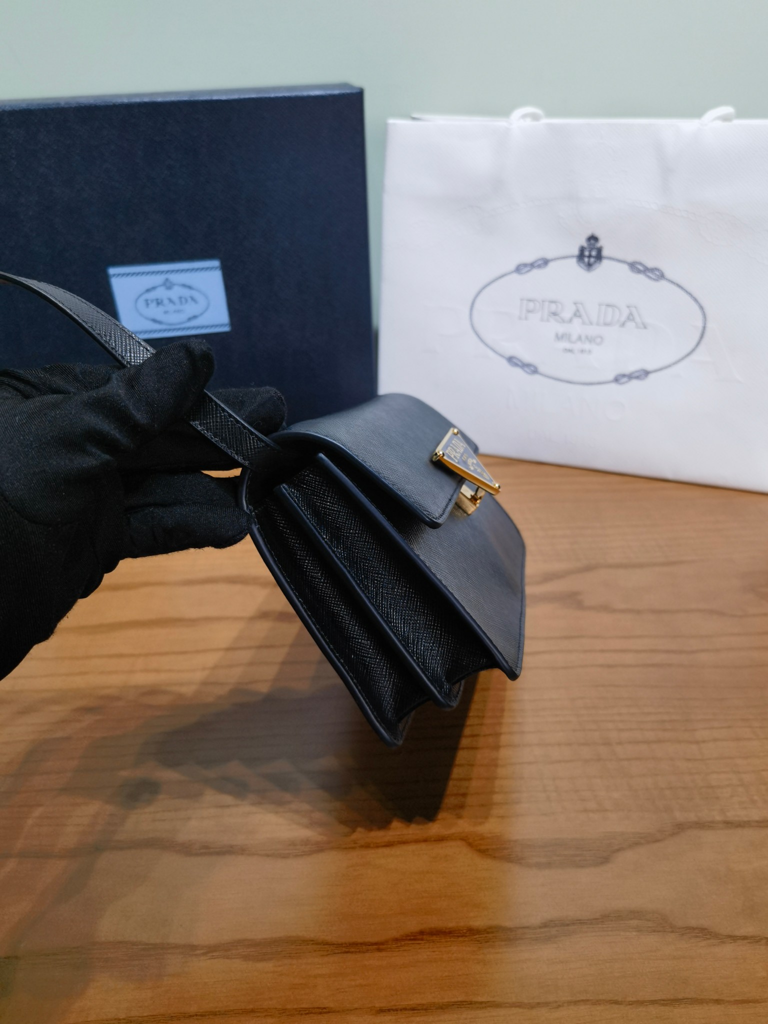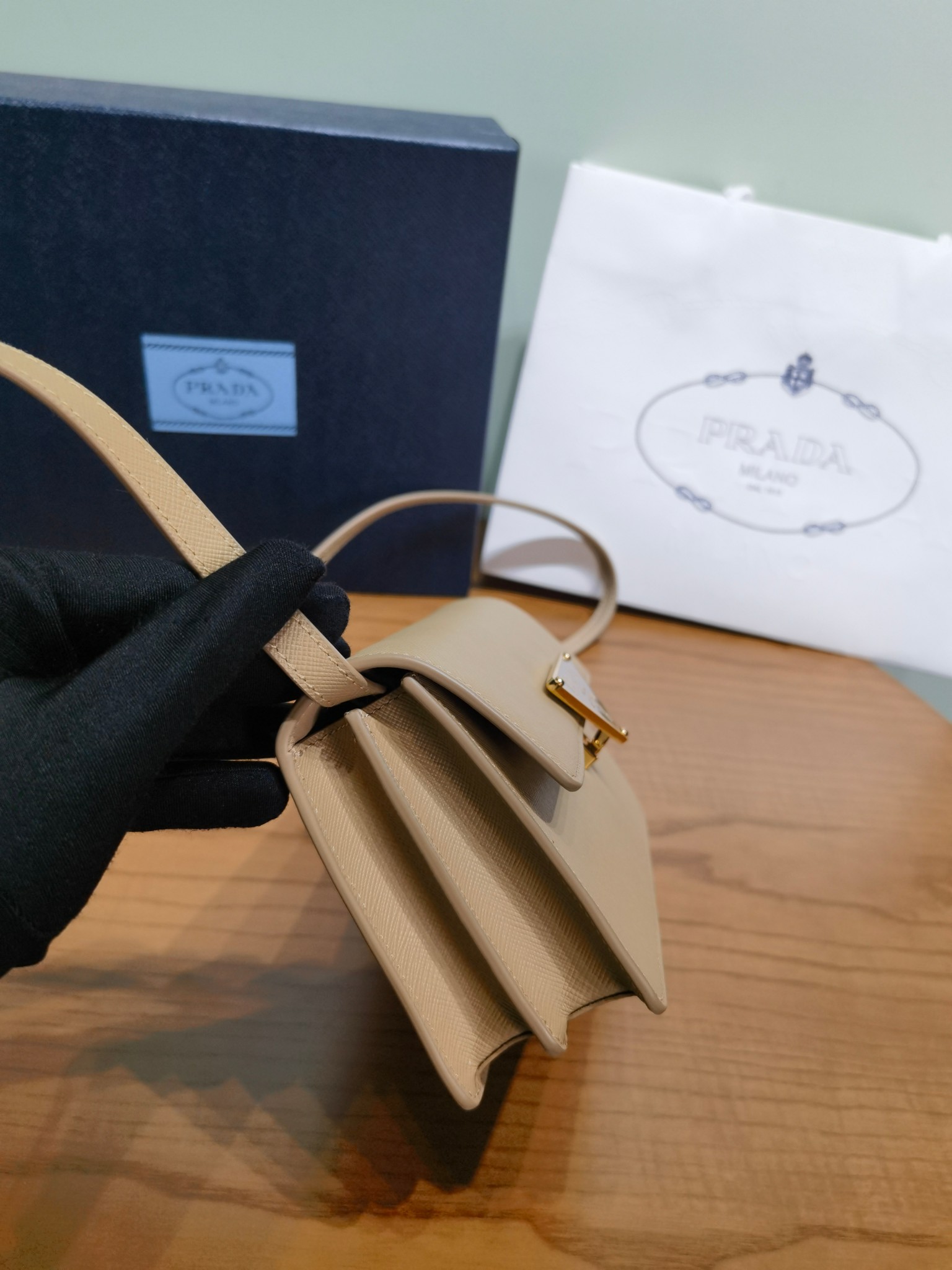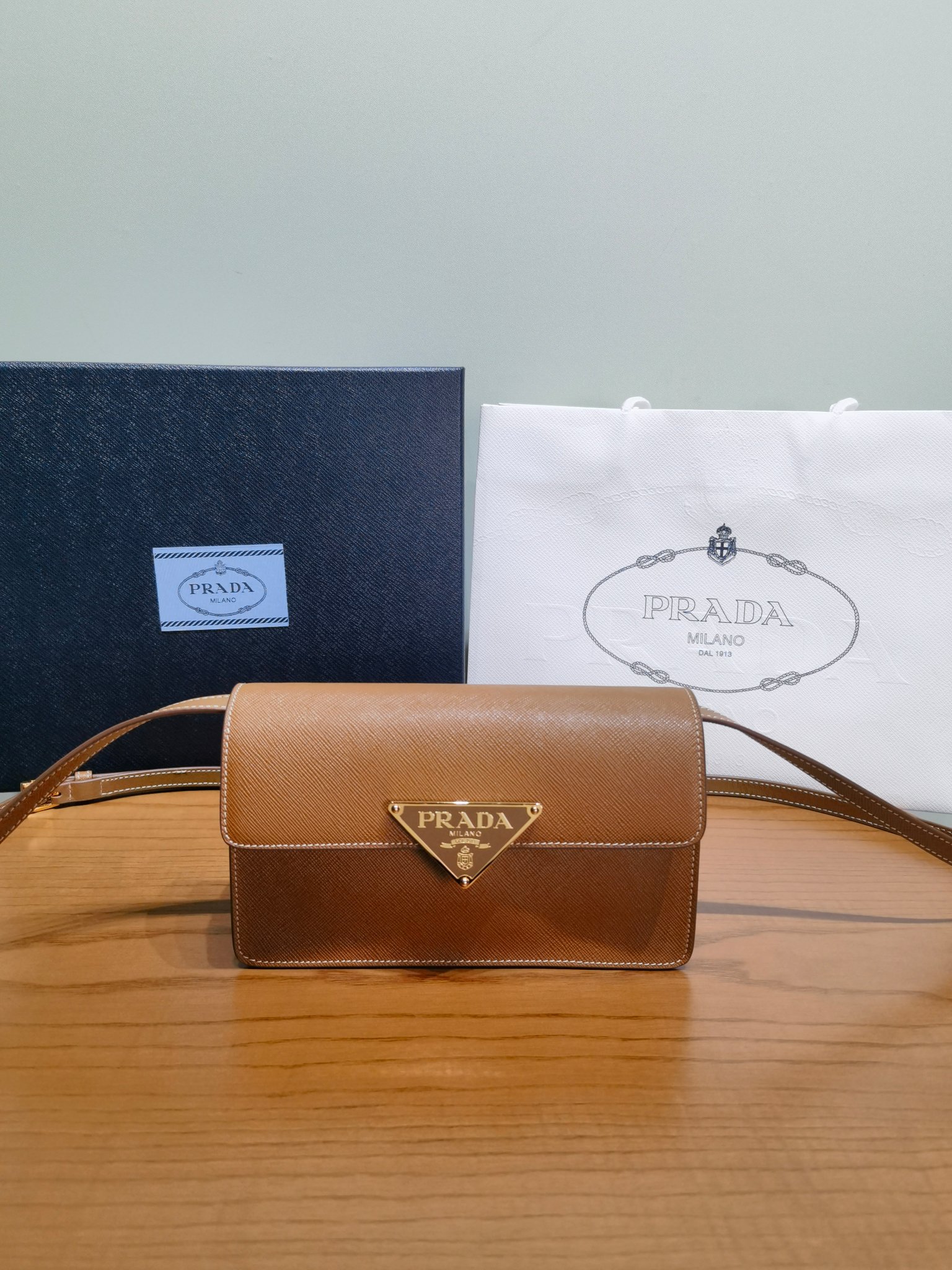 方正輪廓搭配品牌經典的三角形金屬標誌,低調又不失精緻感,一眼就能認出是P家的經典之作。