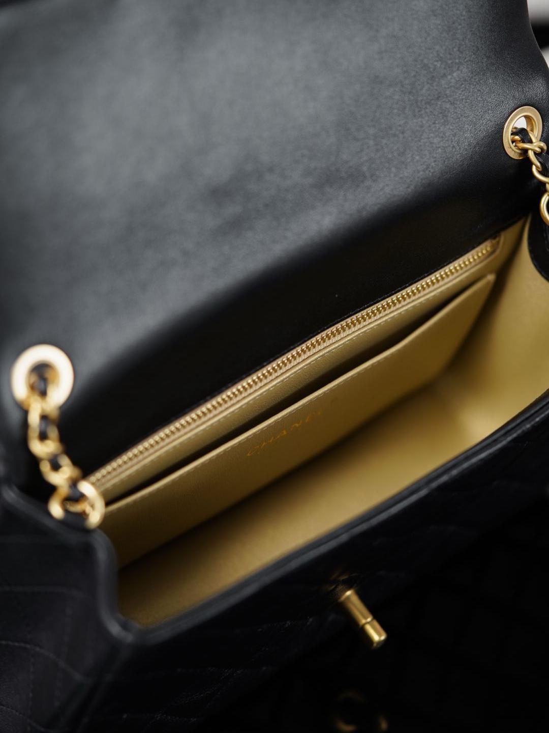 皮質表面滑順如棉花糖般細膩,摸起來有一種微微回彈的柔軟感。內襯為奢華金色全皮設計,金屬光澤與外層黑皮相互呼應,展現低調卻極致的高貴氣息。