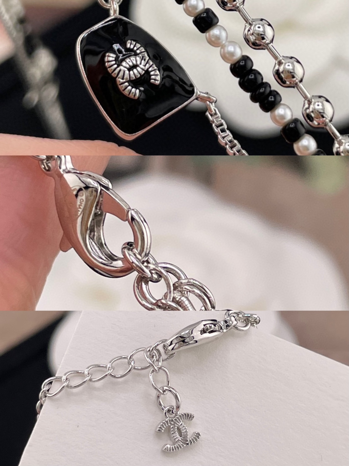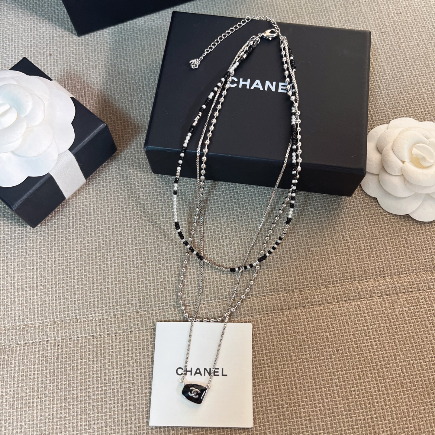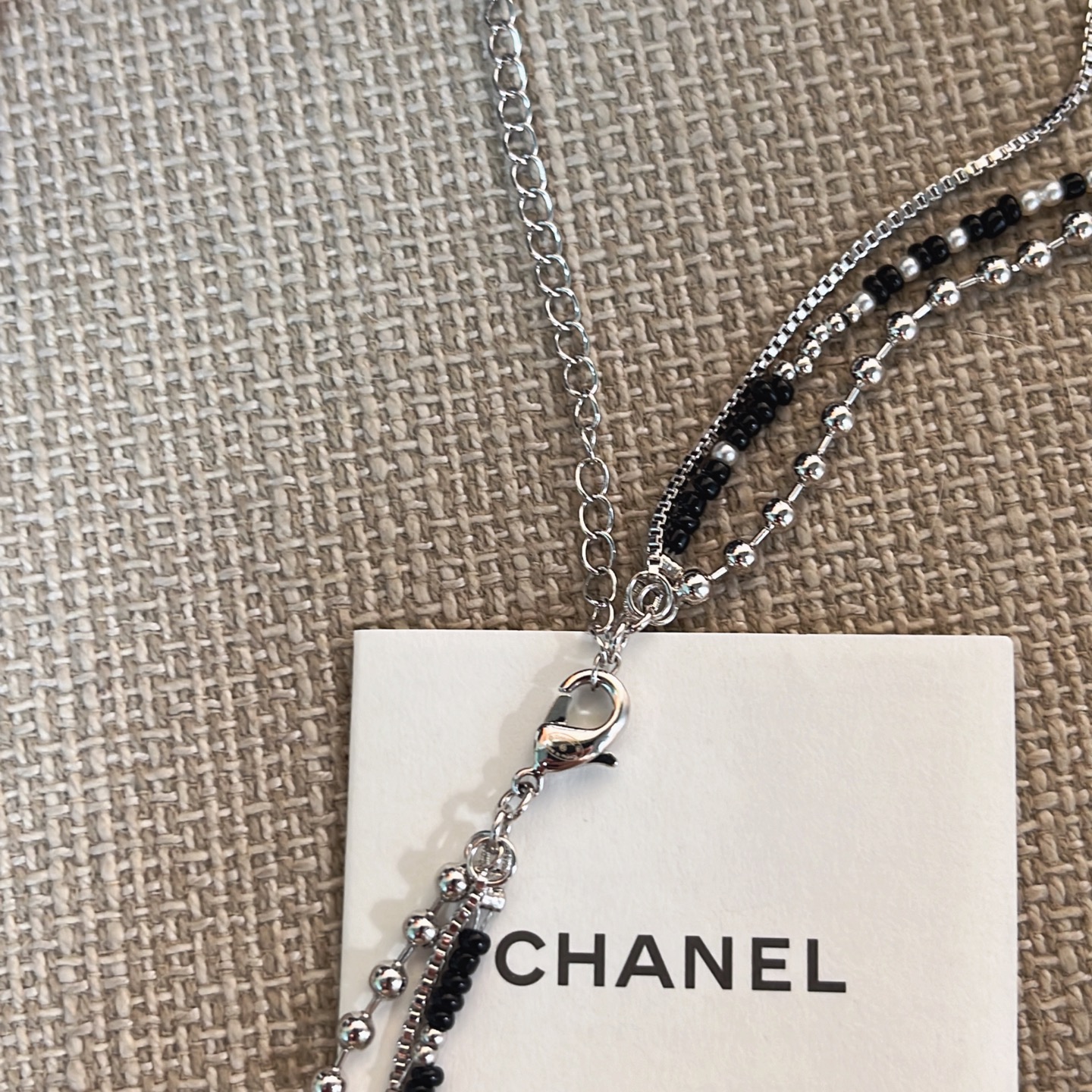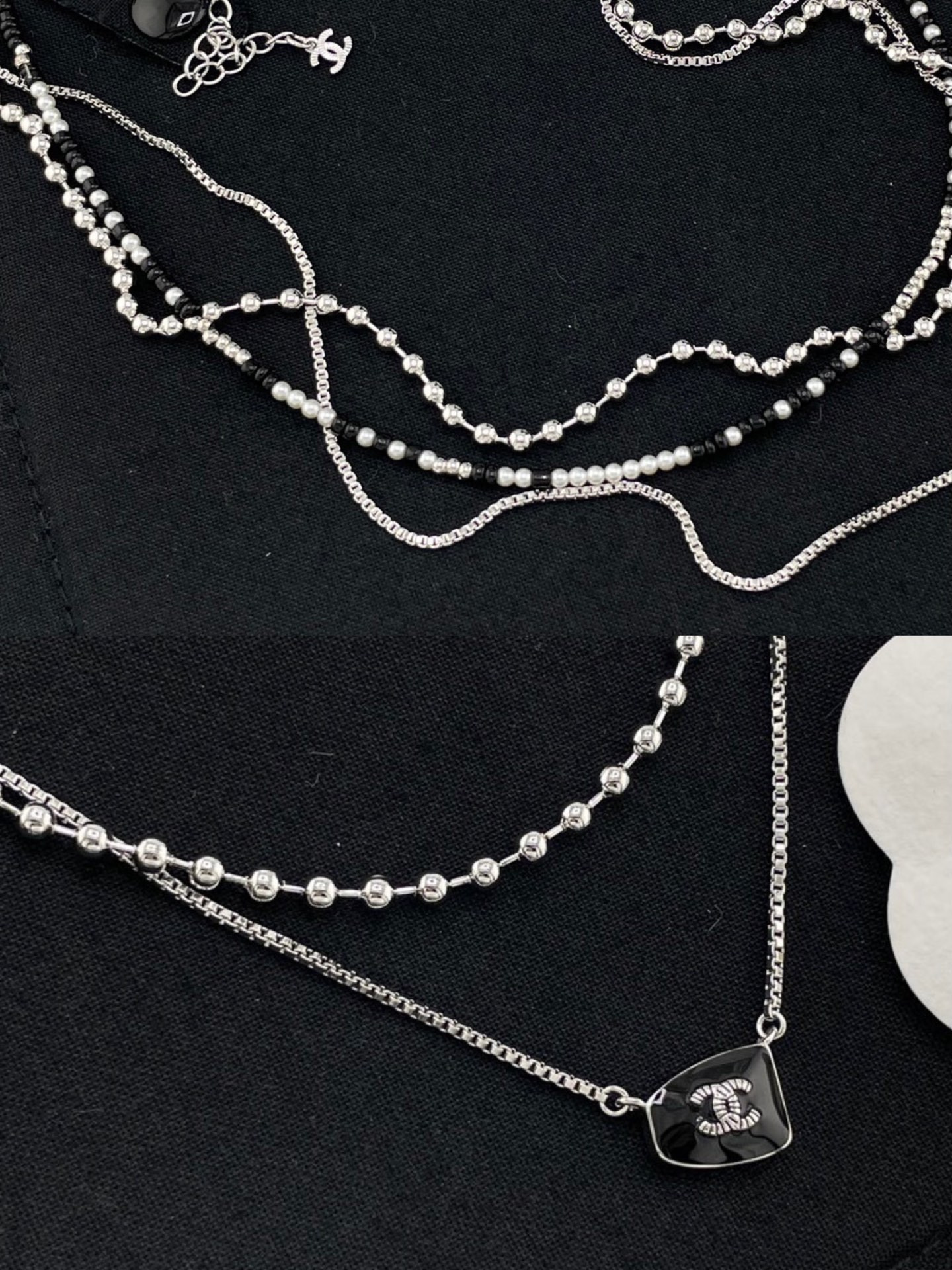 整體走的是簡約中帶設計感的路線,黑白配色經典又耐看,加上三層堆疊的層次感,讓鎖骨位置看起來更立體,也多了一點精緻的氛圍。