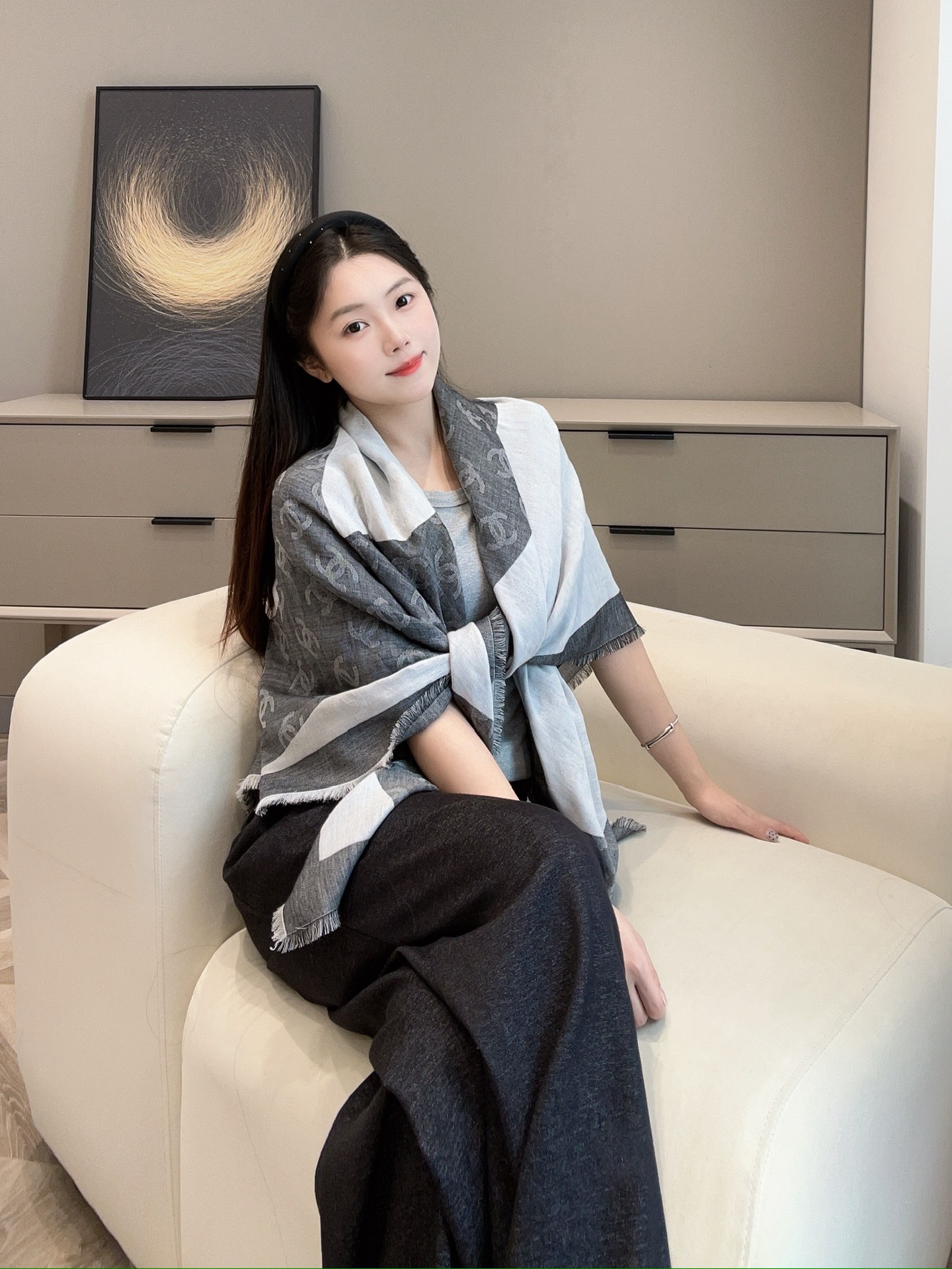 這條披肩真的美得太低調奢華!整體以灰白色調為主軸,乾淨又百搭,不論是冷冽冬日還是微風春秋,都能輕鬆融入日常穿搭中。