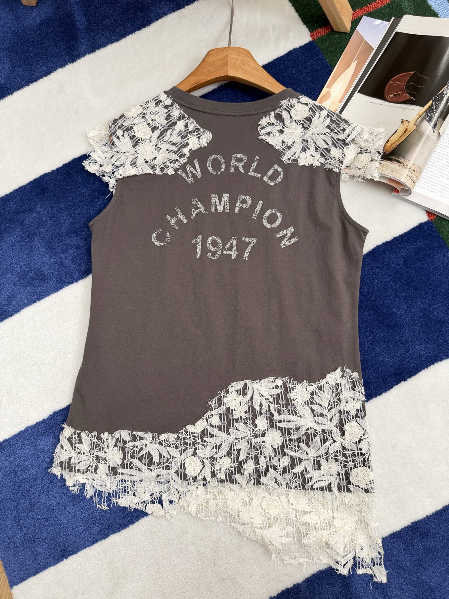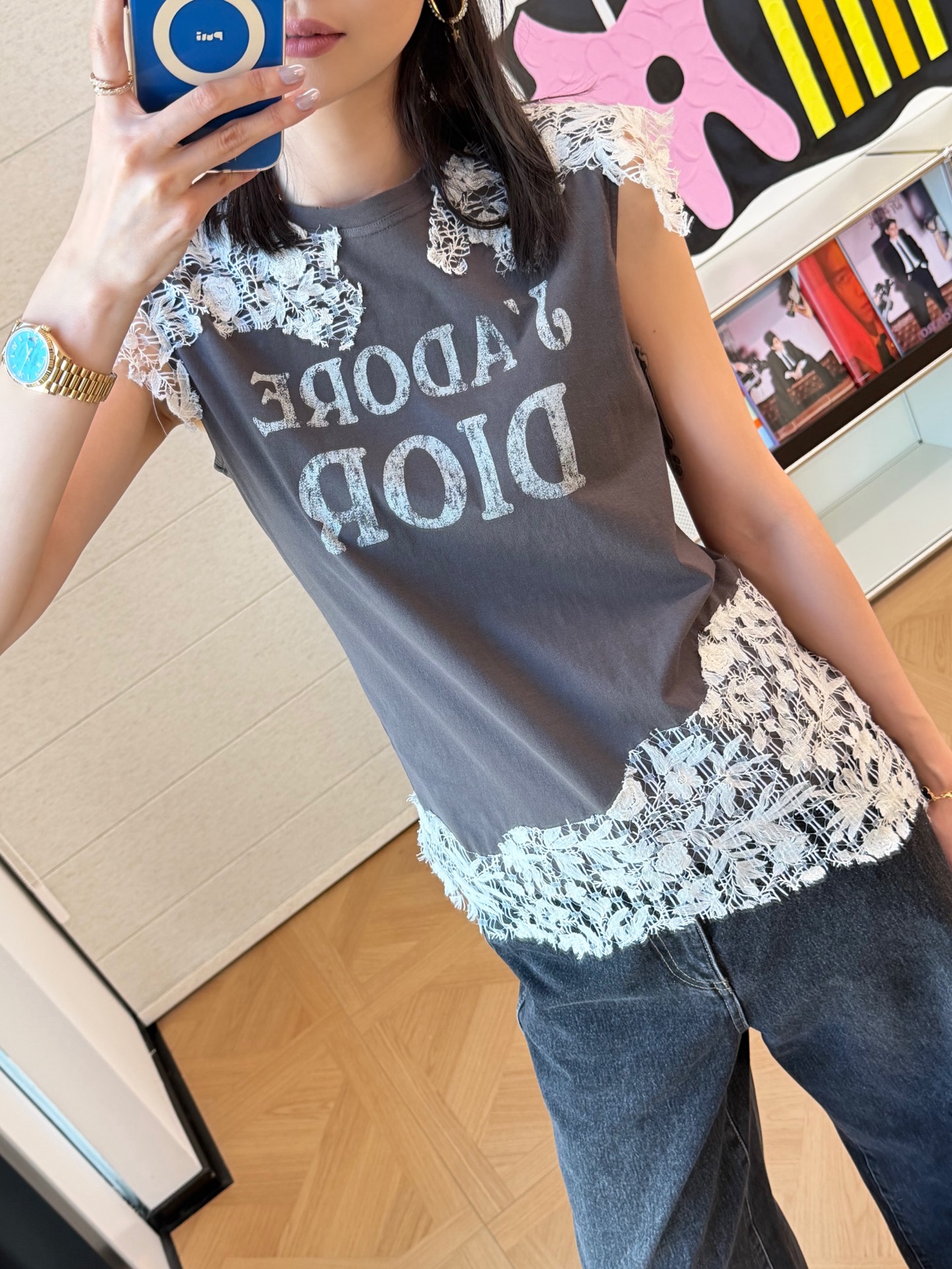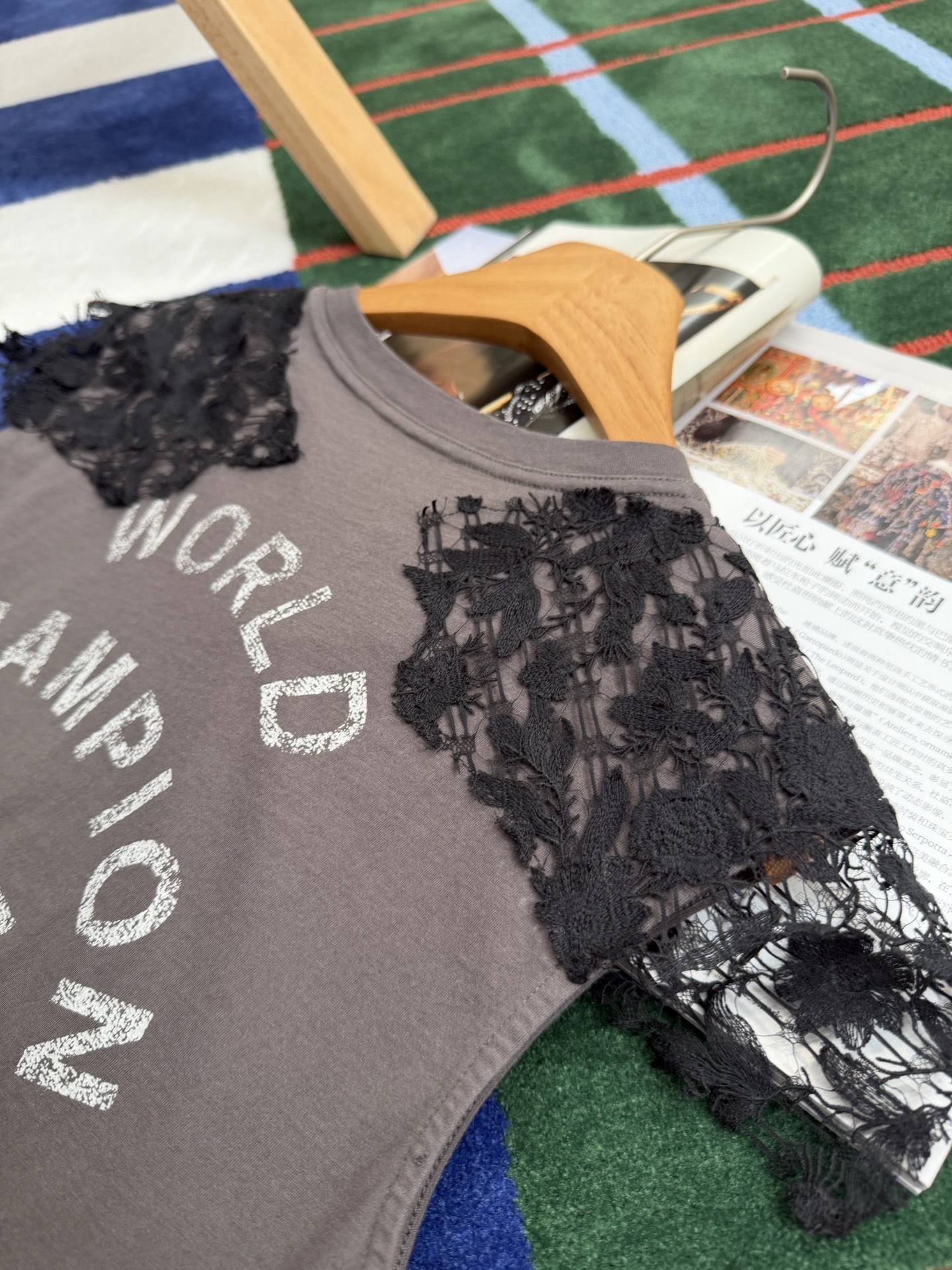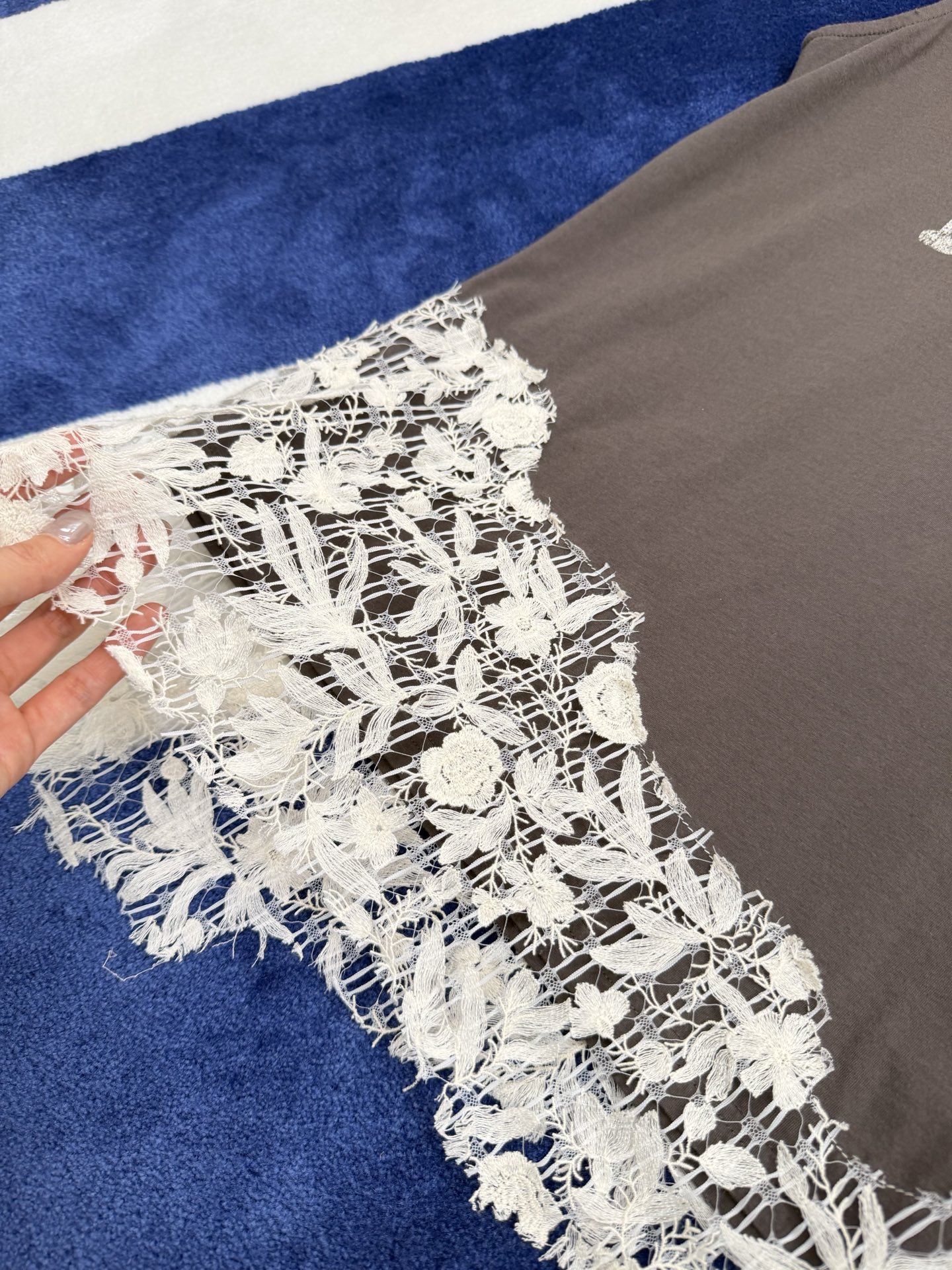 乍看是簡約的純棉短袖,但細看才會發現,整件的靈魂就在於那層層交織的蕾絲細節,把原本休閒的 T 恤,瞬間拉升到高級感滿滿的層次。