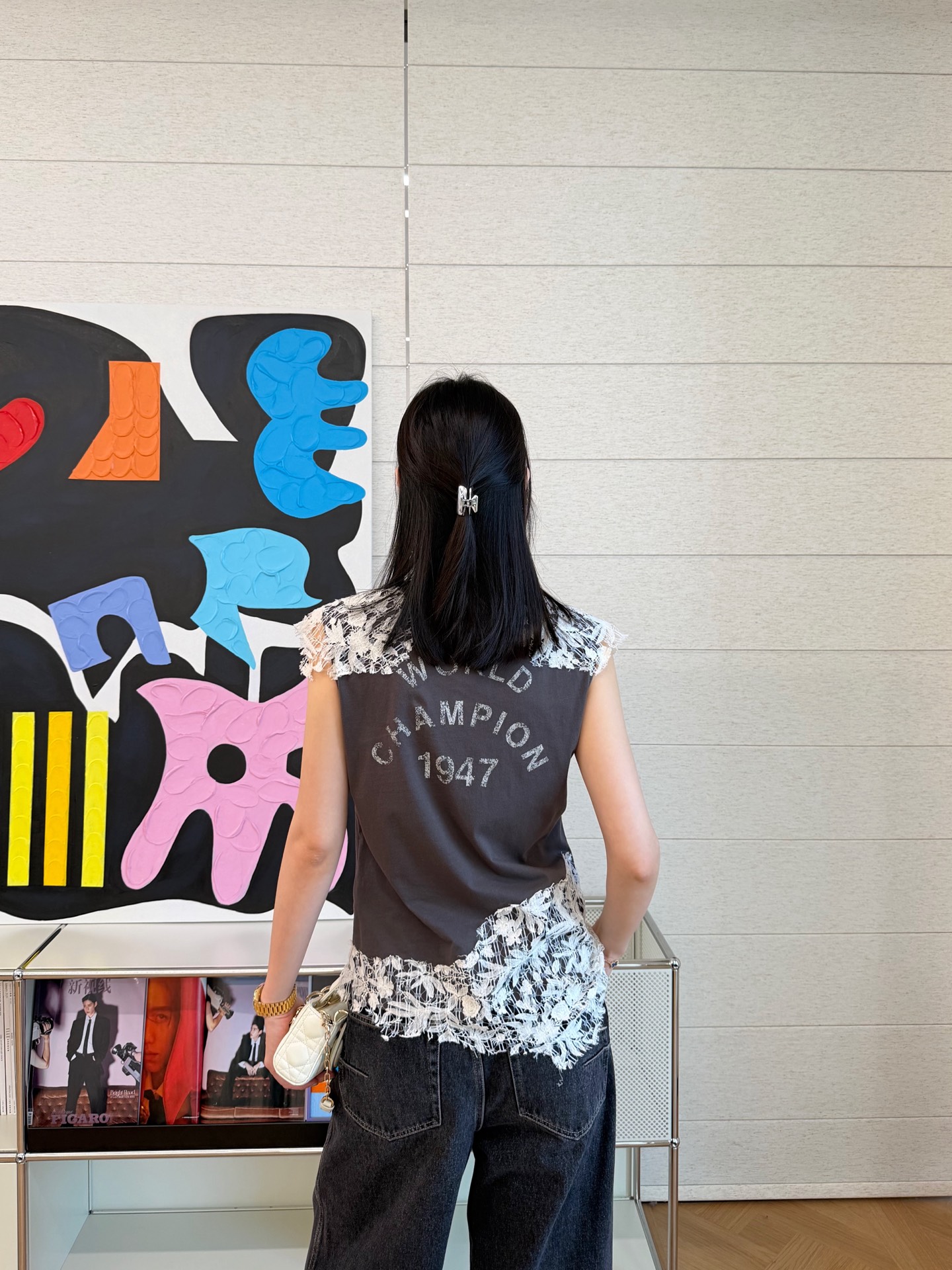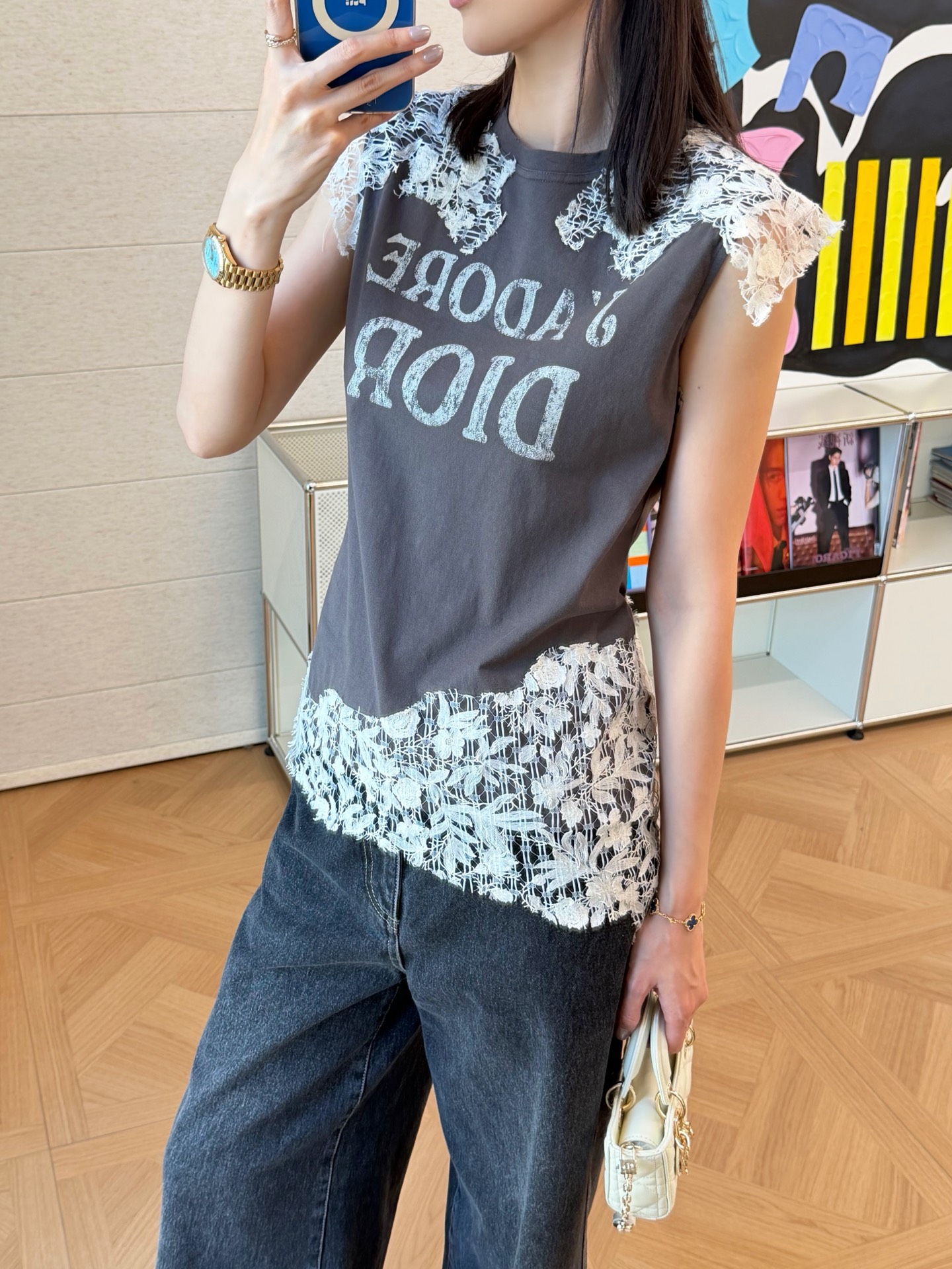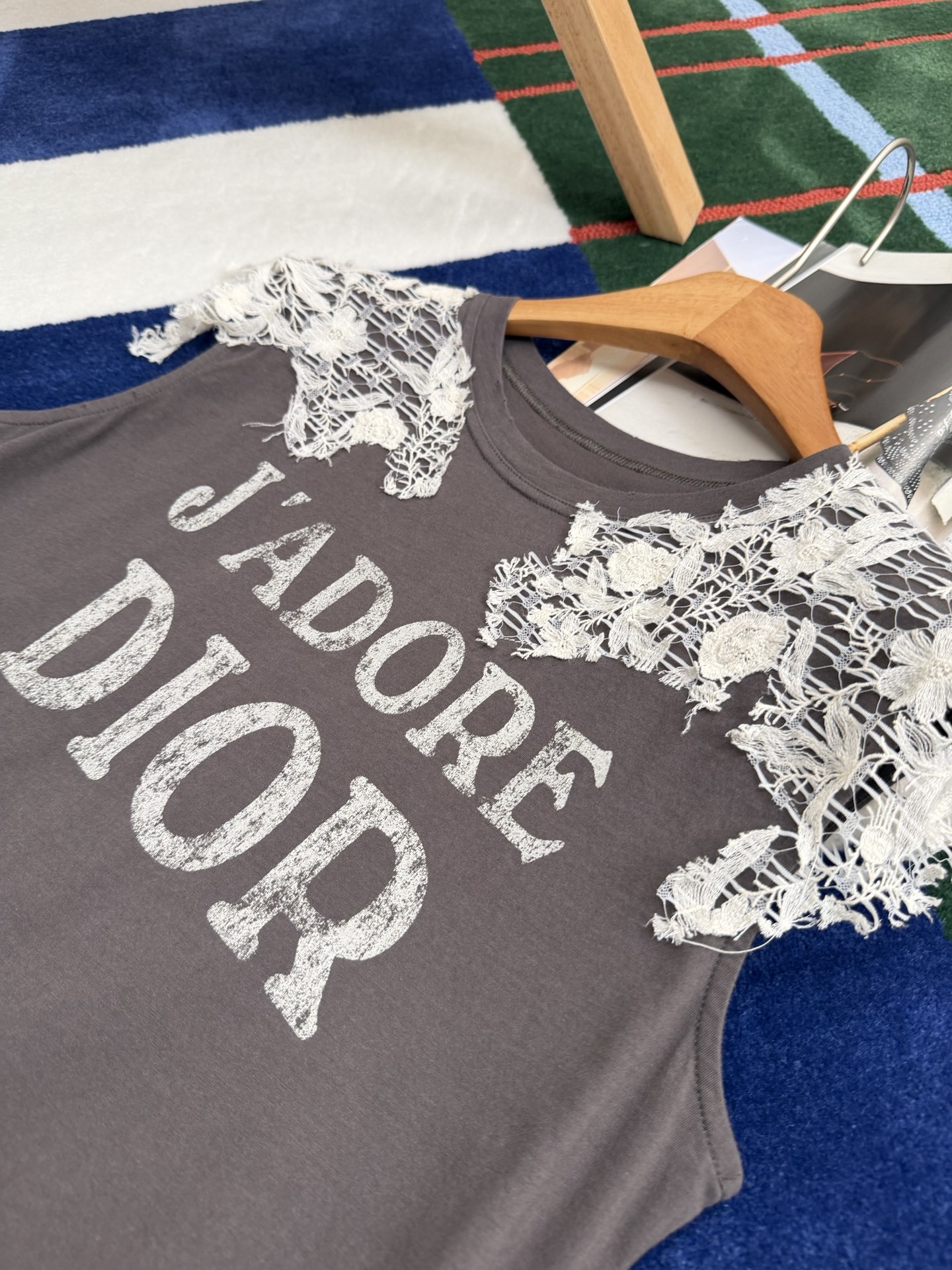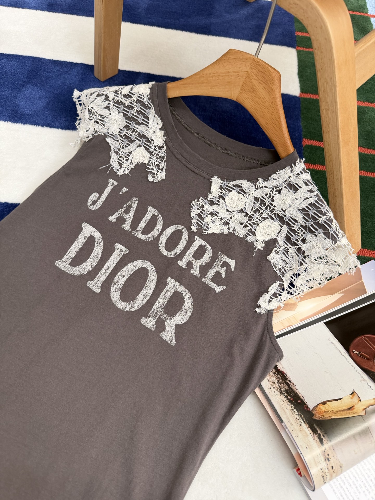 乍看是簡約的純棉短袖,但細看才會發現,整件的靈魂就在於那層層交織的蕾絲細節,把原本休閒的 T 恤,瞬間拉升到高級感滿滿的層次。