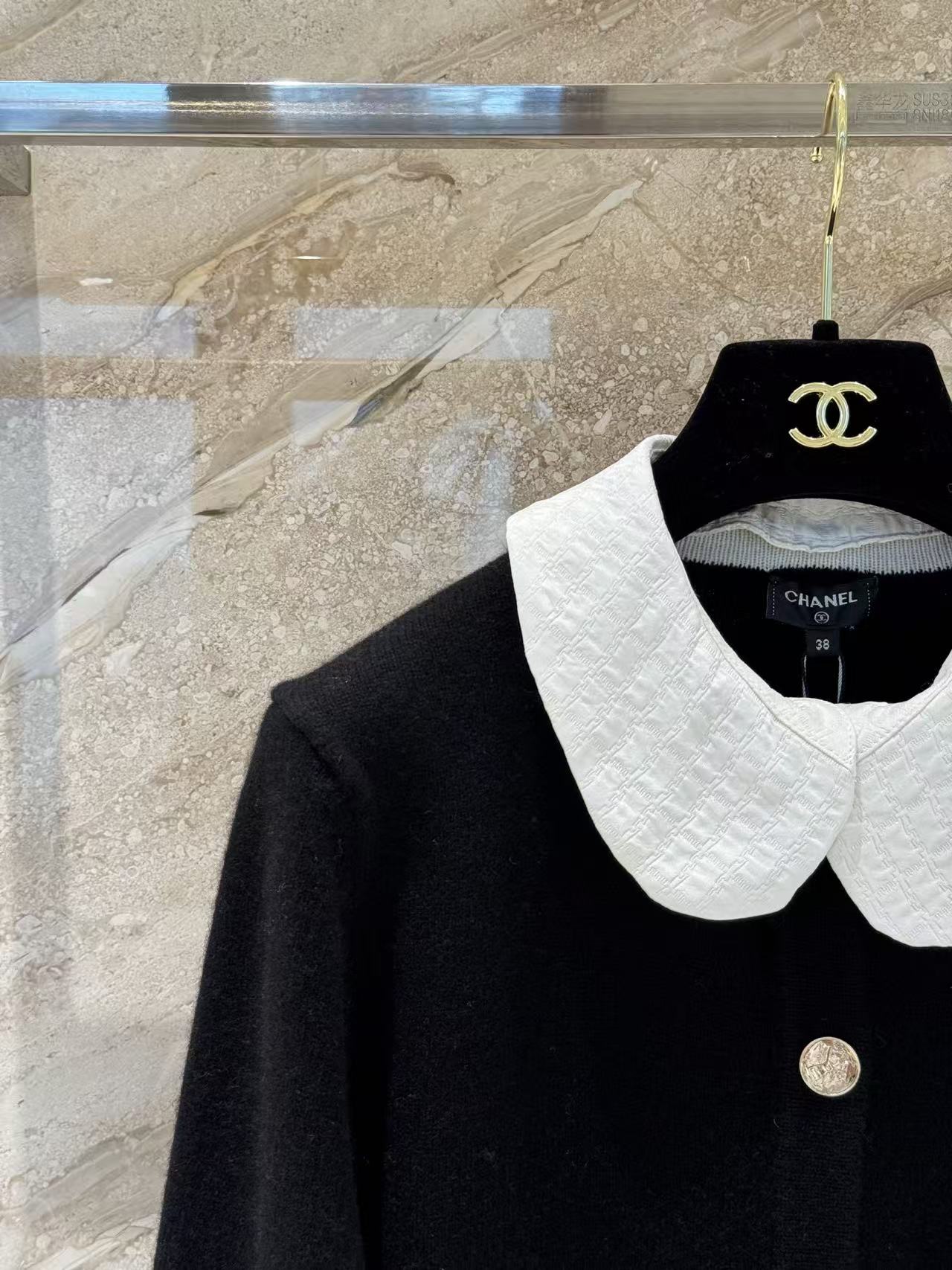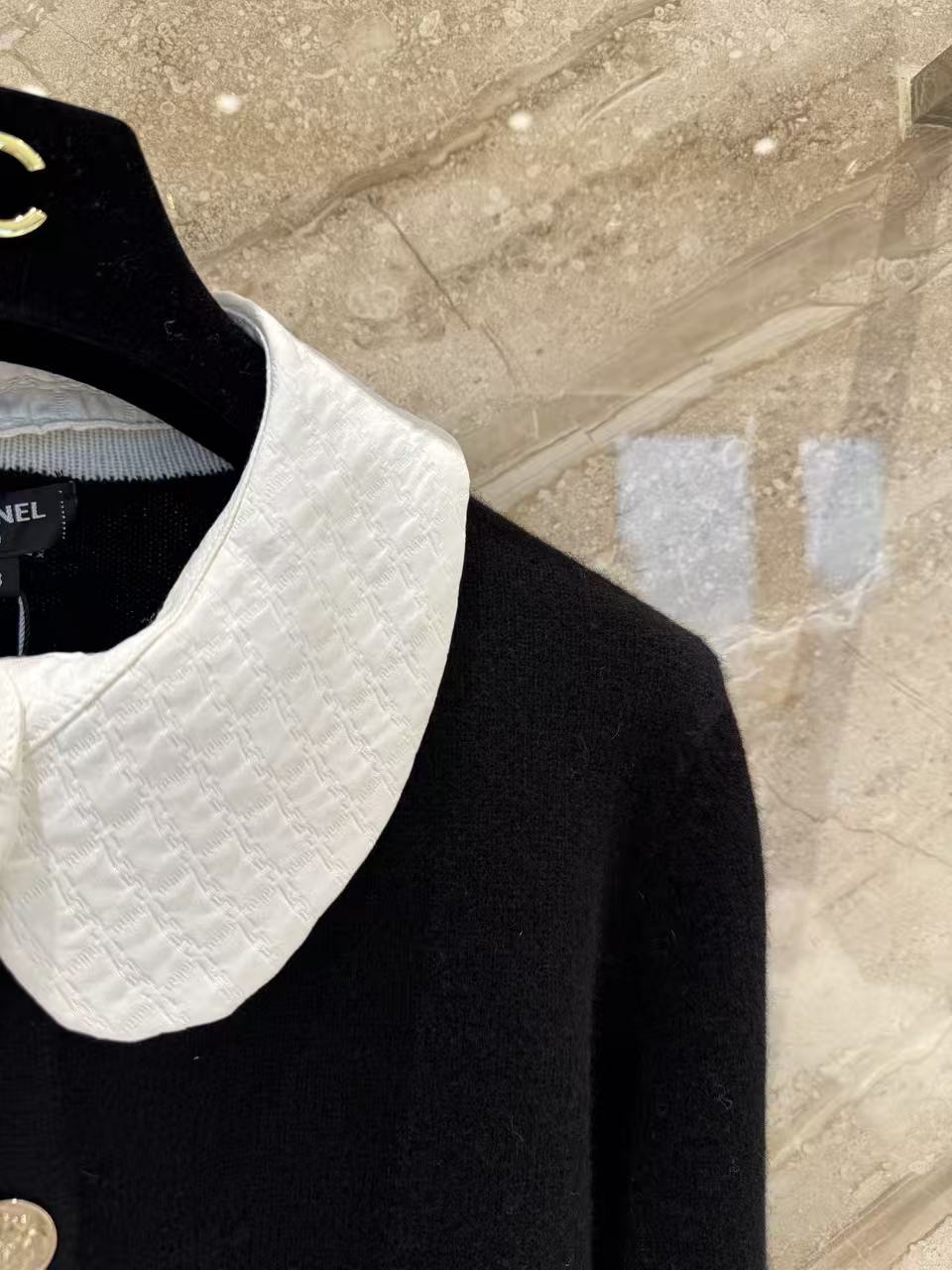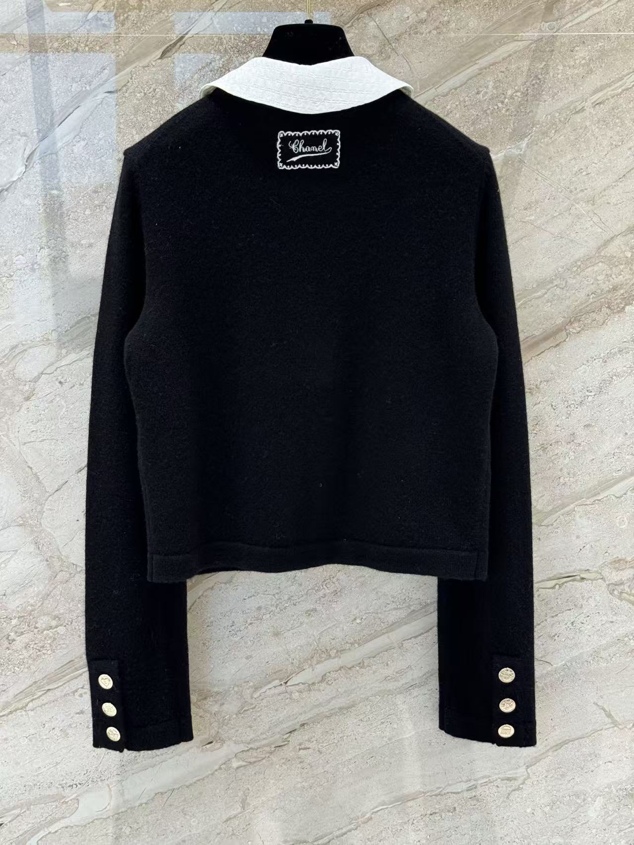 這款開衫最迷人的地方在於那片白色可拆卸娃娃領。裝上領子時,自帶一種法式學院風的減齡感;拆掉領子後,立刻切換成極簡大方的圓領開衫,風格變換隨心所欲。