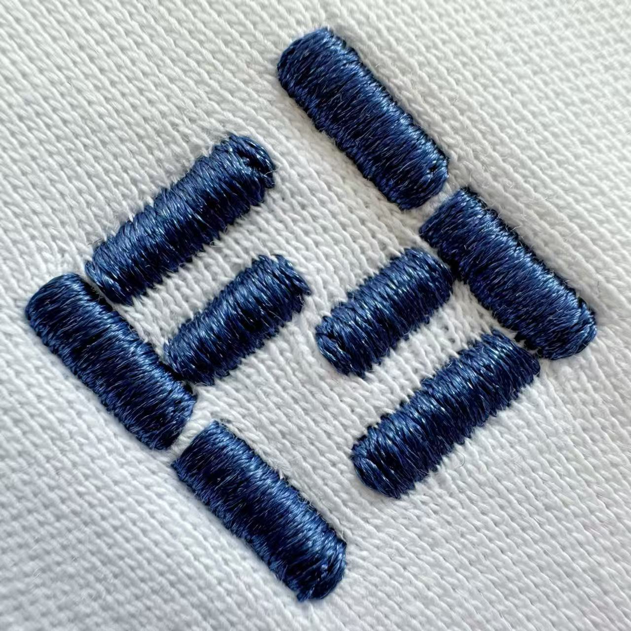 高密度平針填充工法: 運用平行排列的直線針腳進行圖騰覆蓋,營造出光滑平整且厚實的啞光繡面。