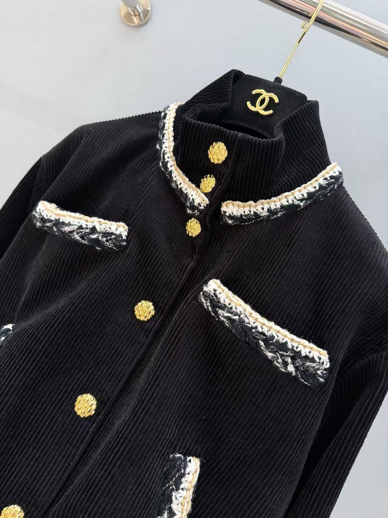 經典黑色燈芯絨底,帶著復古的慵懶霧面光澤,卻被那圈手工坊專屬「黑白金粗花呢滾邊」直接升華到天上!