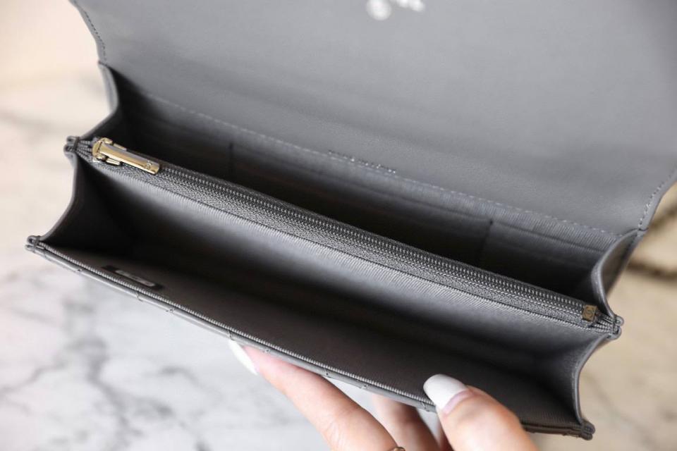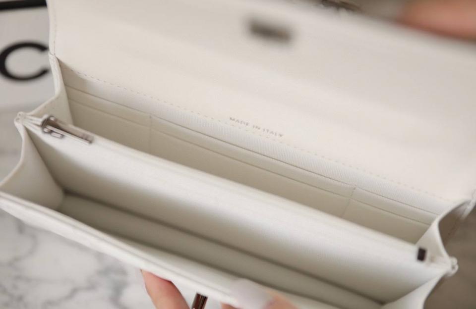 包包使用亮面小牛皮加上黑銀五金鑲嵌鑽石小手提,為這款小風琴增添了優雅的高級亮點,內部多層設計拉鍊口袋與卡槽,顏值高實用率也高!